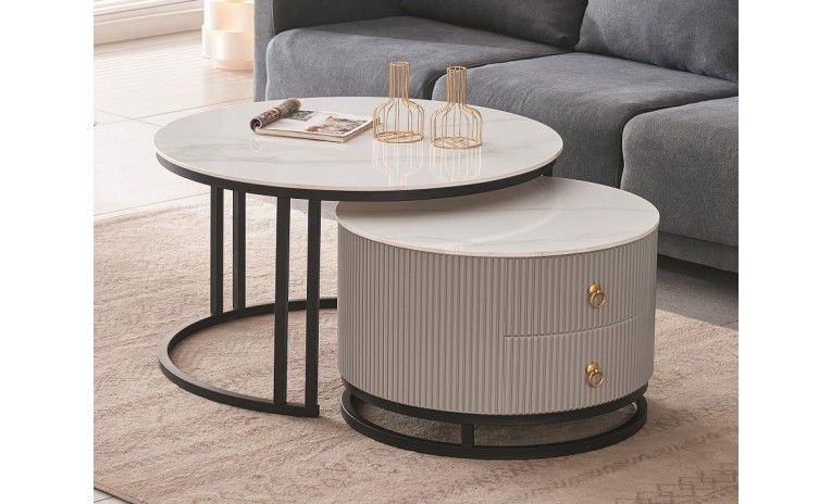 طقم طاولة قهوة #LCT950(1+1)، سطح مستدير من الحجر الملبد/مع درج/إطار فولاذي، اللون: إطار أسود