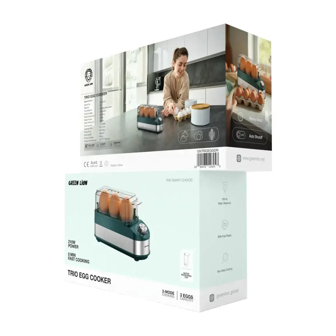 The Green Lion Trio Egg Cooker is designed to be a compact and efficient egg cooker for your kitchen. It is made of durable, BPA-free PC plastic, so you can be assured of safe and healthy cooking. The non-stick PP and stainless-steel tray permit simple cooking of 1-3 eggs. With the 100mL of the water reservoir and the included water measuring cup, achieving soft, medium, or hard-boiled eggs is a breeze. You can set the timer rotary knob for cooking between 8-15 minutes; the auto shutoff feature thereafter guarantees your safety and avoids overcooking. It operates with a power of 210W, a rated voltage of 220-240V, and a frequency of 50-60 Hz, making this egg cooker energy-efficient and reliable. The 900cm cord with a UK plug gives extra flexibility in place. The Green Lion Trio Egg Cooker is compact, user-friendly, easy to clean, and equipment for all egg lovers.
