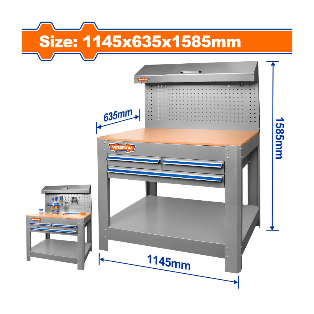 طاولة عمل فولاذية من WADFOW مع لوح مثقوب، 1145 × 635 × 1585 مم، 3 أدراج، منزلقات محامل كروية