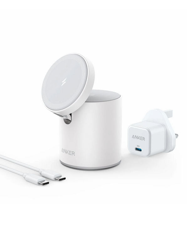 شاحن لاسلكي مغناطيسي Anker 623 MagGo 2 في 1 مع شحن PD، أبيض