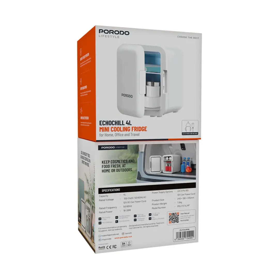 The Porodo Lifestyle Echochill 4L Mini Cooling Fridge offers an excellent variety of cooling options compact enough to place at home, in-office, or even to take along for travel. It is small enough to fit your drinks or snacks or skincare products. Thus, it keeps the items cool while traveling. Be it your home, office, or enroute road trip, this little fridge stays very reliable on cooling power and operates with energy efficiency to let you cool down your stuff to that perfect temperature. And when it comes to the noise, this one is whisper-quiet and goes perfect with any environment without disturbing your space. Quick chilling means it powers through the job, while appearance speaks of elegance speaking good design across any area. To offer more convenience and flexibility in various fields, it comes with numerous power supply options, which include a UK 3-pin BS plug and a 12V car power cord. Keep cool and refreshed with this on-the-go solution to cooling: Porodo Lifestyle Echochill Mini Cooling Fridge.
