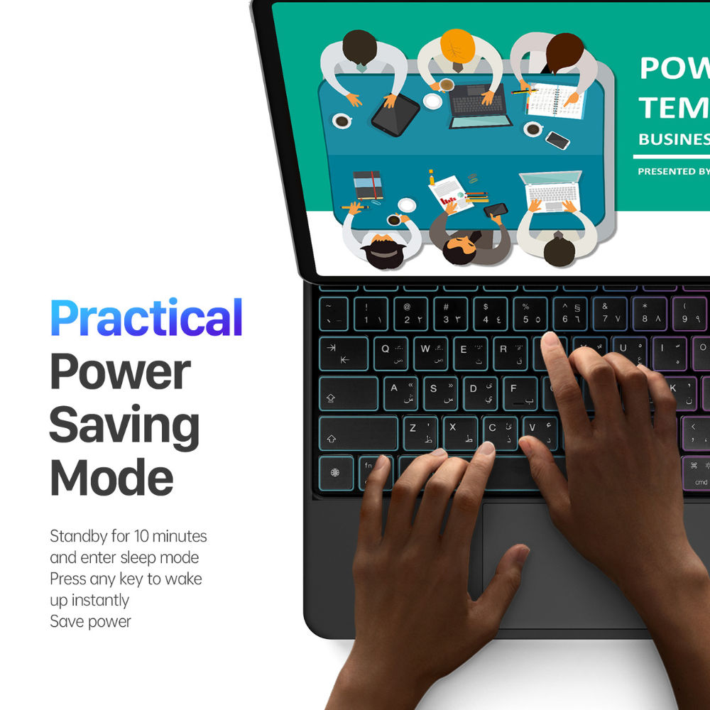 حوّل جهاز iPad إلى جهاز إنتاجي قوي مع غطاء لوحة المفاتيح Infinyty MK-02 Series باللون الأسود الأنيق. صُممت هذه الحافظة المزودة بلوحة مفاتيح خصيصًا لأجهزة iPad Air 13 (2024) وiPad Pro 12.9 (2018، 2020، 2021، 2022)، وتوفر تجربة كتابة تشبه الكمبيوتر المحمول مع مفاتيح ثنائية اللغة (العربية والإنجليزية) — وهي مثالية للمستخدمين ثنائيي اللغة والطلاب والمهنيين والمبدعين. تتميز بحامل مغناطيسي عائم مريح، ومفاتيح بإضاءة خلفية، ولوحة تتبع متعددة اللمس تدعم إيماءات iPadOS، مما يمنحك تحكمًا محسّنًا وراحة أكبر للكتابة والتحرير والتصفح والعروض التقديمية. تتصل لوحة المفاتيح بسهولة عبر Bluetooth 5.2 لإقران فوري وأداء موثوق، بينما تدعم بطاريتها المدمجة القابلة لإعادة الشحن ساعات طويلة من الكتابة — مما يجعلها مثالية للعمل والترفيه.