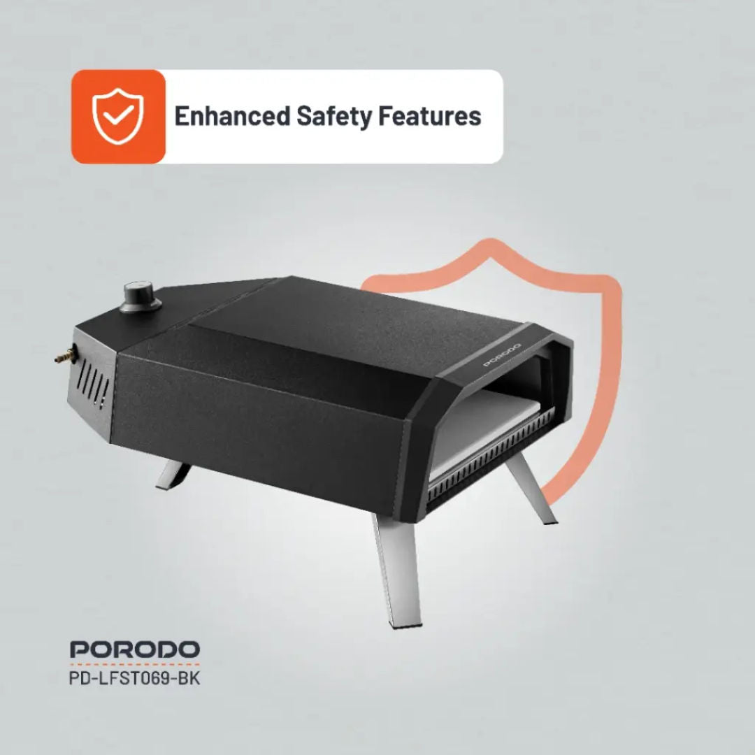 The Porodo Lifestyle 12" Pizza Outdoor Oven has a beautiful black color and is an ideal integration for any outdoor kitchen. It gives you an experience for making pizza to that similar quality as in any restaurant. The furnace is constructed of stainless steel, and this is done in such a way to ensure high durability. The stone plate maintains the entire area of heat flow uniformly, too, to make it easier in cooking. The oven is convenient for 12" pizzas and has a cooking area measuring 33 × 30.5 cm, most suited for family gatherings or small parties. Pies can be cooked with LPG, butane, or propane, all at a gas pressure of 29mbar and a consumption of 297g/h, giving you a powerful output of 4.1kW. It would take a maximum temperature of 500° C in as little as 30 to 45 minutes of preheating to cook as quickly as seen in professional kitchens. The easy and reliable ignition is made with the piezo ignition, and the heat control dial provides perfect temperature control for the best results. For convenience, the oven comes with a stone plate, a pizza peel, a pizza cutter, a 1.5m hose, and propane and butane adapters. The Porodo Lifestyle Pizza Oven features foldable legs for storage and security, along with extreme safety. It is an ideal product for outdoor pizza lovers: efficient but portable.