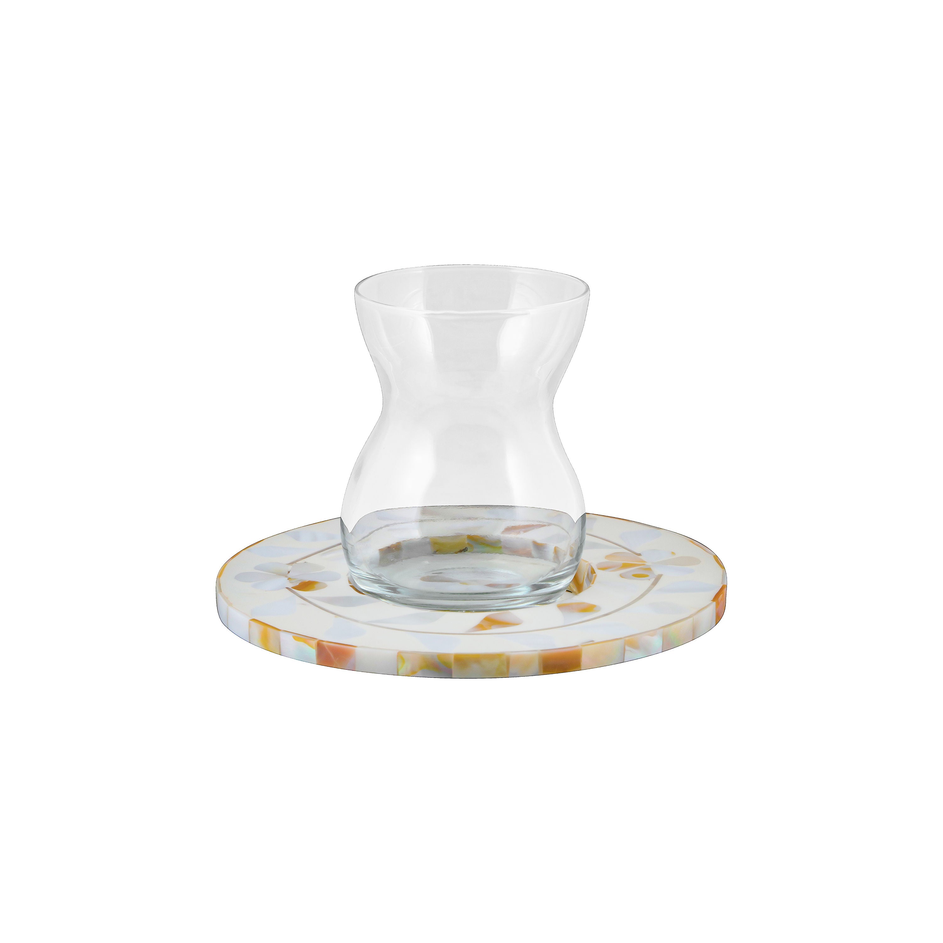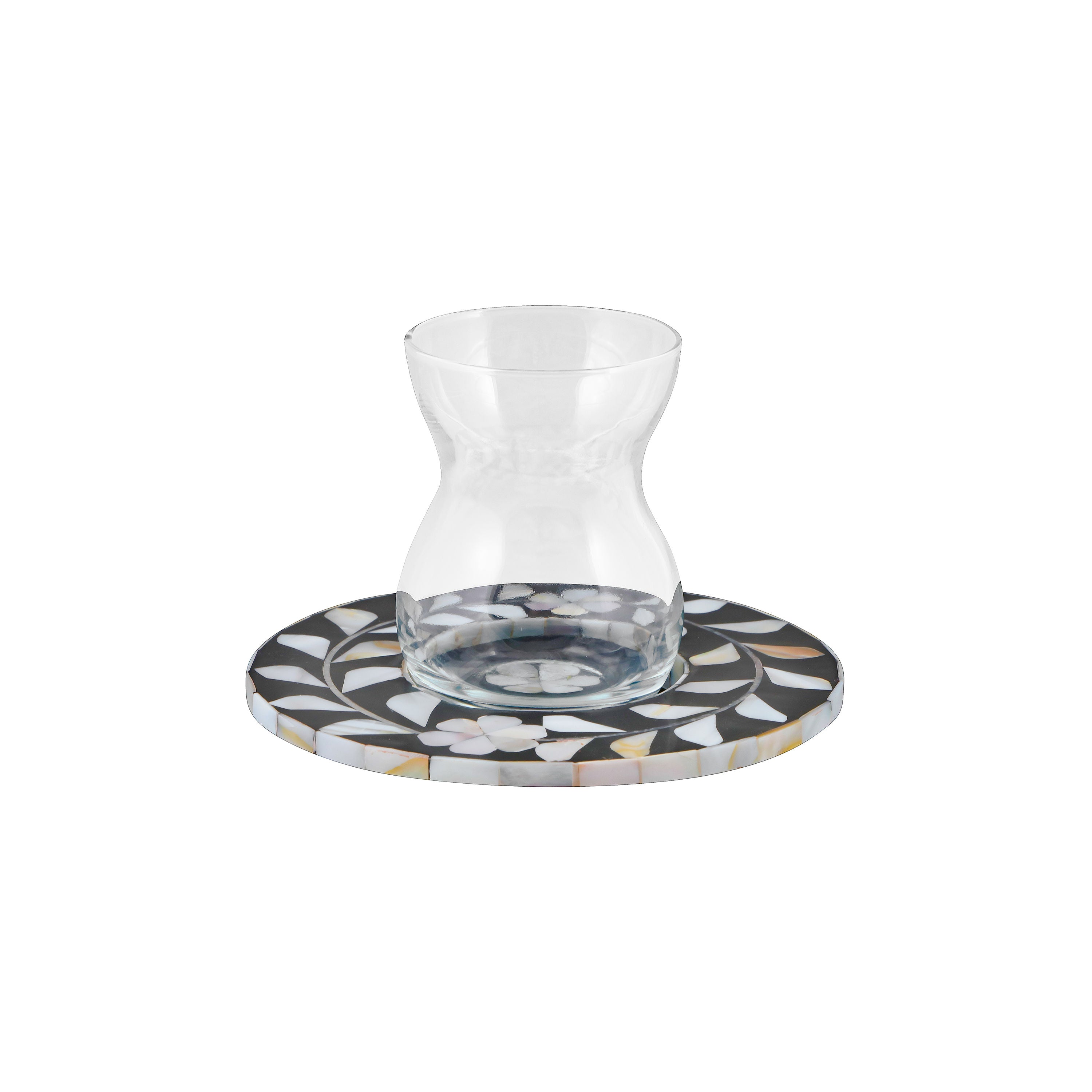 انغمس في سحر تذوق الشاي من كوب الشاي المصنوع يدوياً مع صحن أنيق مصنوع يدوياً. مزين بتفاصيل معقدة من عرق اللؤلؤ أو العظم، هذا الطقم ينضح بالرقي والخلود، مما يجعله هدية مثالية وإضافة أنيقة لطقوس تقديم الشاي للحظات عزيزة مع العائلة والضيوف.