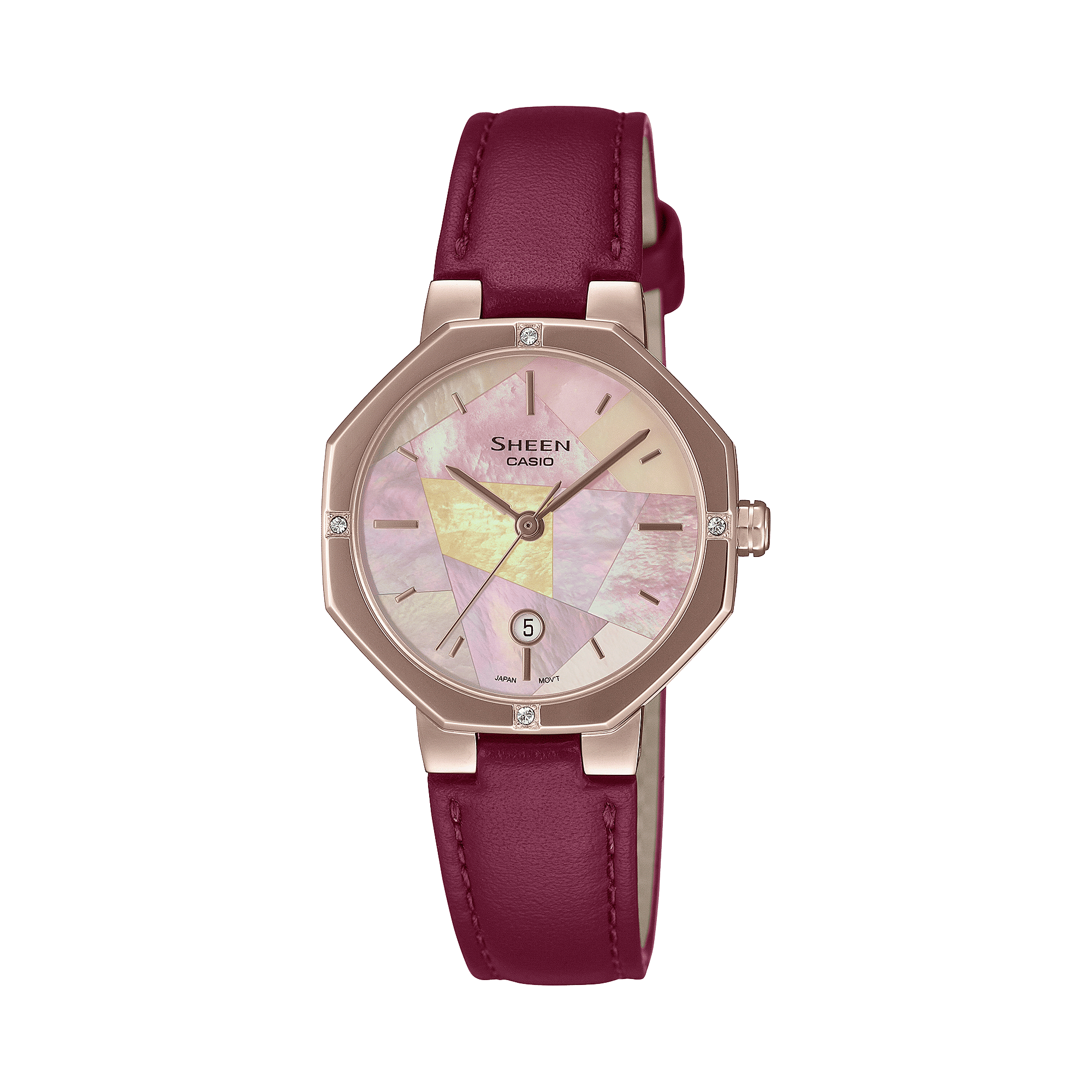 ارتقِ بأناقتك إلى مستوى أعلى مع سلسلة CASIO SHEEN SHE4543CGL، التي تتميز بلمعان قزحي الألوان لمينا من عرق اللؤلؤ في تصميم أنيق بعلبة مثمنة الأضلاع. يضفي الإطار المطلي بالأيونات الذهبية الخوخية بريقًا دافئًا وراقيًا على المعصم، بينما يضمن الشكل النحيف راحة في الارتداء.