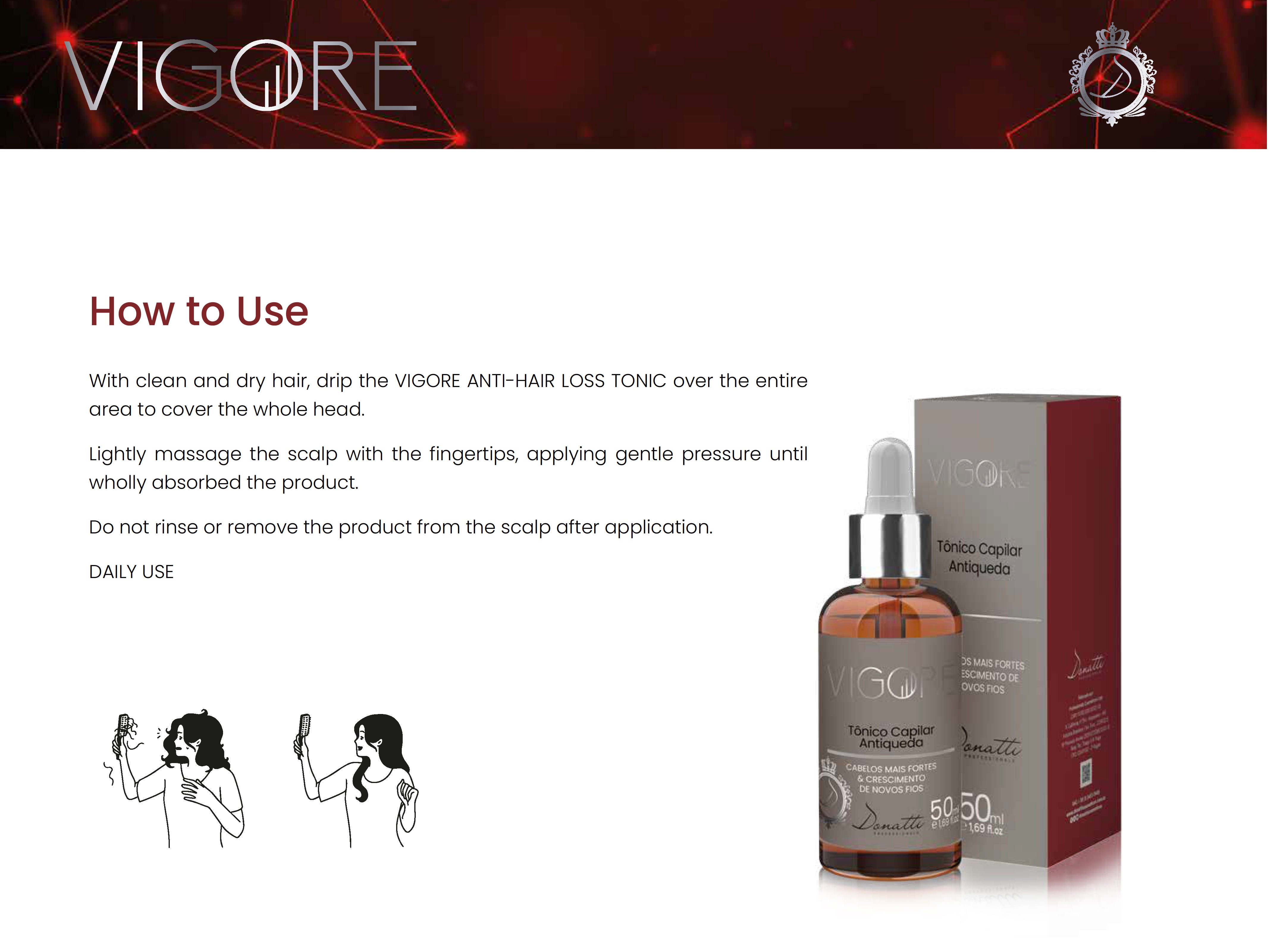 على شعر نظيف وجاف، قم برش VIGORE ANTI-HAIR LOSS TONIC على كامل منطقة