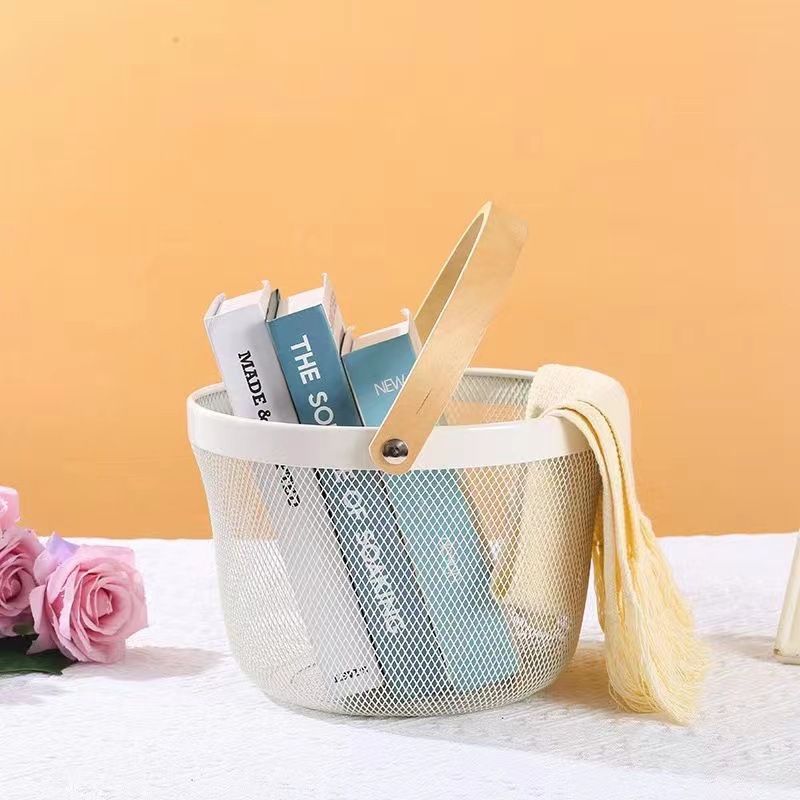 سلة تخزين مستديرة من شبكة سلكية بمقبض خشبي (وردي)