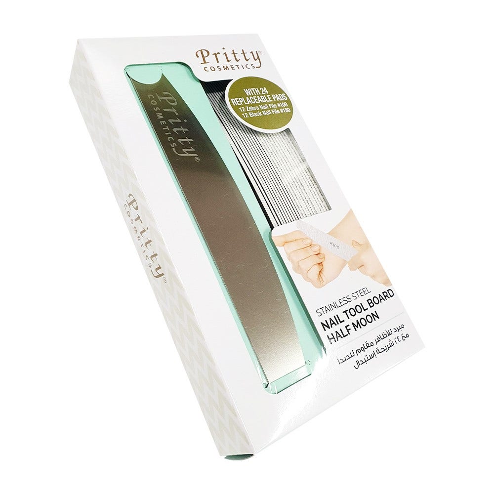 لوحة أدوات الأظافر المصنوعة من الفولاذ المقاوم للصدأ من Pritty على شكل نصف قمر، مع 24 وسادة