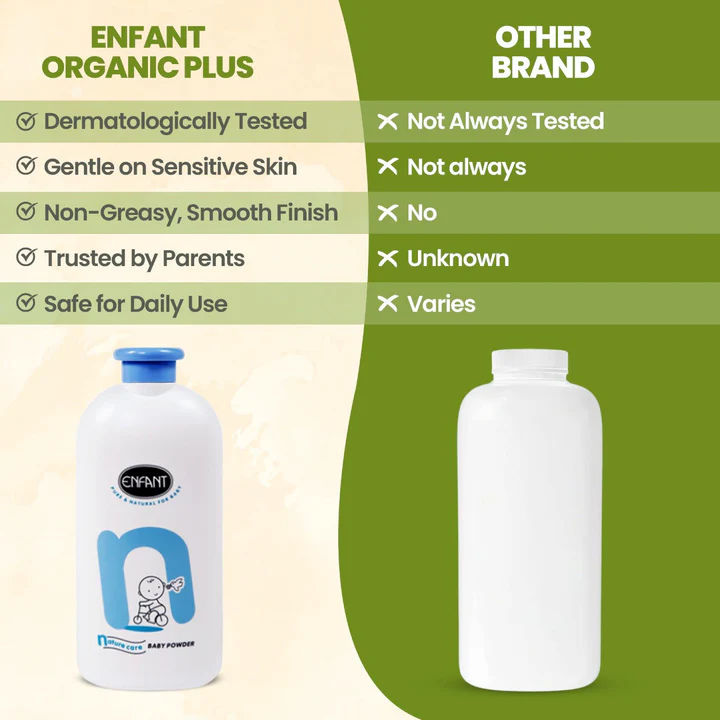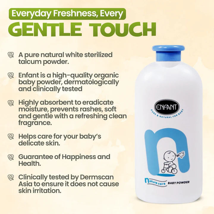 إذا كنت تبحث عنبودرة أطفال عضوية آمنة ولطيفةفي الإمارات العربية المتحدة وعمان، فإن ENFANT BABY POWDER NATURAL CARE هي الخيار الأمثل.