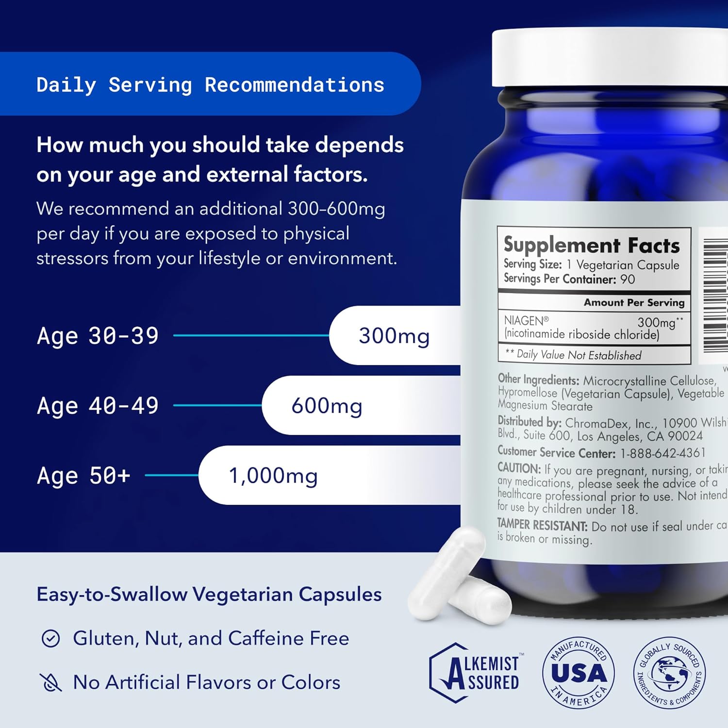 TruNiagen 90ct/300mg مكمل غذائي حائز على العديد من الجوائز وحاصل على براءة اختراع يعزز NAD+ - أكثر كفاءة من NMN - نيكوتيناميد ريبوسيد لعملية التمثيل الغذائي للطاقة الخلوية وإصلاحها. الحيوية، صحة العضلات، الشيخوخة الصحية