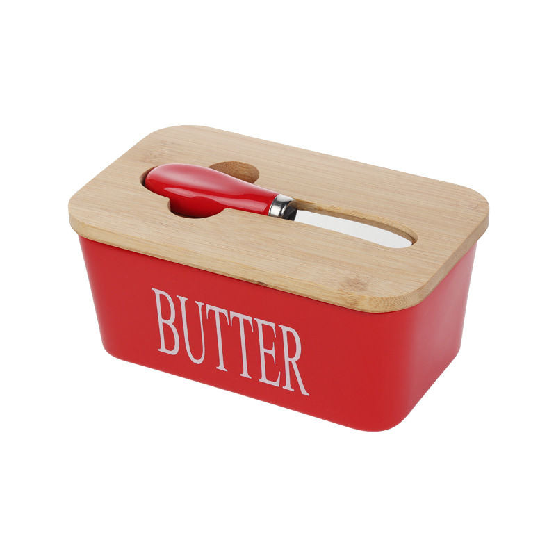 صحن زبدة حديث من السيراميك مع غطاء من الخيزران ومجموعة أدوات توزيع (أحمر)
