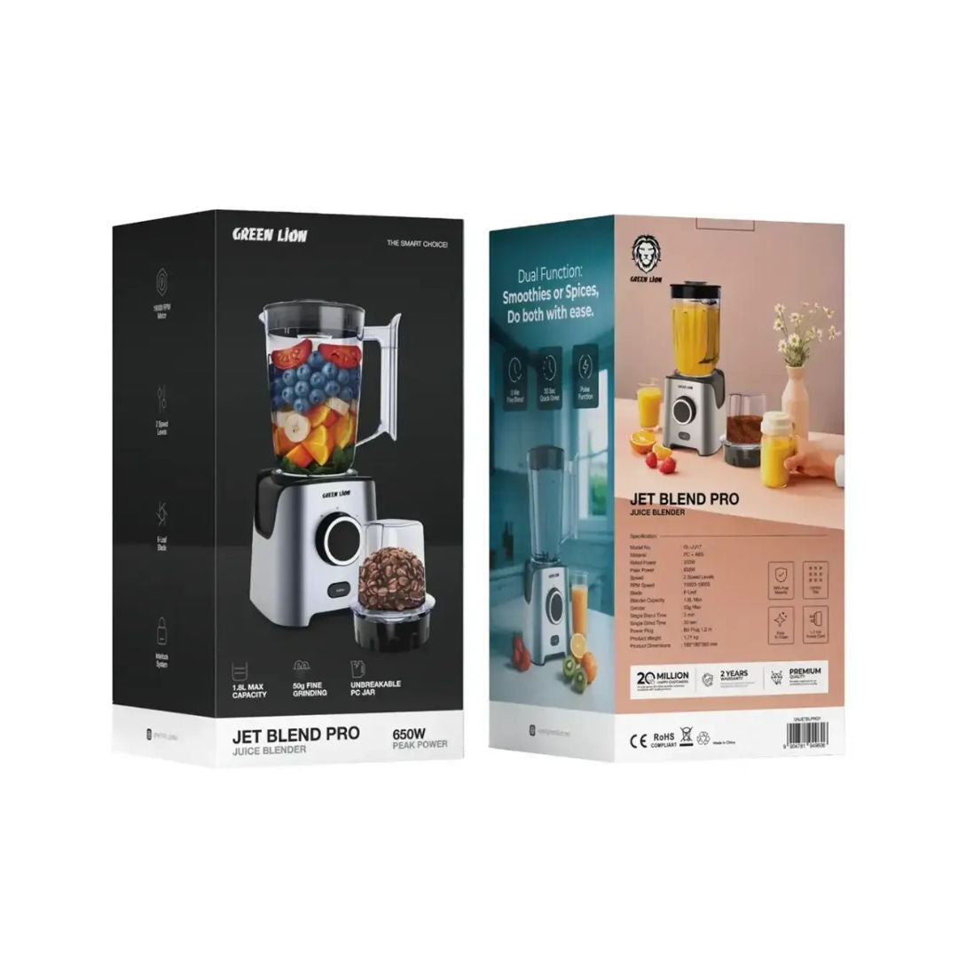 The Green Lion Jet Blend Pro Juice Blender is a powerful and efficient blending solution designed for everyday convenience. Equipped with a robust 650W motor, this blender delivers smooth and consistent results, making it perfect for preparing fresh juices, smoothies, protein shakes, and more. Its sleek and compact design in a stylish gray finish makes it a great addition to any modern kitchen. Built with durable materials and sharp stainless steel blades, the Jet Blend Pro ensures efficient blending performance while maintaining long-lasting reliability. Whether at home or on the go, this blender offers a perfect balance of power, portability, and ease of use.
