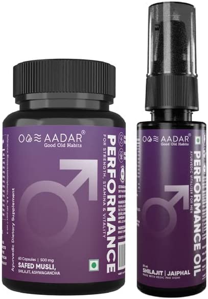 حزمة AADAR PerforMANce | مكمل غذائي أيورفيدا لتعزيز القوة والأداء للرجال (60 كبسولة) وزيت أيورفيدا للرجال (30 مل)