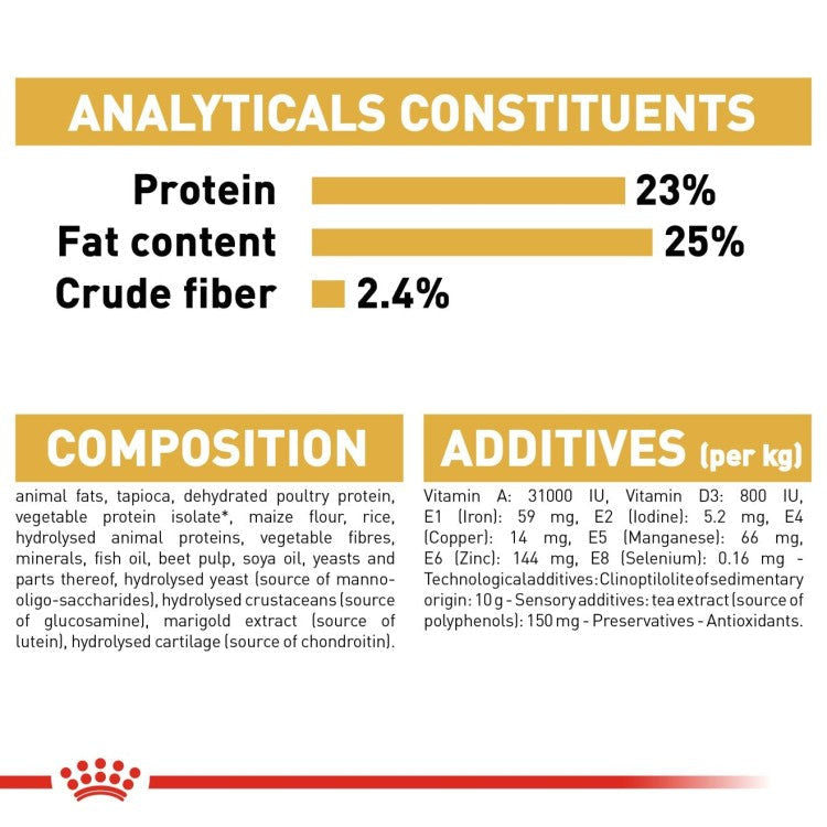 تم تصميم رويال كانين® جريت داين للكلاب البالغة خصيصًا لسلالة جريت داين التي يبلغ عمرها 24 شهرًا فأكثر، لتلبية احتياجاتها الغذائية الفريدة. وبفضل البروتينات L.I.P. سهلة الهضم والألياف المحددة، يدعم هذا الطعام صحة الجهاز الهضمي من خلال تعزيز التوازن في البكتيريا المعوية والحد من التخمير المعوي. تم إثراء هذه التركيبة بالكالسيوم والفوسفور وأحماض أوميغا 3 الدهنية (EPA و DHA) لدعم صحة المفاصل وقوة العظام، وهو أمر ضروري لهذه السلالة الكبيرة. صُمم هذا الطعام لتلبية احتياجات الجريت داين العالية من الطاقة، ويوفر السعرات الحرارية اللازمة لتغذية بنيته العضلية دون إثقال معدته. مثالي للحفاظ على الصحة العامة والرفاهية لرفيقك المهيب والقوي.