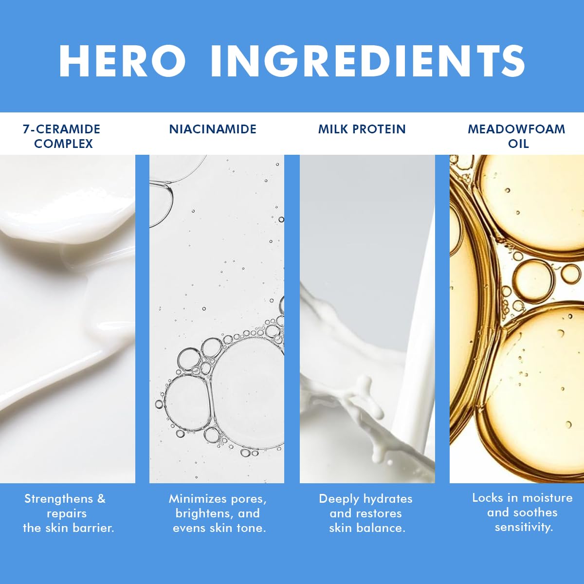 مزيج السيراميدات يحاكي التركيب الدهني الطبيعي للبشرة، مما يساعد في إصلاح الحاجز الواقي. النياسيناميد يساعد في تهدئة الالتهابات وتحسين لون البشرة، بينما توفر المرطبات ترطيبًا طويل الأمد. بروتين الحليب والأحماض الخفيفة تساعد في الحصول على بشرة أكثر نعومة ونضارة.