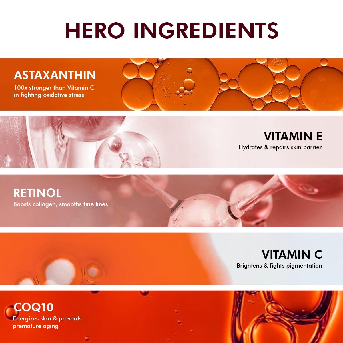 5-مركب مضاد للأكسدة: أستازانتين، حمض الإيثيل الأسكوربيك (فيتامين C)، فيتامين E، ريتينول، ويوبيكوينون – يضيء البشرة ويصلحها ويحميها من الأضرار التأكسدية.