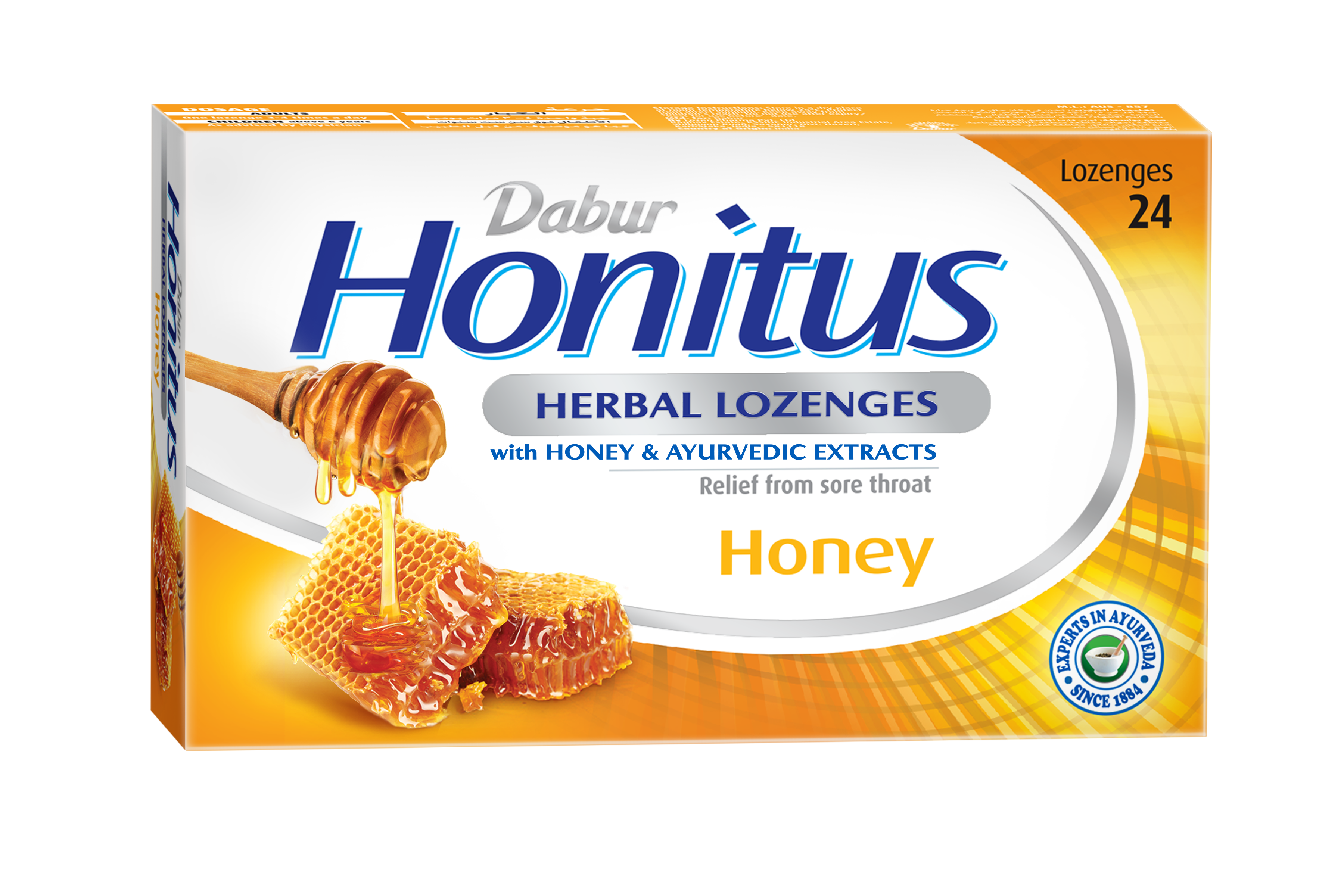 عسل حقيقي: تحتوي أقراص Dabur Honitus Herbal Lozenges على عسل حقيقي إلى جانب أعشاب أثبتت فعاليتها على مر الزمن. يُعرف العسل منذ قرون بخصائصه الطبية في تخفيف التهاب الحلق والسعال والبرد، من بين العديد من الفوائد الأخرى. تحتوي أقراص أخرى على العسل كنكهة، بينما تحتوي كل قرص من أقراص Honitus، بغض النظر عن النكهة، على عسل حقيقي كمكون فعال.
