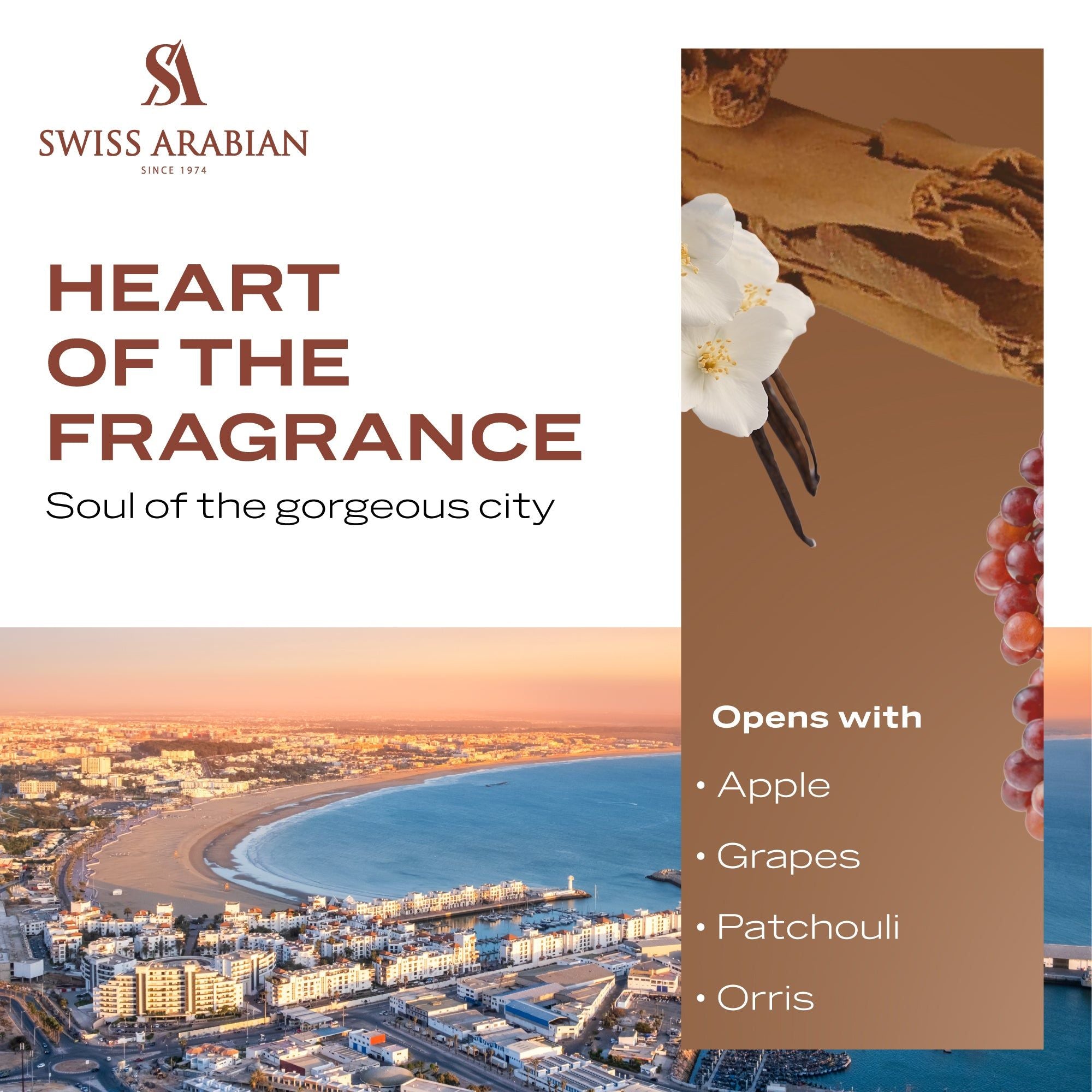 استلهم عطر Essence Of Casablanca من المدينة الخلابة التي ترتفع من رمال الصحراء التراثية. عندما تضع عطر Casablanca، تصبح جزءًا منه. جماله لا يمكن إنكاره. أناقته مضمونة. أسطورته خالدة. يبدأ عطر Casablanca بمجموعة مغرية من الفواكه الناضجة، تدعوك إلى عالم العطور هذا. تضفي التفاح والعنب اللون والعصير والحلاوة. تتبع رائحتها الجذابة نحو الباتشولي المكثف وجذر السوسن الثمين. يحيط بك العطر مثل روعة المدينة التي ألهمته: الوفرة والثراء والعظمة مجتمعة. يتسارع هذا النبض المكثف حتى يصبح طبولًا ذهبية ثابتة من المسك الحسي والبلسم العميق الحلو وغروب الشمس الذهبي من العنبر. كازابلانكا عطر للجنسين. وهو مناسب بشكل مثالي للمواسم الباردة. اكتشف Mystique.
