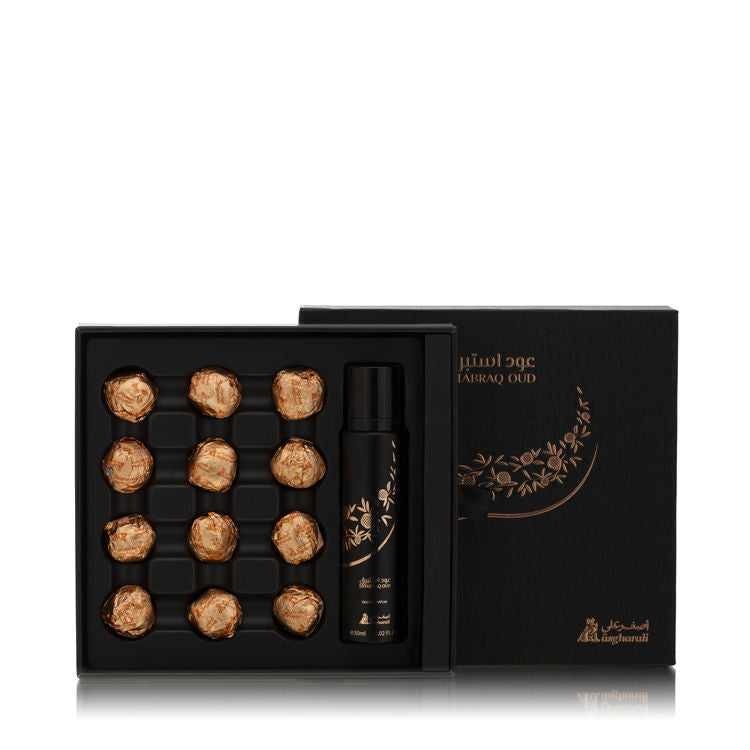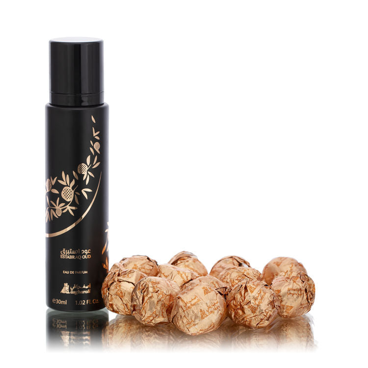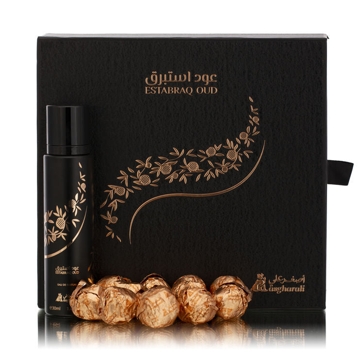 ESTABRAQ OUDSET يتضمن بخور 72 جرام على شكل كرات مستديرة مغطاة بورق معدني للحفاظ على جودته و بخاخ 30 مل، برائحة العود التي تترك أثرًا عطريًا ملحوظًا ودائمًا في المكان المحيط. تتضمن المكونات العليا نضارة البرغموت والتوت، بينما تنتقل بسرعة إلى المكونات الوسطى من الغردينيا والورد والبنفسج واللافندر وإبرة الراعي، مما يجعل اليوم حلمًا يستحضر ذكريات الأيام البسيطة في حقل الزهور تحت أشعة الشمس. تظهر روائح المسك والخشب والعود في القاعدة، مما يمنحك أفضل عطر في أبهى صوره. مجموعة Estabraq Oud مثالية كهدية لأحبائك أو لنفسك بفضل تصميمها المدمج والبسيط باللون الأسود.