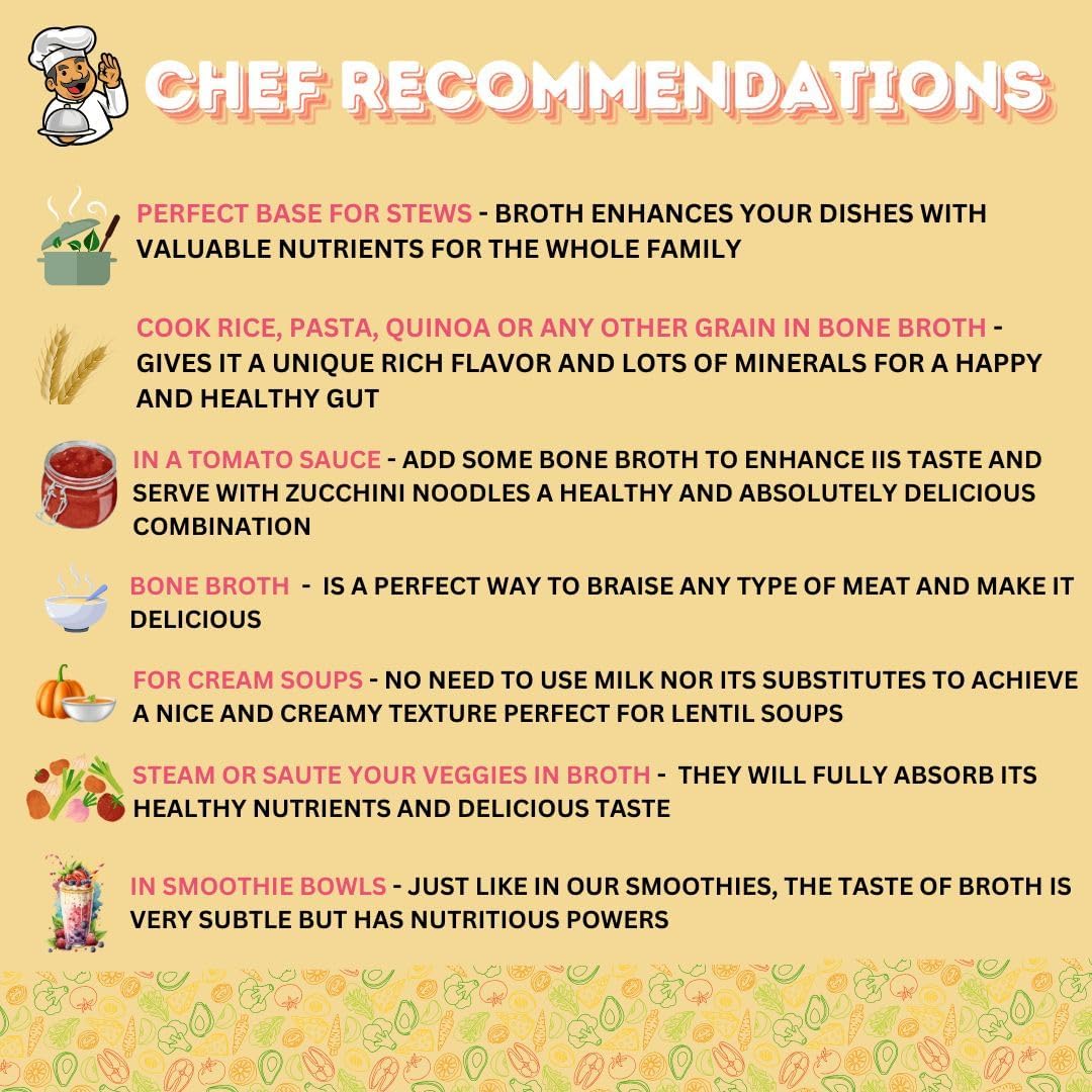 • متعدد الاستخدامات ومريح: استمتع به كمشروب دافئ ومريح، أو استخدمه كأساس لذيذ للحساء، أو أضفه إلى وصفاتك المفضلة. كل كيس سهل التخزين في الثلاجة للحفاظ على نضارته.