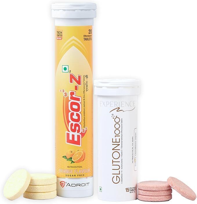 GLUTONE Glutone1000 (1000 مجم) و Escor-Z بنكهة البرتقال (20 حبة) حزمة مزيج صحي