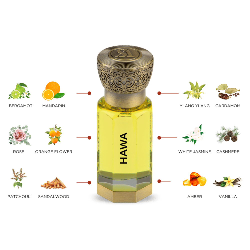 هاوا تعني الرغبة. وهي مستوحاة من شدة الحب الفريدة. يبرز العطر ثماراً مغرية تتلألأ بألوان قزحية. تشعر بالدوار من الحب بينما تحيط بك أزهار الشمس الذهبية مع قلب زهري رومانسي من الياسمين وزهرة البرتقال والورود. أرقى عطر الكشمير يداعب بشرتك بارتعاش من المتعة. يضيف الباتشولي والمير المثيران للفضول سحر الإغراء بينما يرقصان بعيدًا عن متناول يدك، ليأخذانك إلى دفء الفانيليا الذهبية وخشب الصندل الرائع. رغبة قلبك.