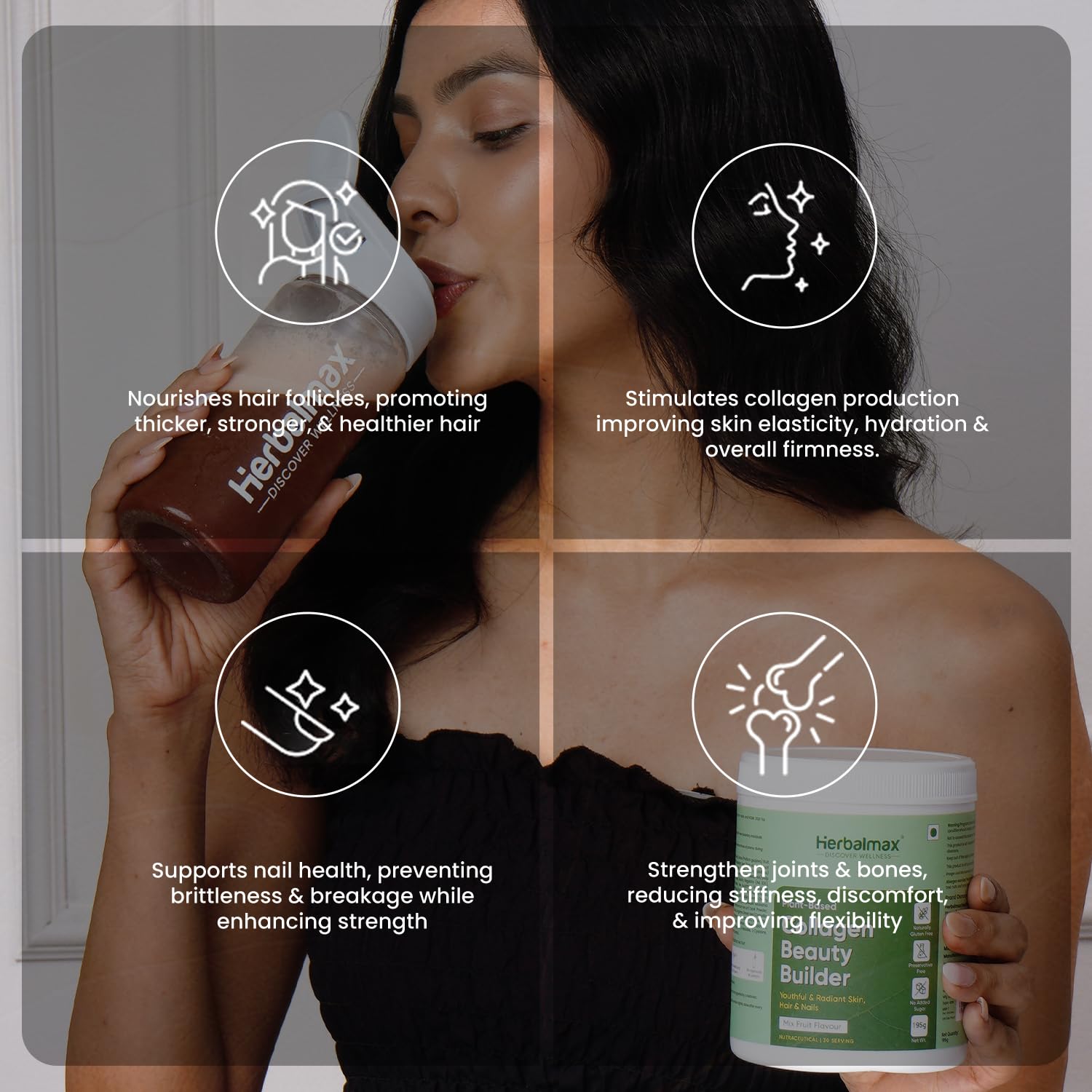 Herbal Max 100% Veg Collagen Builder هو مكمل غذائي نباتي مصمم لتعزيز إنتاج الكولاجين في الجسم بشكل طبيعي. غني بالأطعمة الفائقة والأحماض الأمينية ومضادات الأكسدة، هذا المسحوق المخلوط بنكهة الفواكه يدعم صحة البشرة والشعر والأظافر والمفاصل والصحة الخلوية العامة - دون استخدام مكونات مشتقة من الحيوانات.
