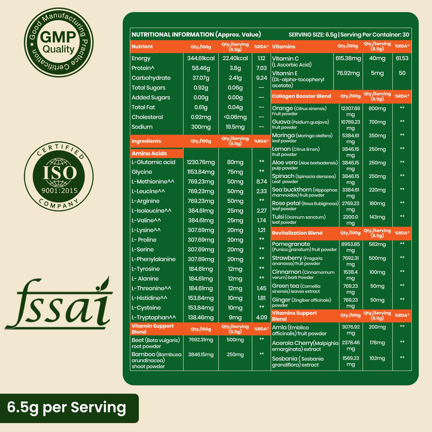 يوفر هذا المكمل الغذائي النباتي المكون للكولاجين العناصر الغذائية الأساسية والمساعدات مثل فيتامين C والبيوتين والأحماض الأمينية التي تحفز عملية تكوين الكولاجين الطبيعي في الجسم. كما أنه يحمي الكولاجين الموجود من التلف الناتج عن الإجهاد التأكسدي والأضرار البيئية.