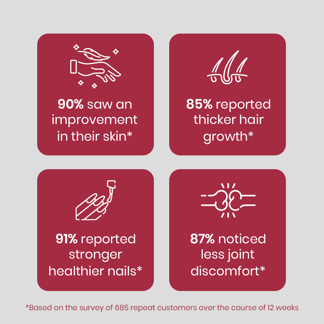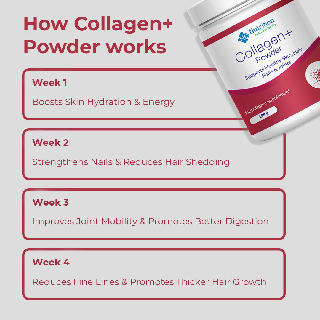 قد تظهر تحسنات في مرونة الجلد وراحة المفاصل في غضون 4 إلى 6 أسابيع.