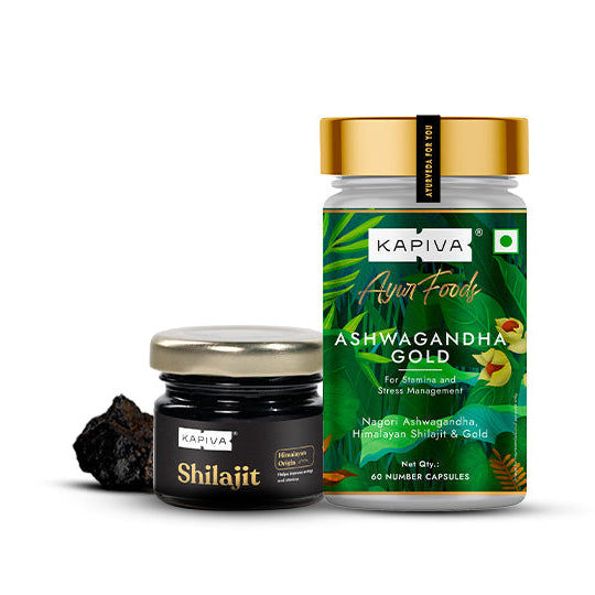 عزز حيويتك ورفاهيتك مع المزيج القوي من Kapiva Ashwagandha Gold و Kapiva Himalayan Shilajit Resin. تم تصميم هذا المزيج بعناية من أجل الصحة الشاملة، وهو يجمع بين اثنين من أقوى المكونات الطبيعية المعروفة بفوائدها في تجديد الشباب وتخفيف التوتر.
