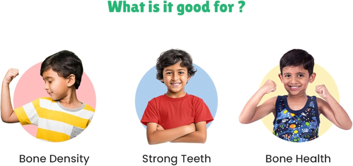 الكالسيوم هو المعدن الأساسي المسؤول عن تكوين العظام، بينما يعمل فيتامين د على تحسين امتصاص الكالسيوم في الجسم. ويعملان معًا على تعزيز قوة العظام والأسنان ونمو الهيكل العظمي بشكل عام خلال مرحلة الطفولة.