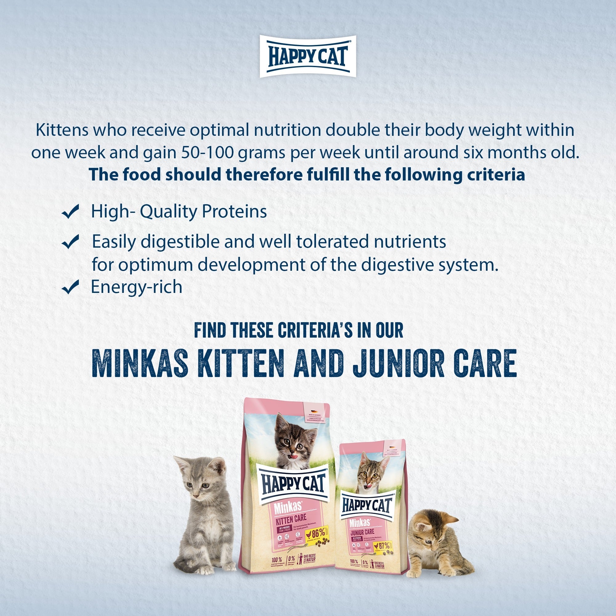 يضمن طعام "هابي كات مينكاس كيتن كير"، بفضل البروتينات القيمة والمكونات عالية الجودة التي يحتوي عليها مثل أحماض أوميغا 3 و6 الدهنية، نموًا متناسقًا وشاملًا – متوازنًا وطبيعيًا بنسبة 100%. تم تصميم هذه الوصفة، التي تحتوي على دواجن لذيذة، خصيصًا لتلبية احتياجات القطط الصغيرة. هذا الطعام الكامل مثالي للقطط الصغيرة بدءًا من الأسبوع الخامس، ويوفر لها كل ما تحتاجه. يحتوي هذا الطعام الجاف اللذيذ على الكثير من الفيتامينات، كما تم تكييف مستويات المعادن فيه لدعم نمو القطة. كما أنه يدعم جهاز المناعة. وصفاتنا خالية بشكل طبيعي من النكهات الاصطناعية والمواد الحافظة.