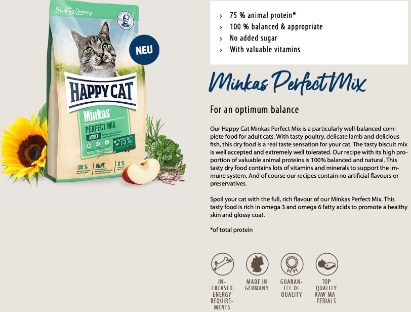 Happy Cat Minkas Perfect Mix هو غذاء كامل ومتوازن بشكل خاص للقطط البالغة. مع الدواجن اللذيذة والضأن الفاخر والأسماك الشهية، يضيف هذا الغذاء الجاف الإثارة إلى نظام غذاء قطتك. مزيج الكيبل اللذيذ مقبول جيدًا ومتوافق مع الجهاز الهضمي. وصفته، التي تحتوي على نسبة عالية من البروتين الحيواني عالي القيمة، طبيعية ومتوازنة بنسبة 100٪. يحتوي هذا الغذاء الجاف اللذيذ على العديد من الفيتامينات والمعادن، ويدعم جهاز المناعة. وصفاتنا خالية بشكل طبيعي من النكهات الاصطناعية والمواد الحافظة.