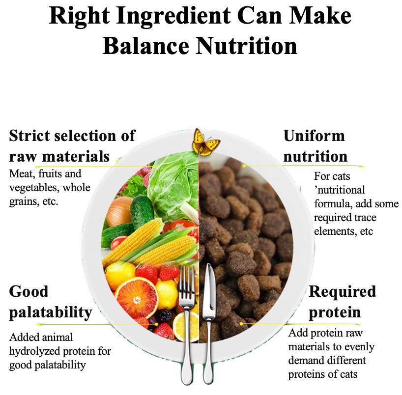 البروتين الخام 30.0٪، الدهون الخام 12.0٪، الألياف الخام 2.5٪، الرماد الخام 7.0٪، الكالسيوم 1.3٪، الفوسفور 0.8٪، الصوديوم 0.35٪، البوتاسيوم 0.65٪، المغنيسيوم 0.12٪، أحماض أوميغا 6 الدهنية 2.5٪، أحماض أوميغا 3 الدهنية 0.35٪.