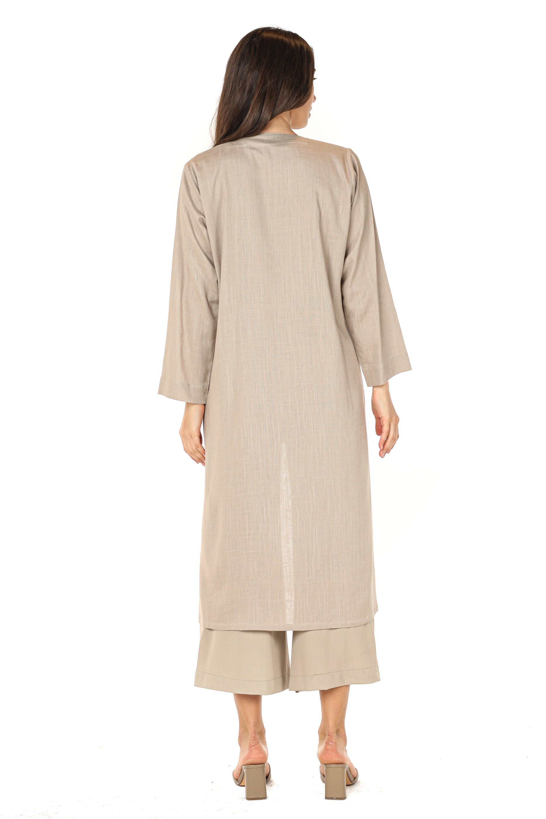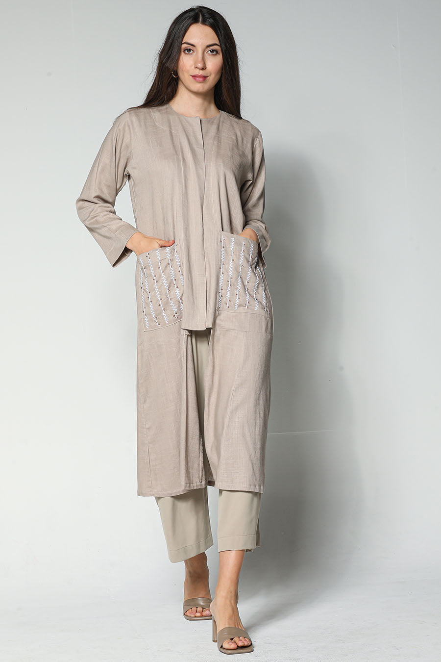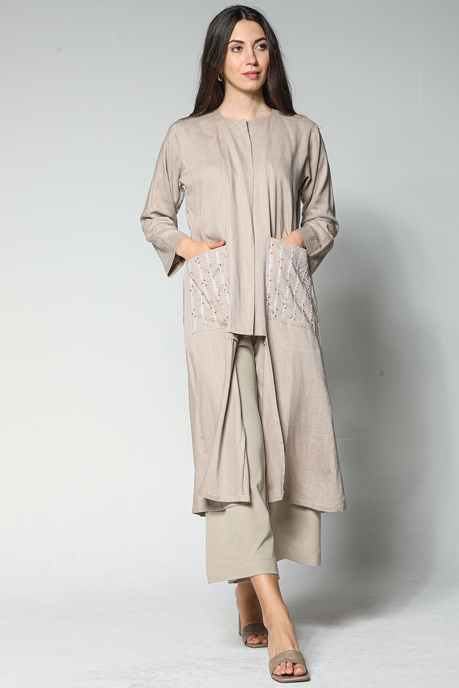 MOiSTREET سترة و بنطال بيج مطرزان مع بلوزة من الكريب