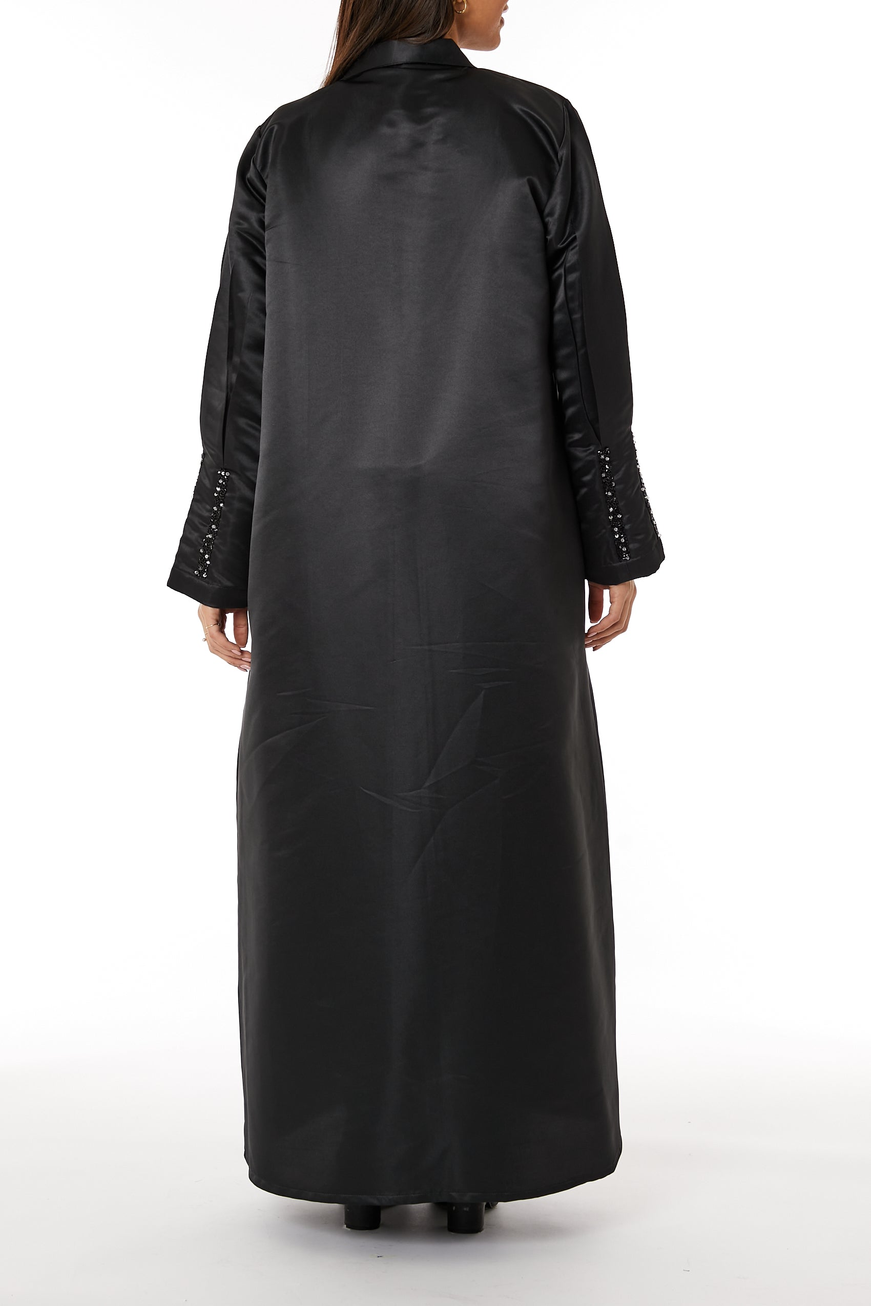MOiSTREET عباءة زفاف سوداء من الساتان مع ياقة طويلة