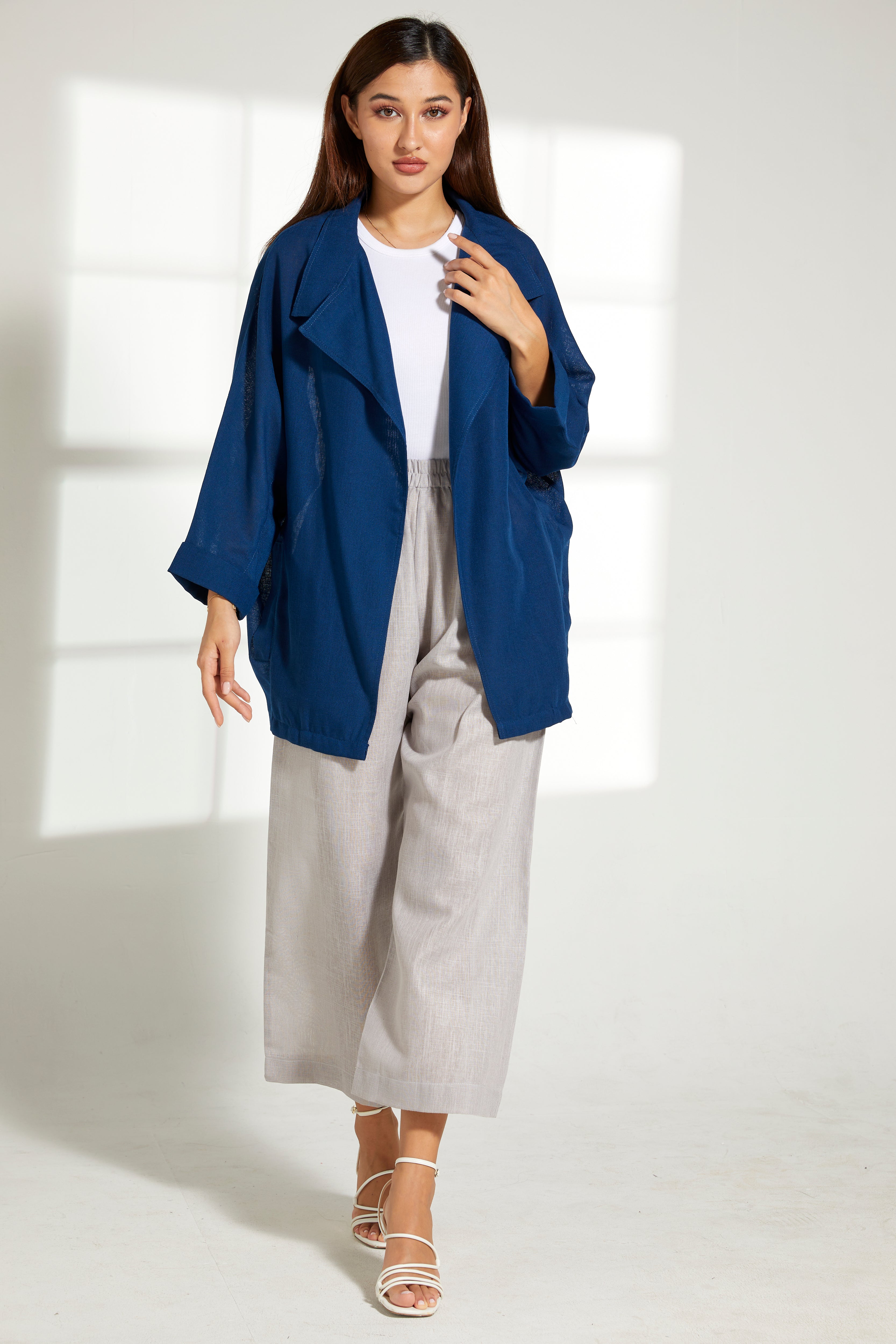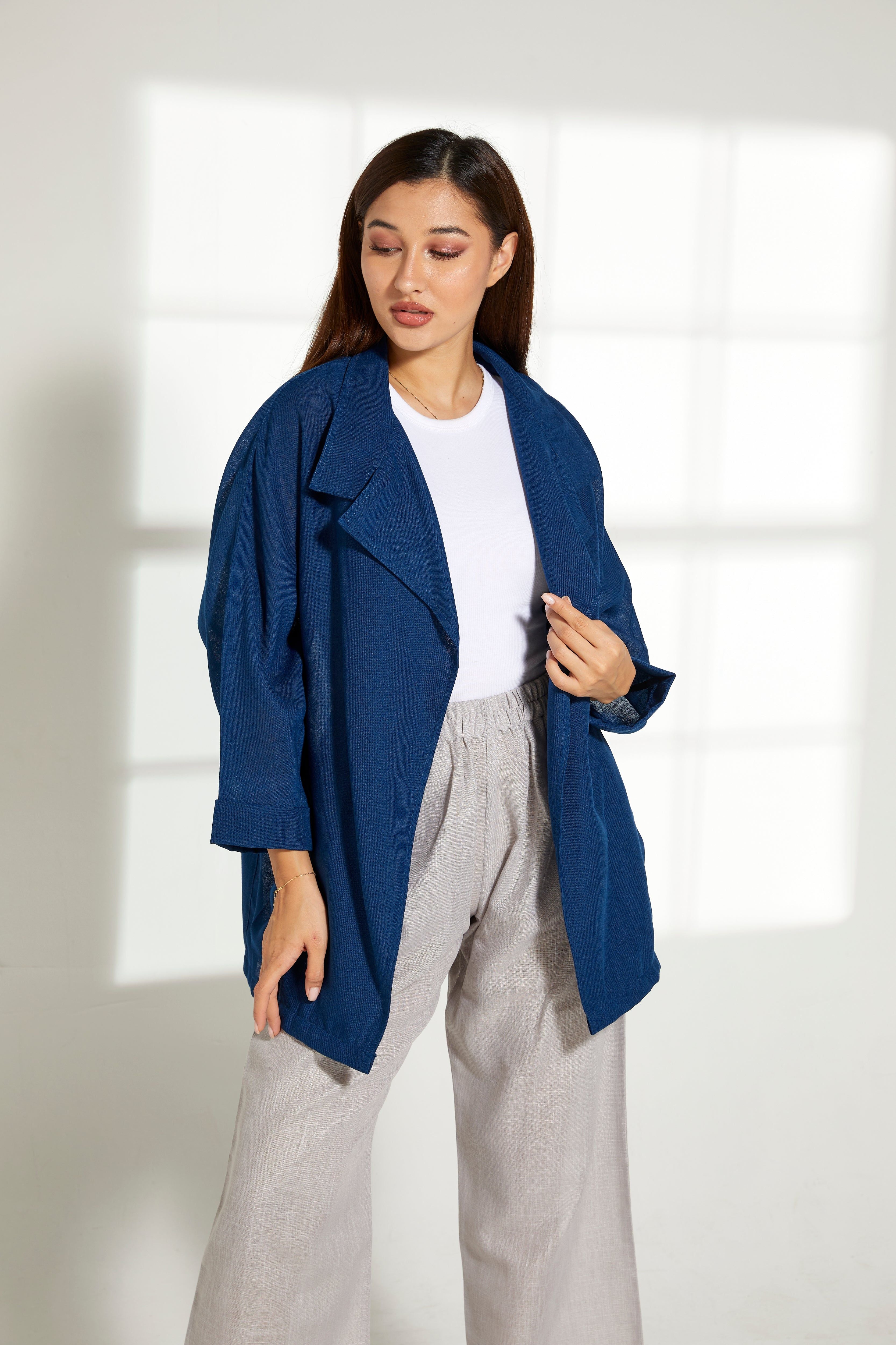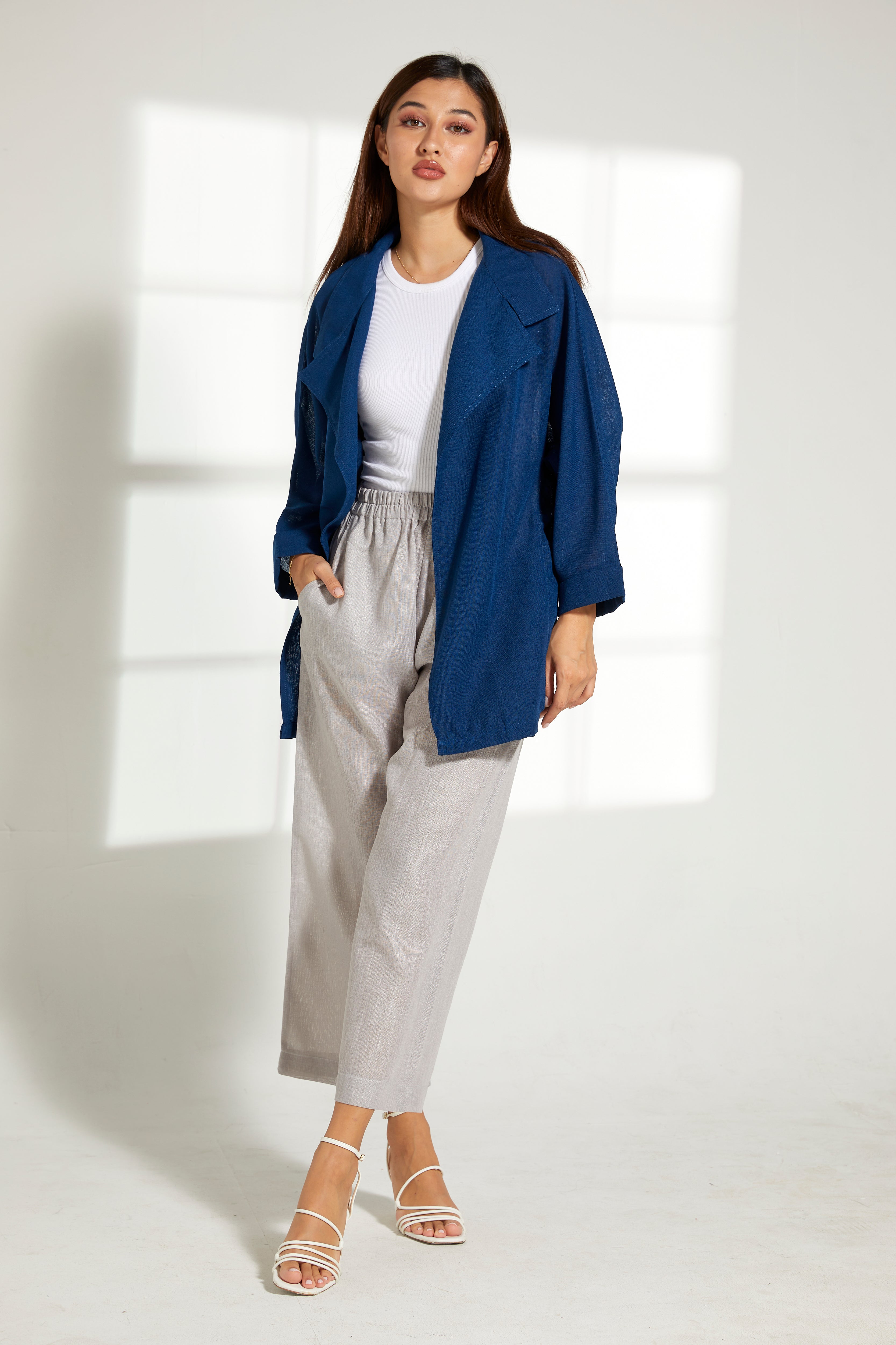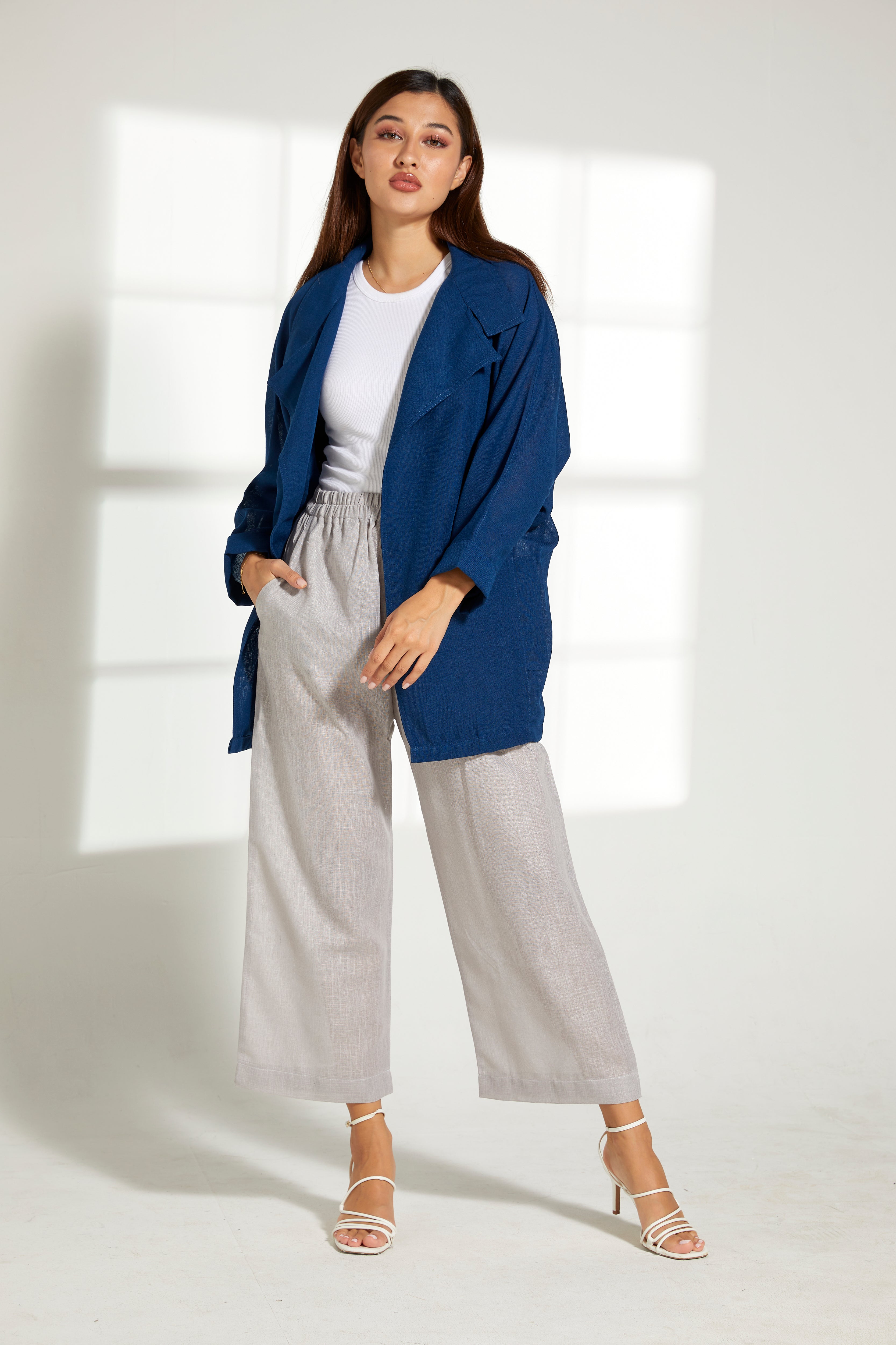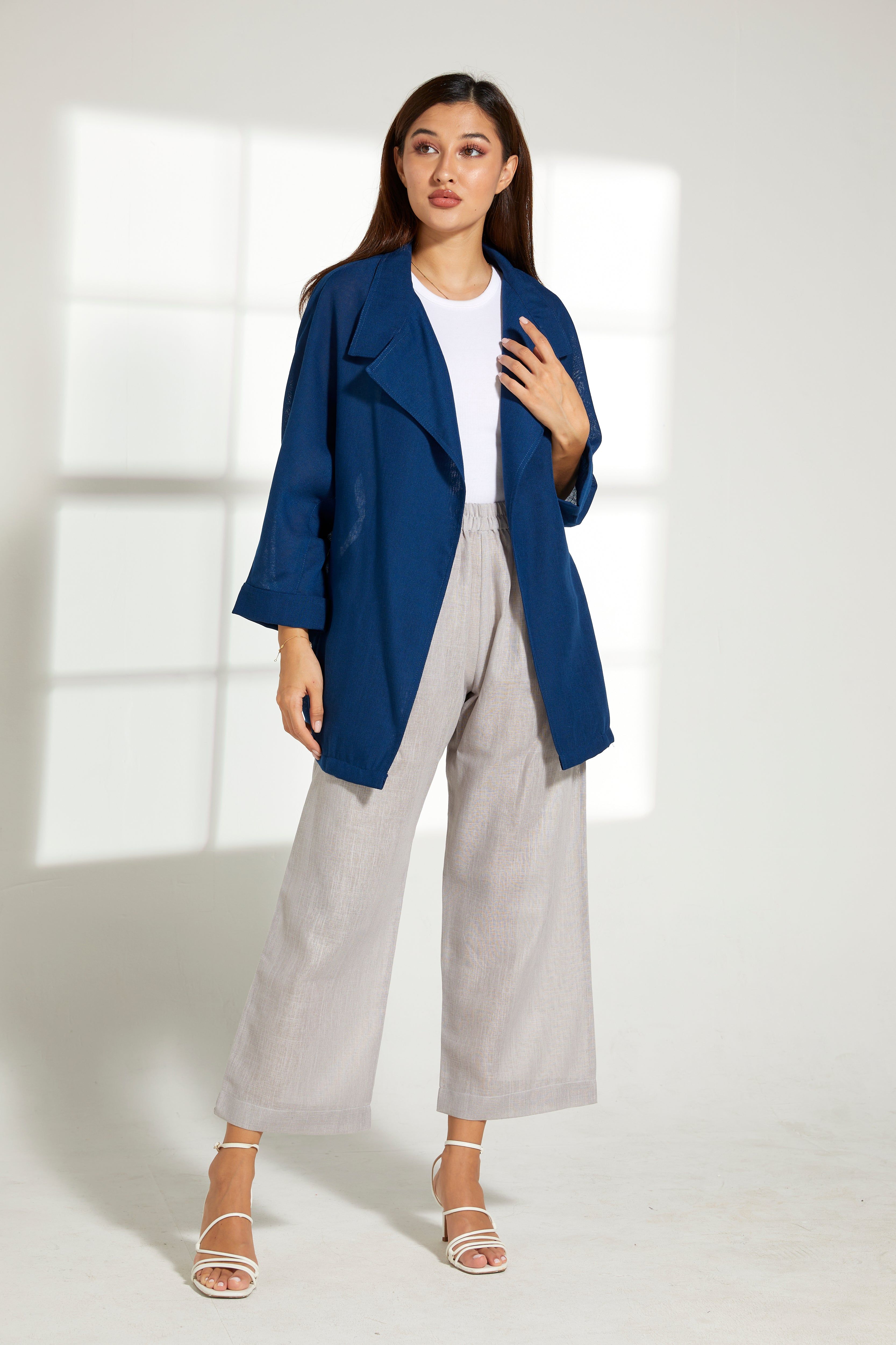 MOiSTREET طقم بلوزة زرقاء من الكتان وسروال رمادي