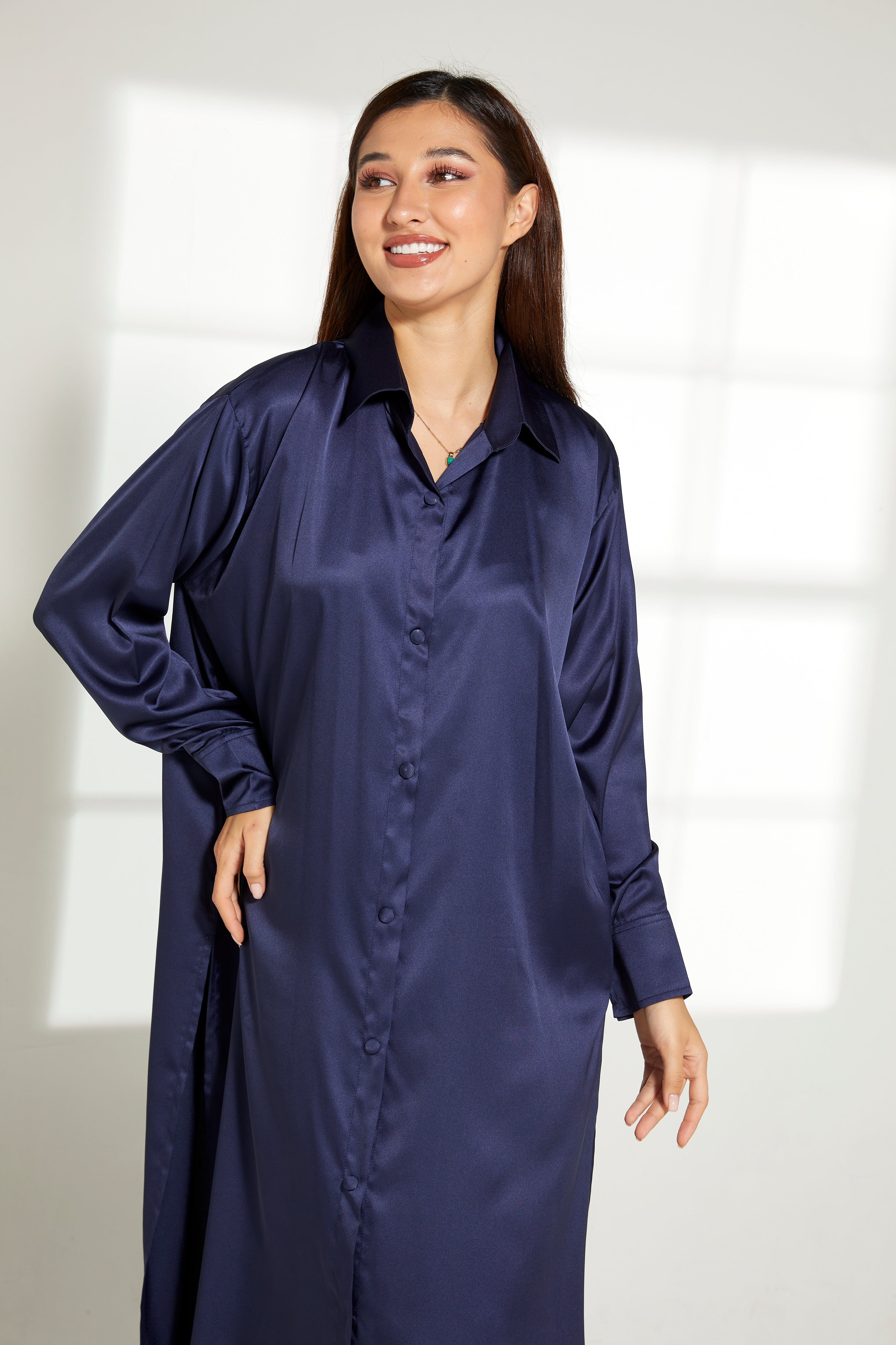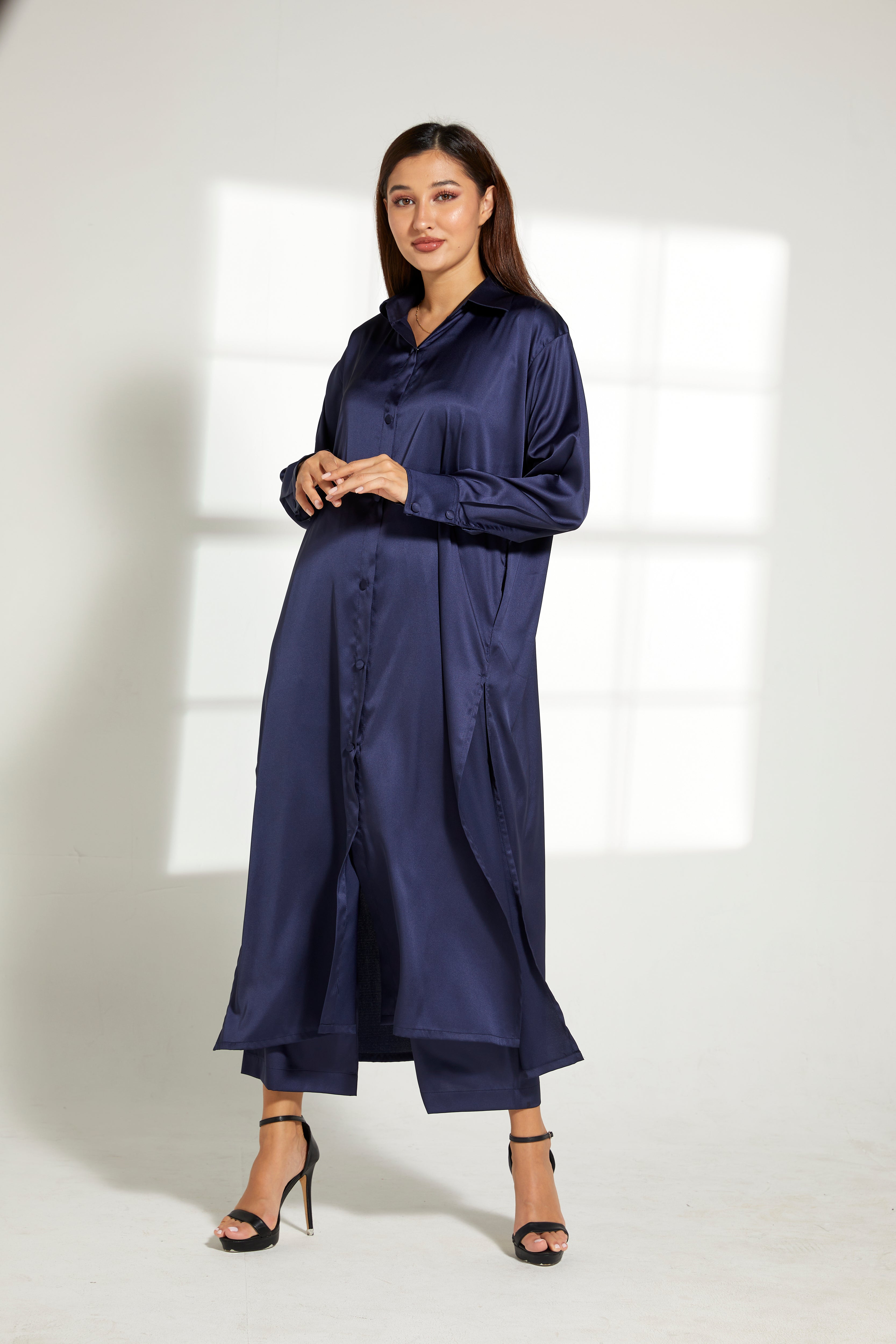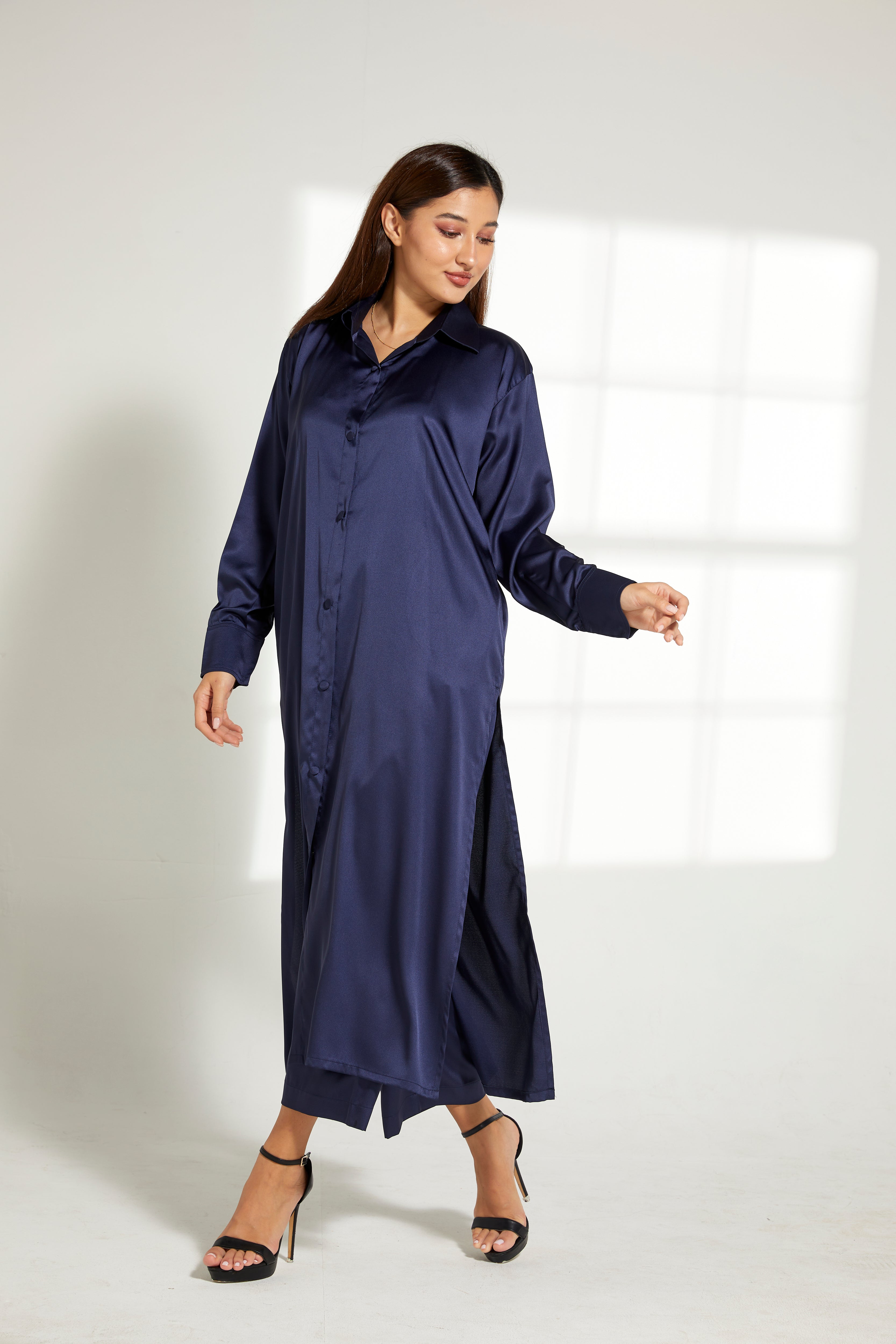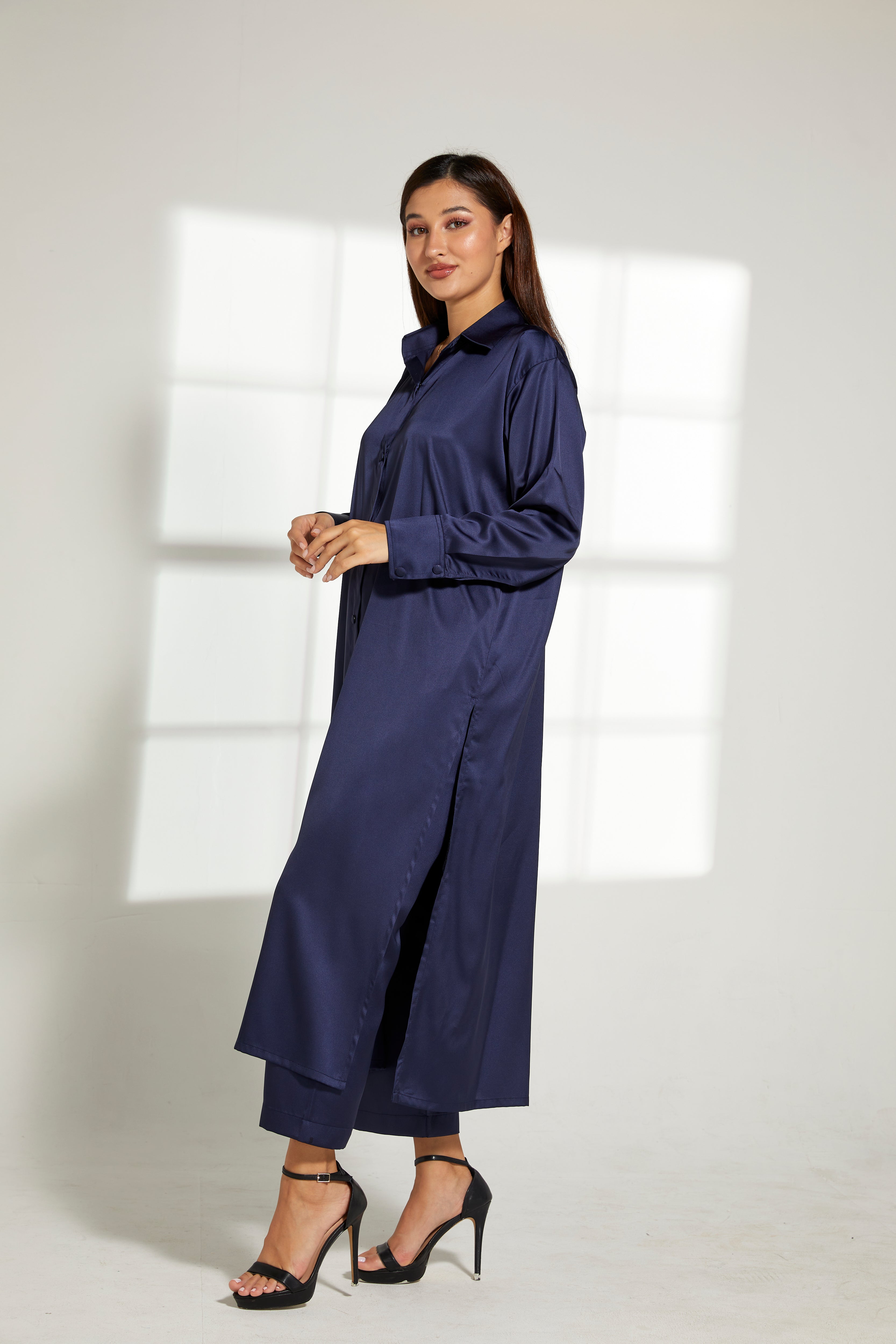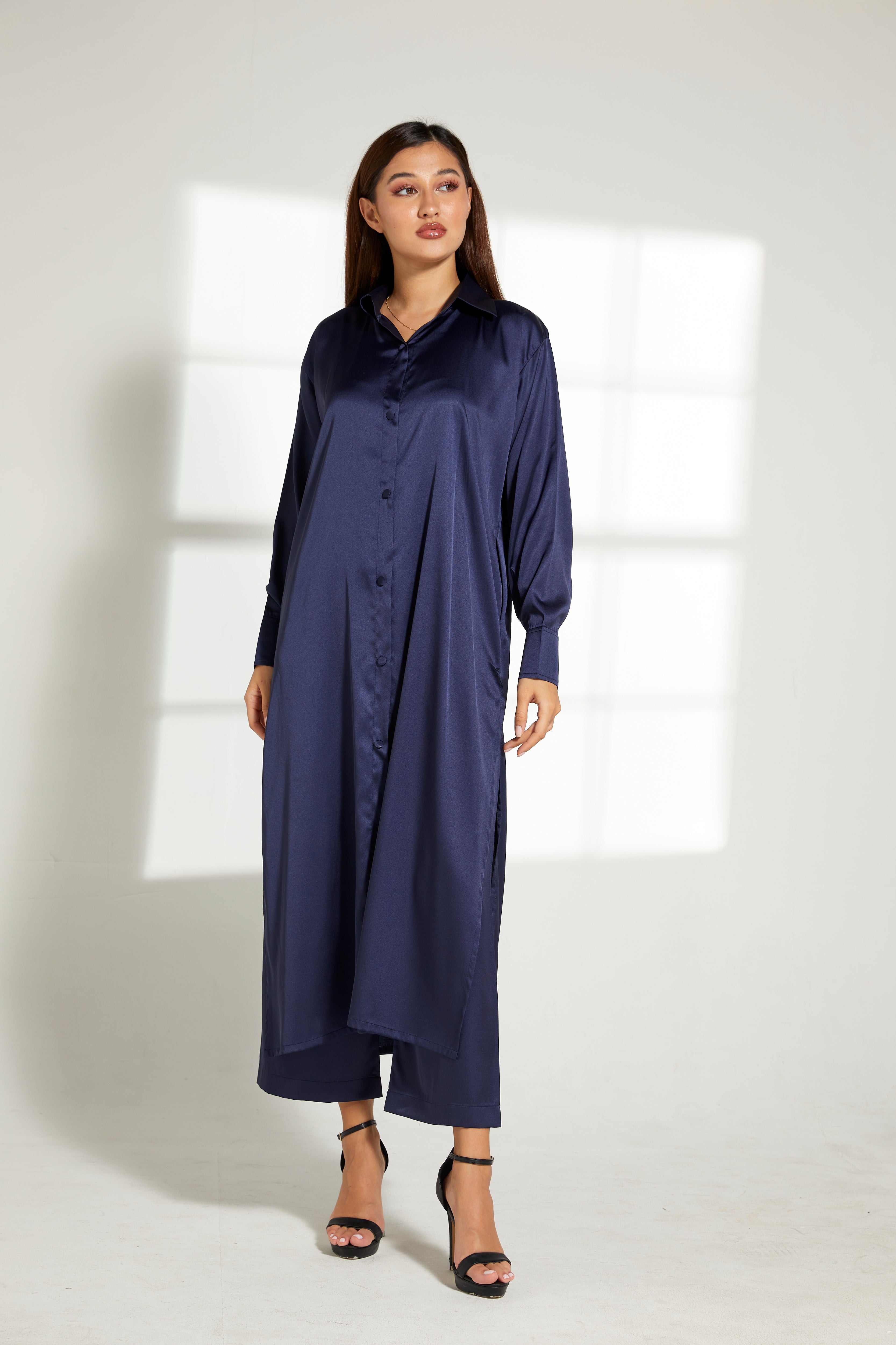 MOiSTREET طقم قميص وبنطال من قماش الحرير الأزرق الداكن