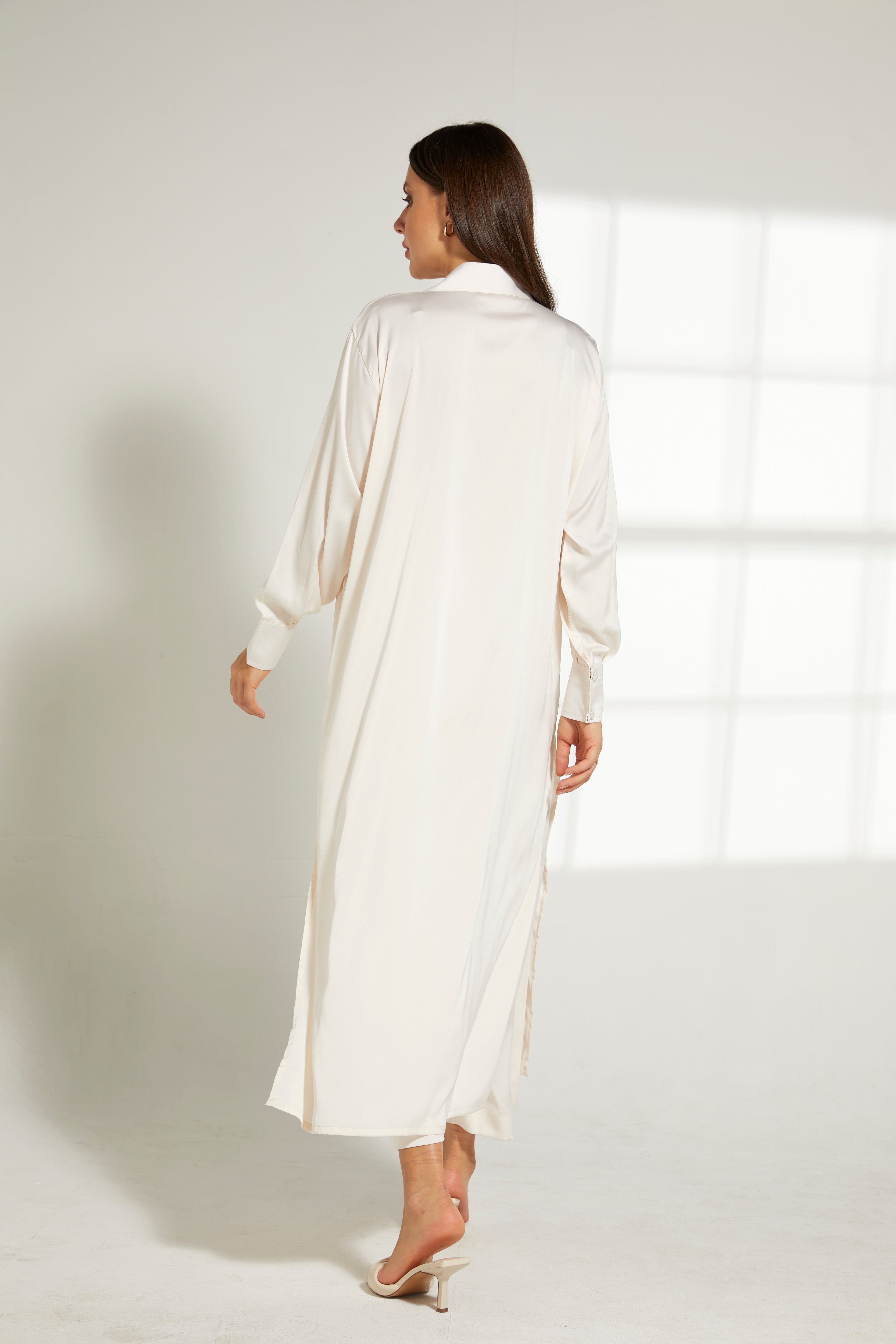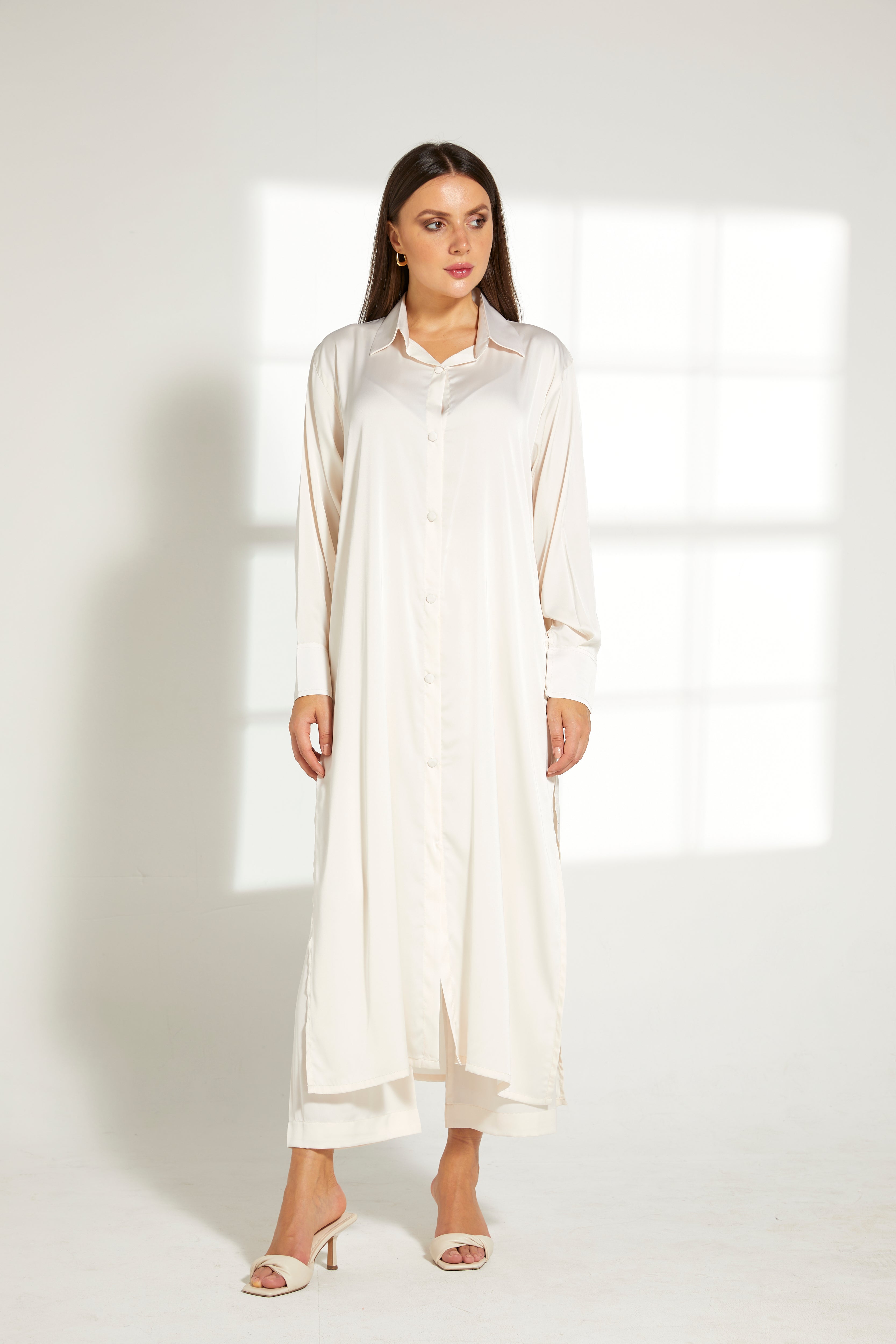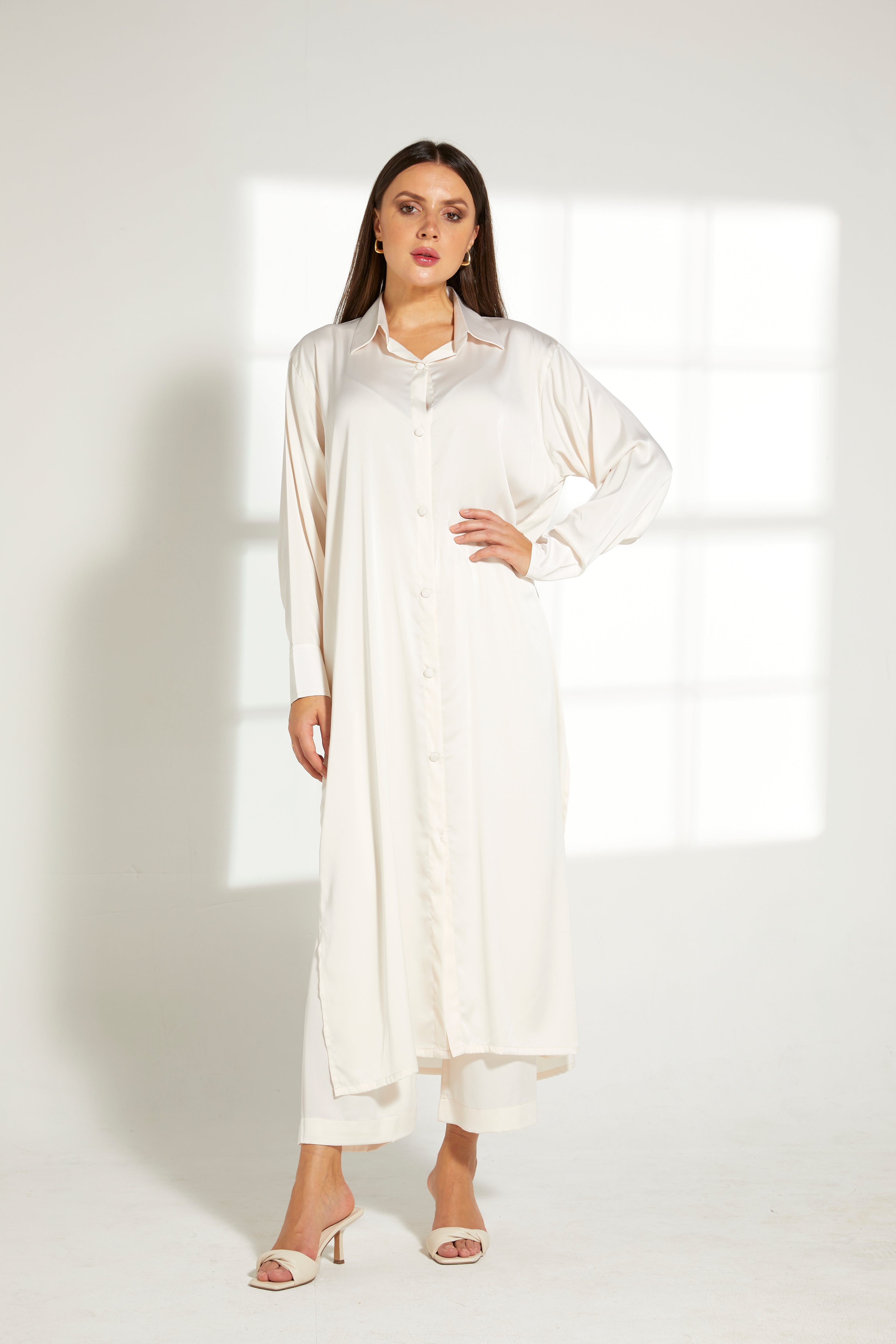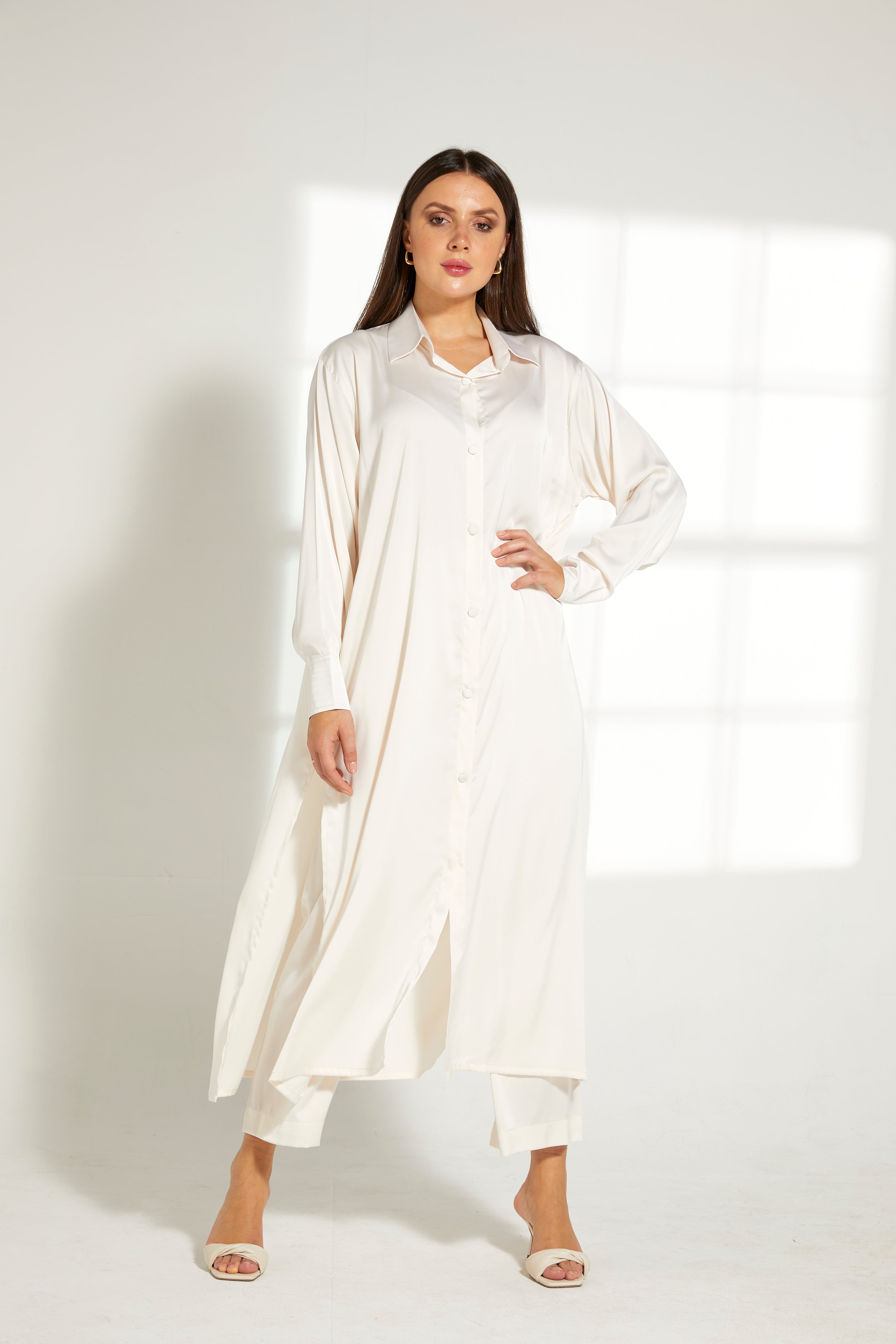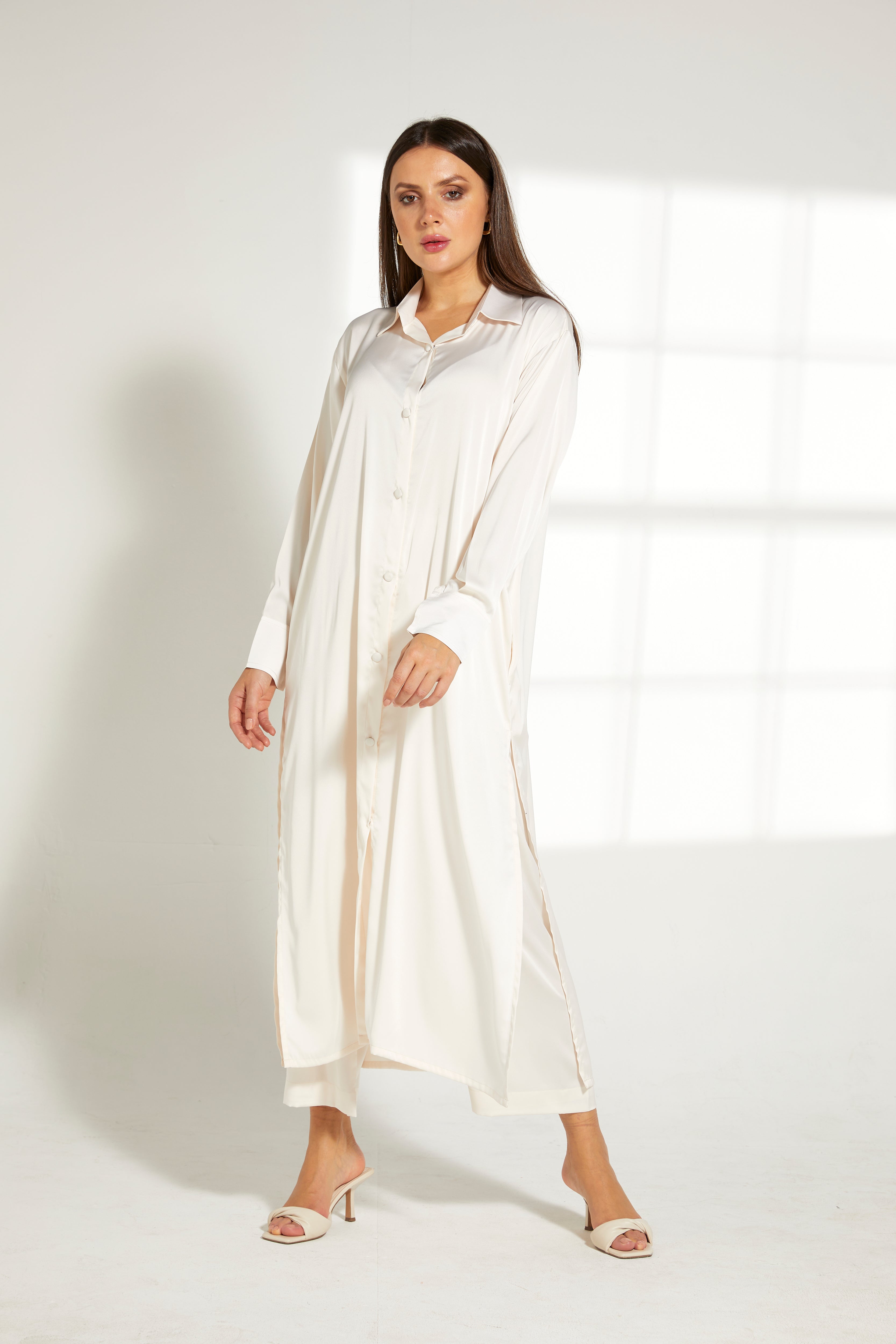 MOiSTREET طقم قميص وبنطال من قماش الحرير الأبيض المائل للصفرة