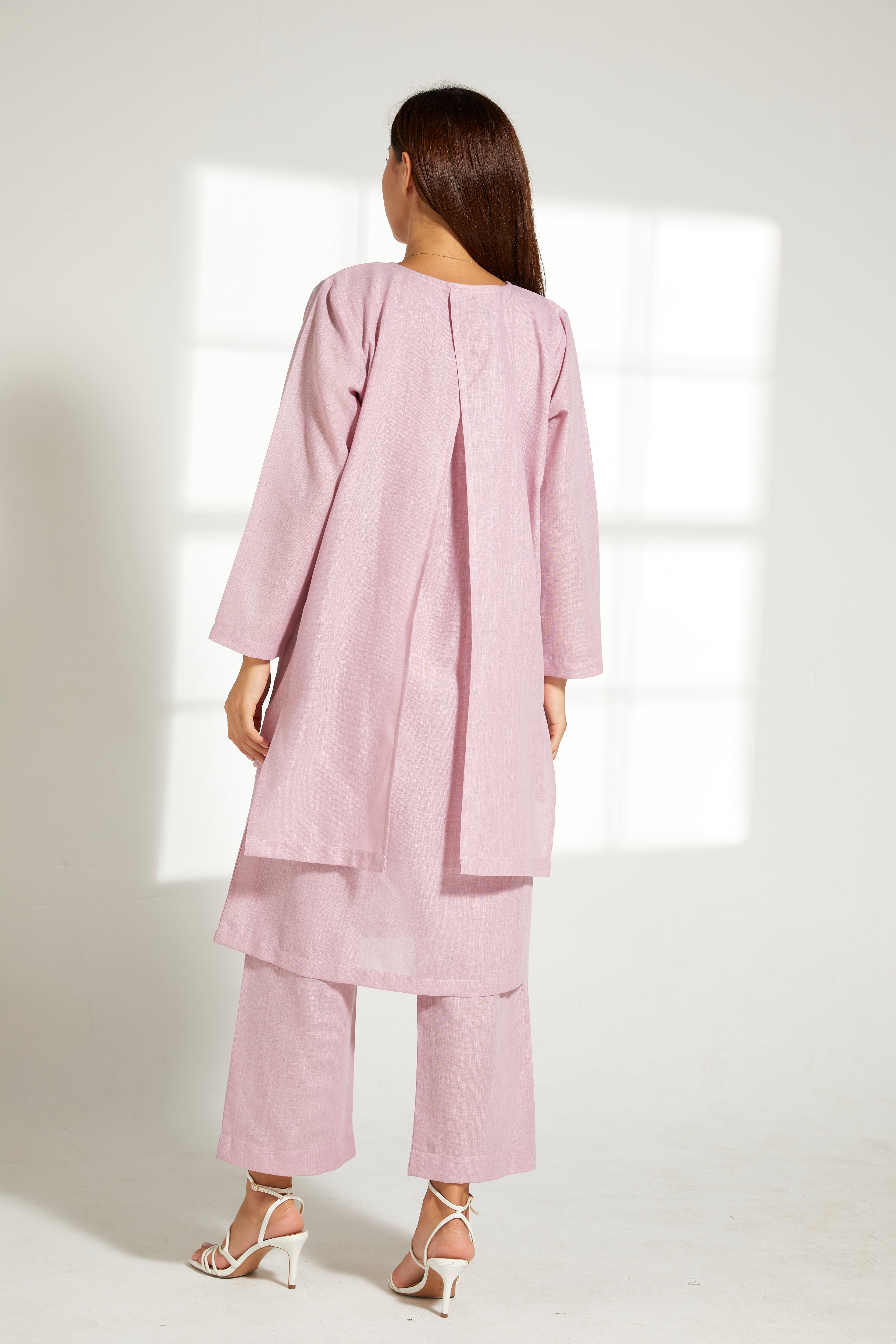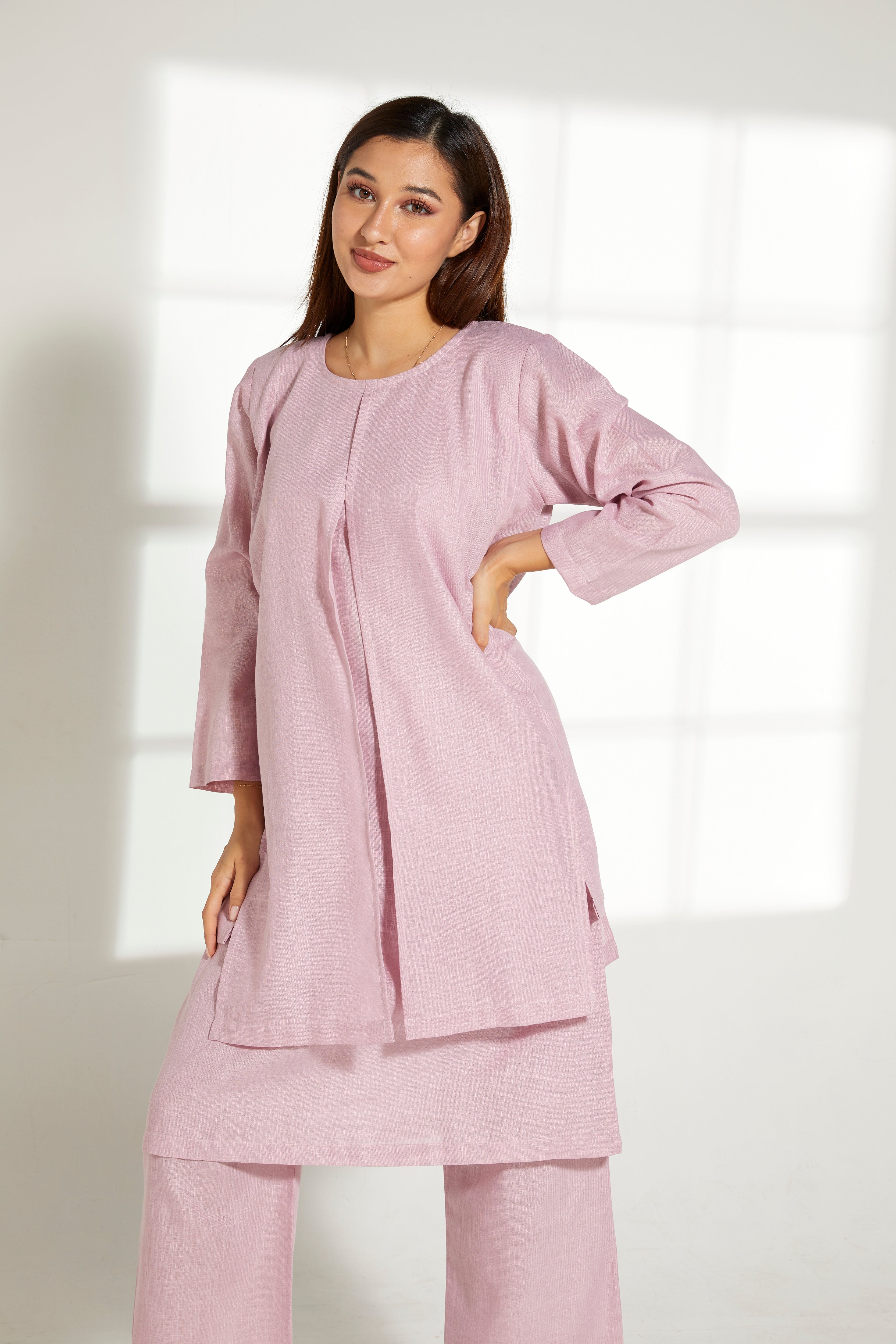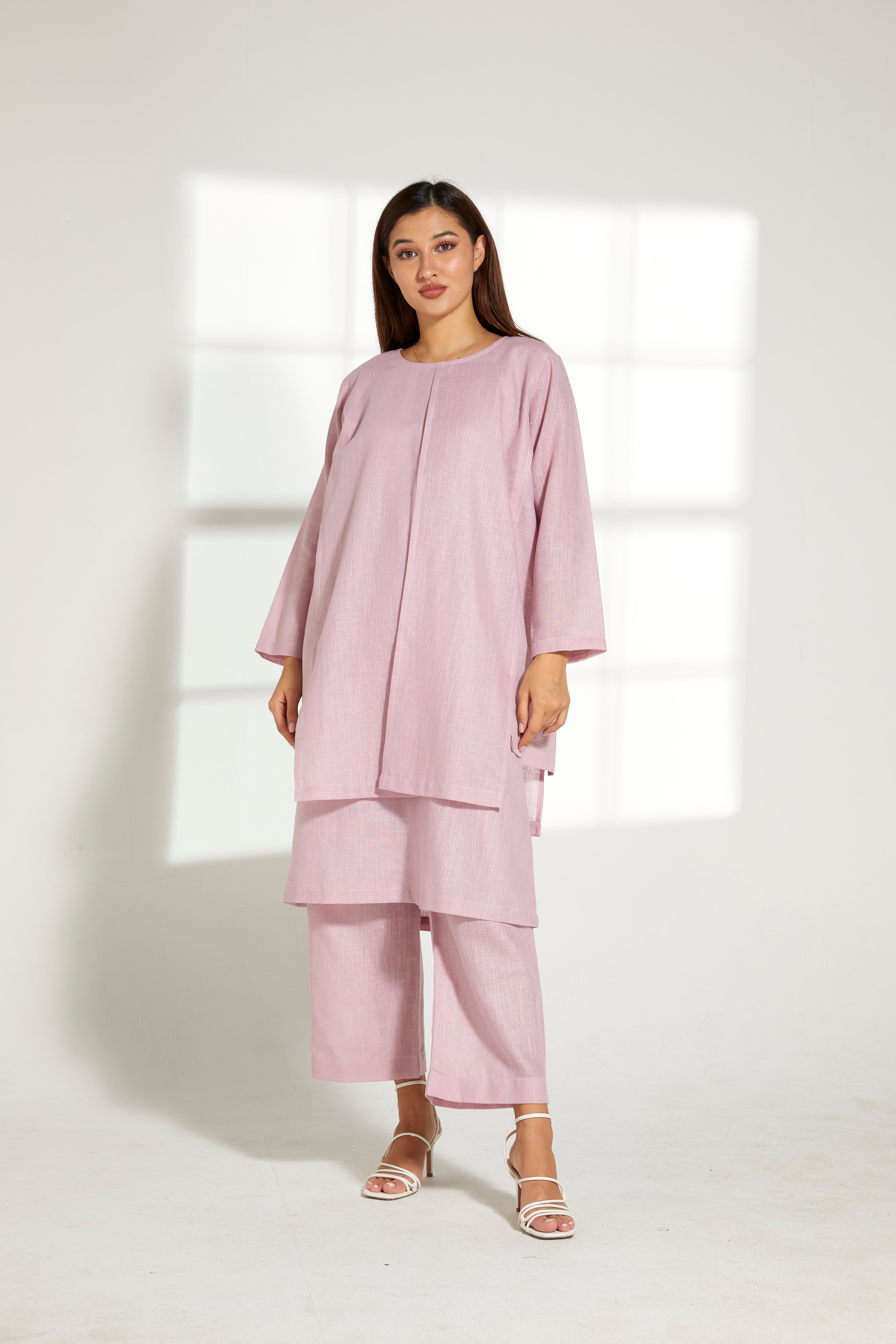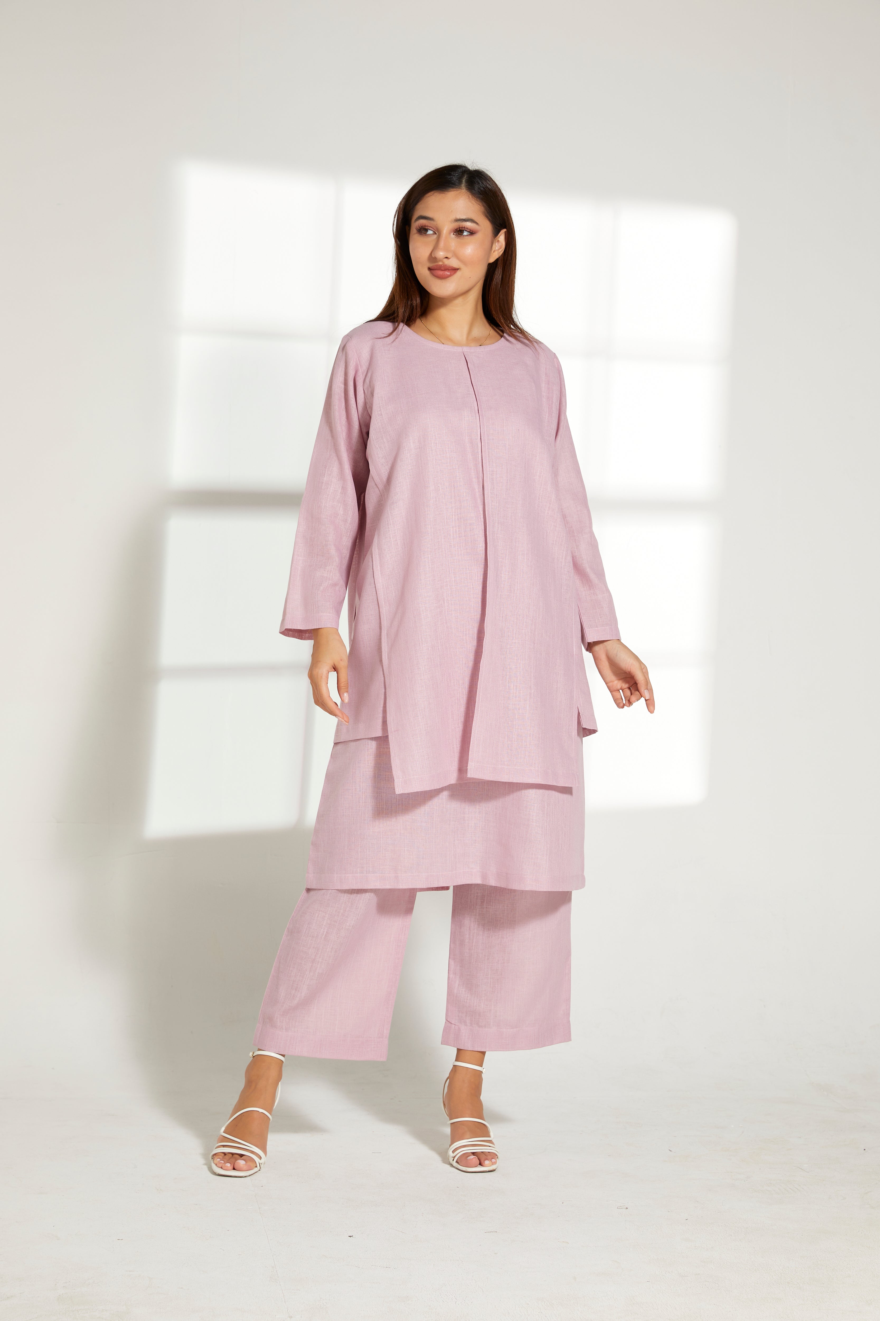 MOiSTREET طقم قميص وبنطال من قماش الكتان الوردي