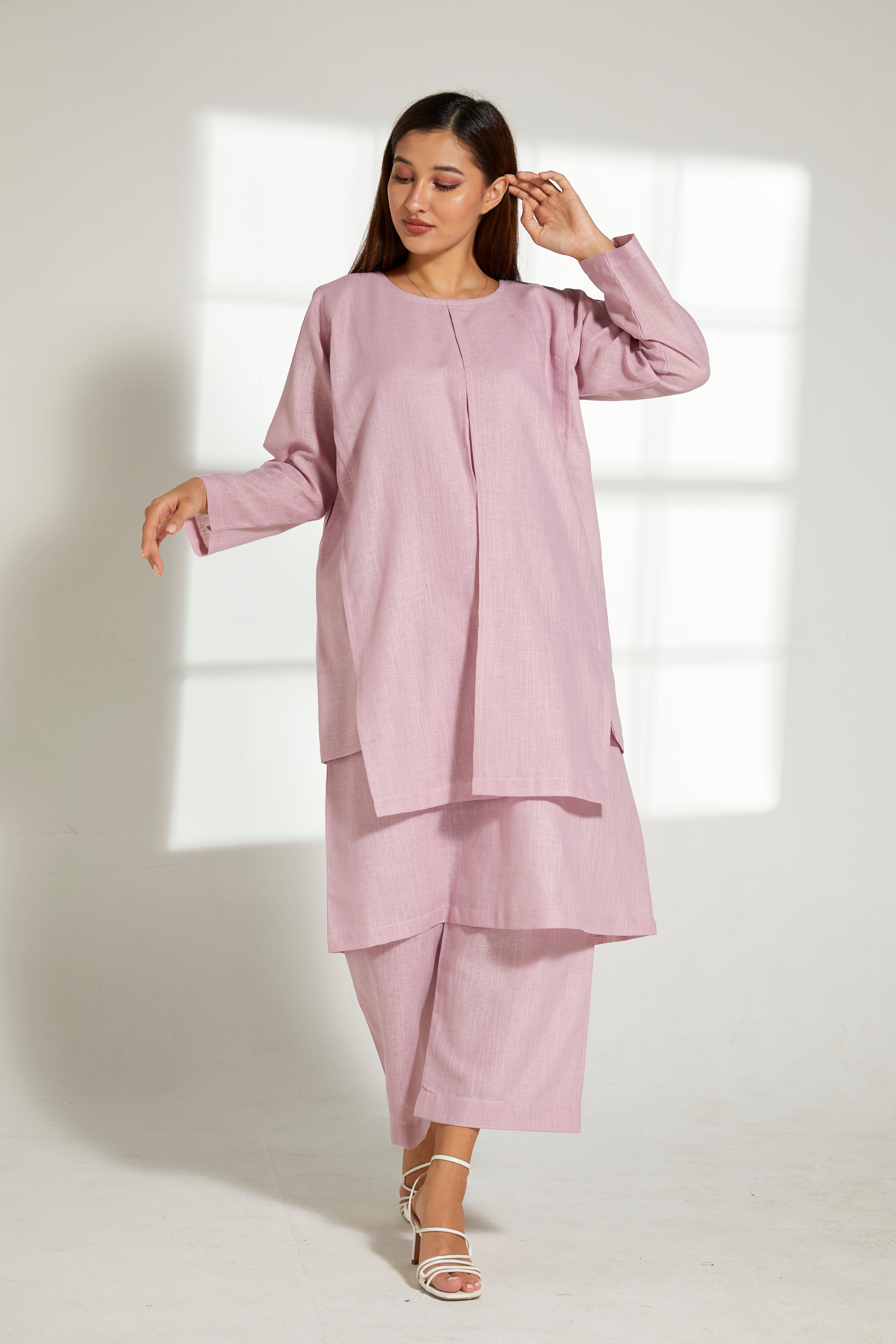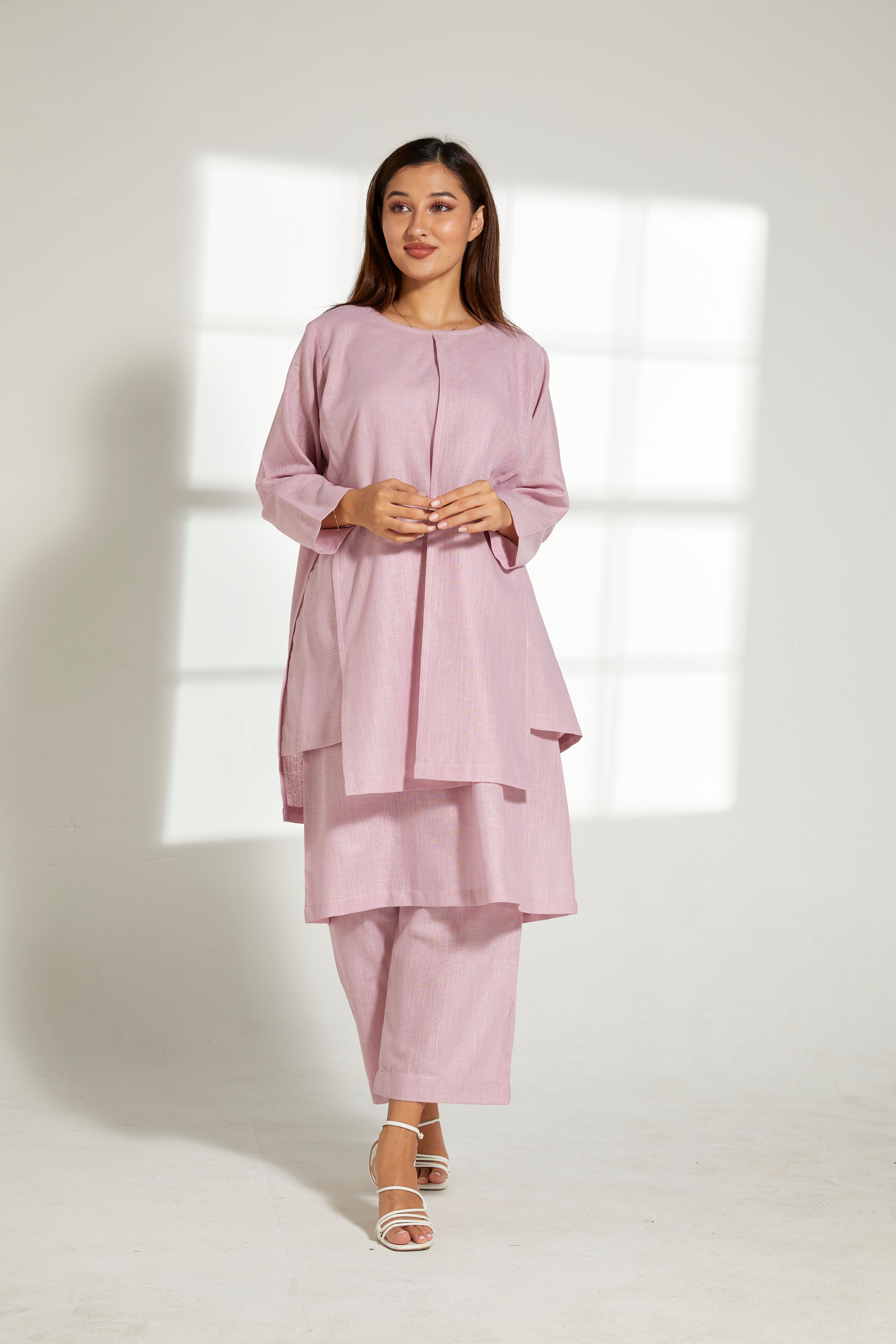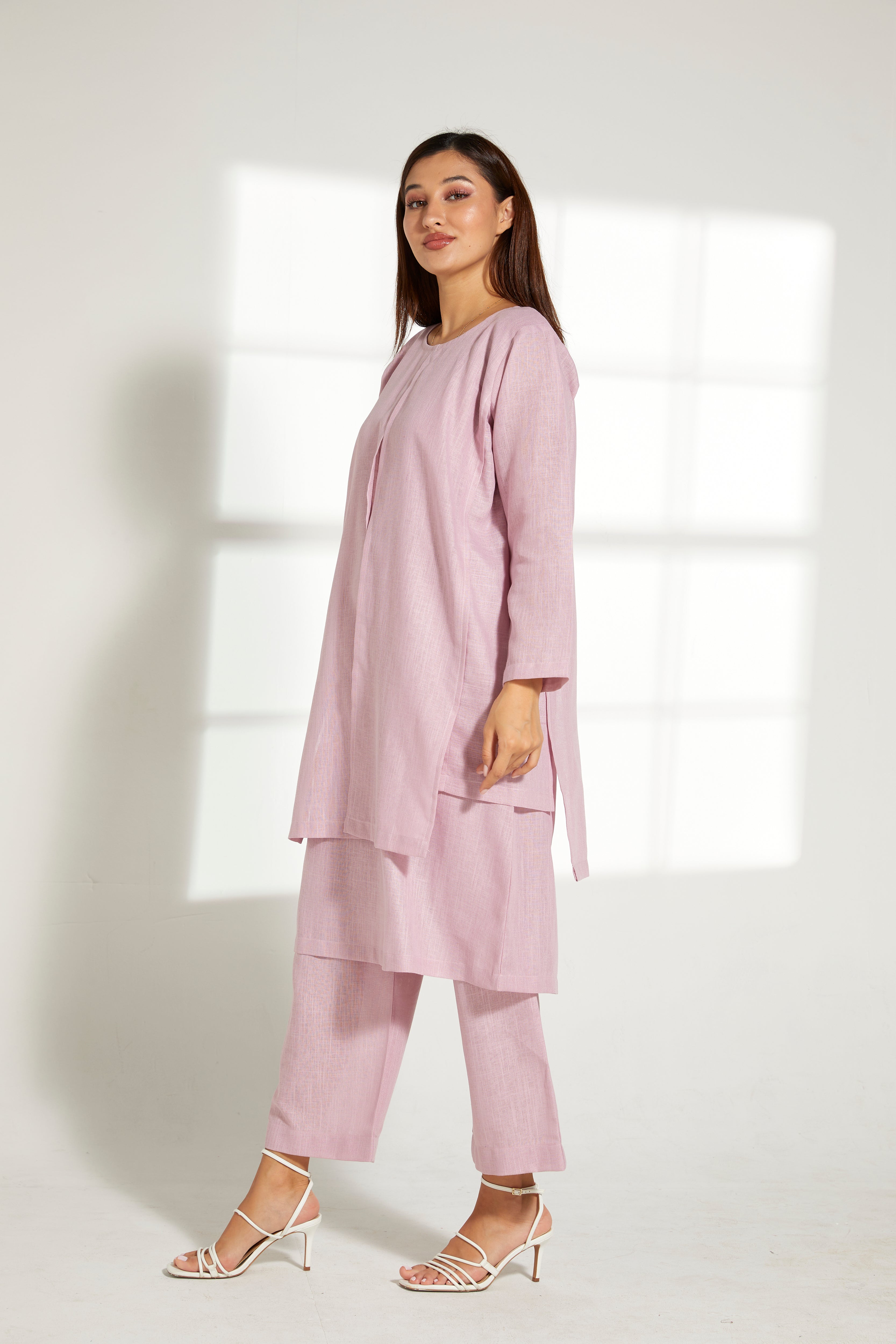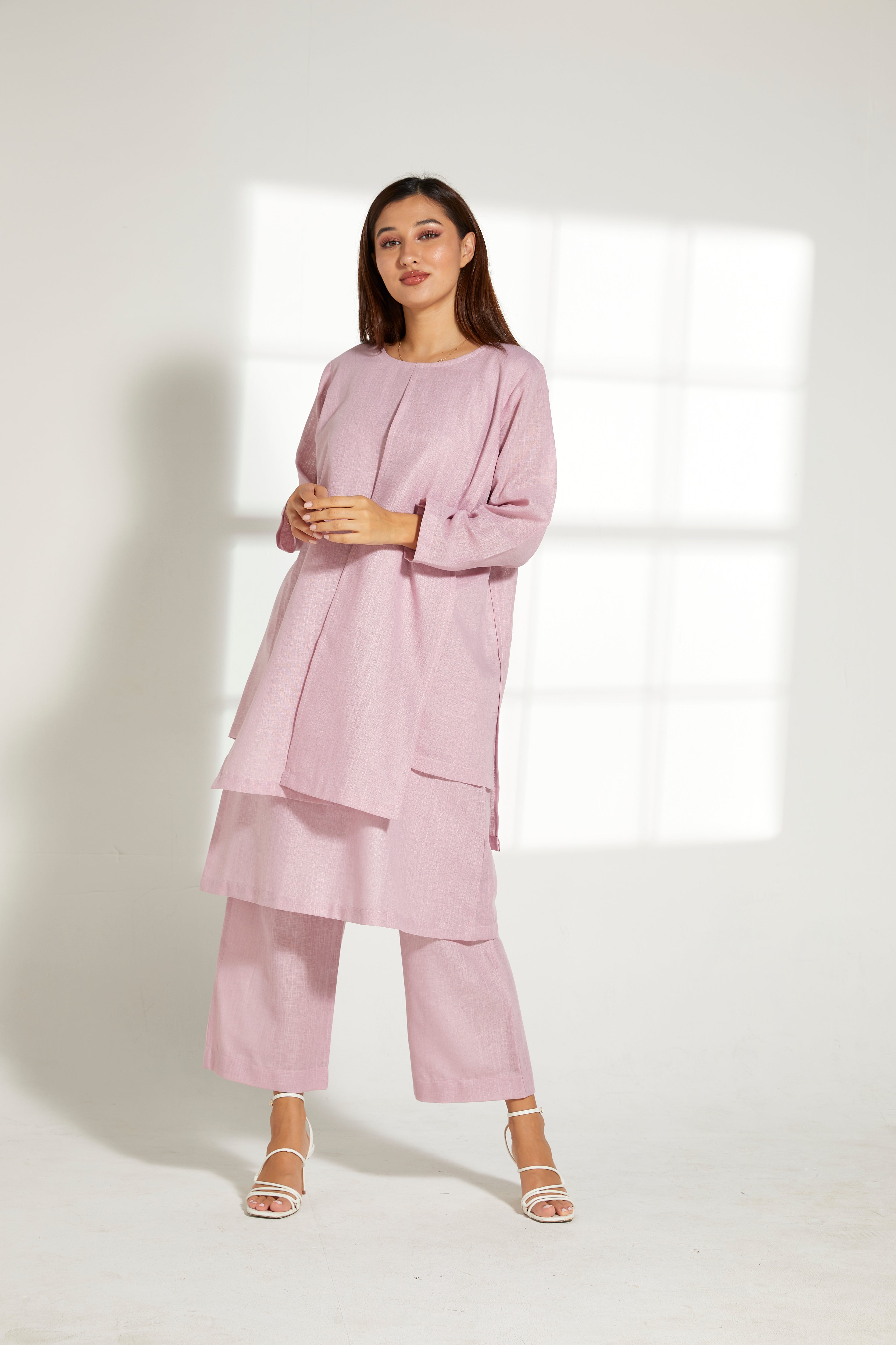 MOiSTREET طقم قميص وبنطال من قماش الكتان الوردي