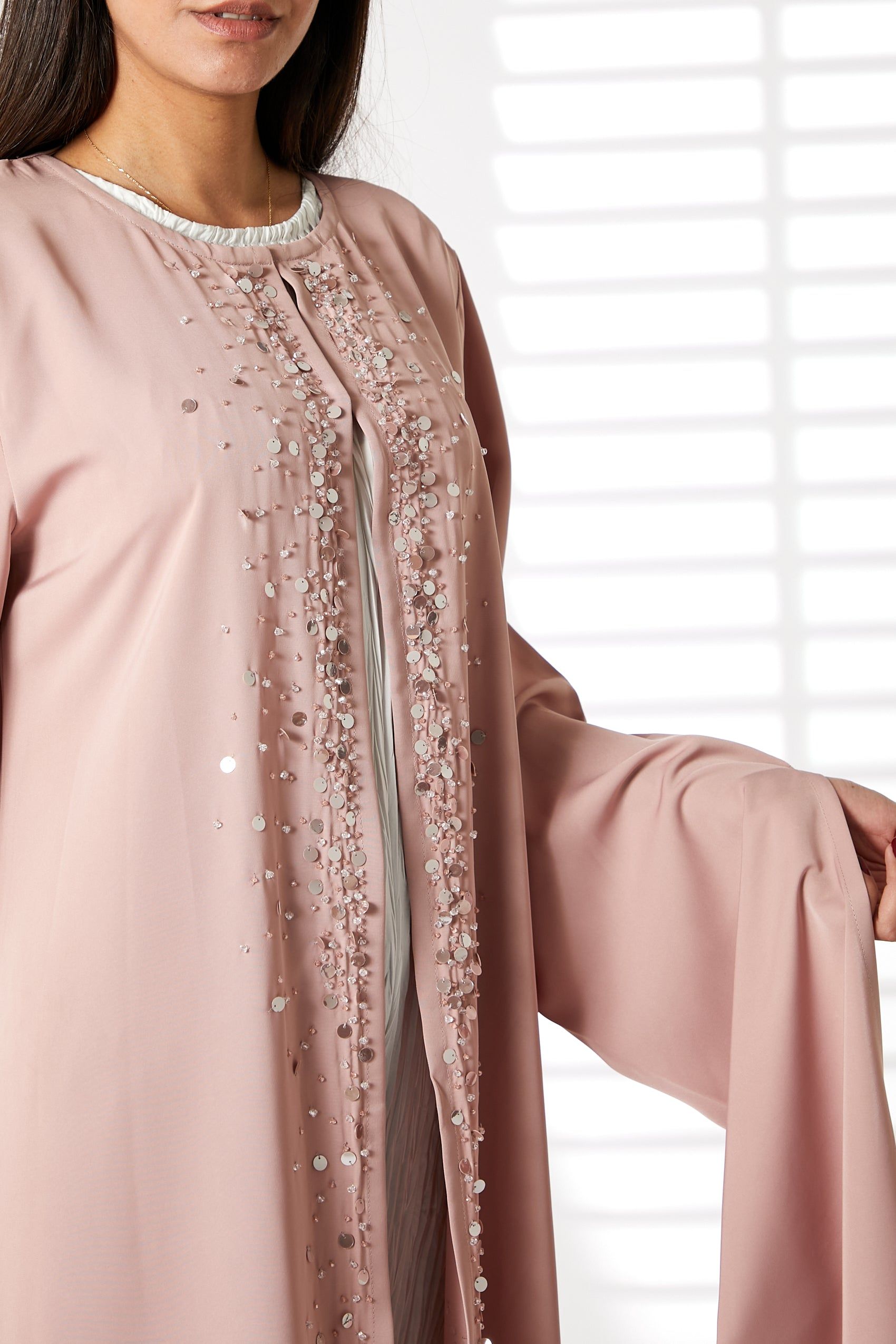MOiSTREET بينك رقبة مستديرة نيدا أكمام مقسمة مطرزة عباية