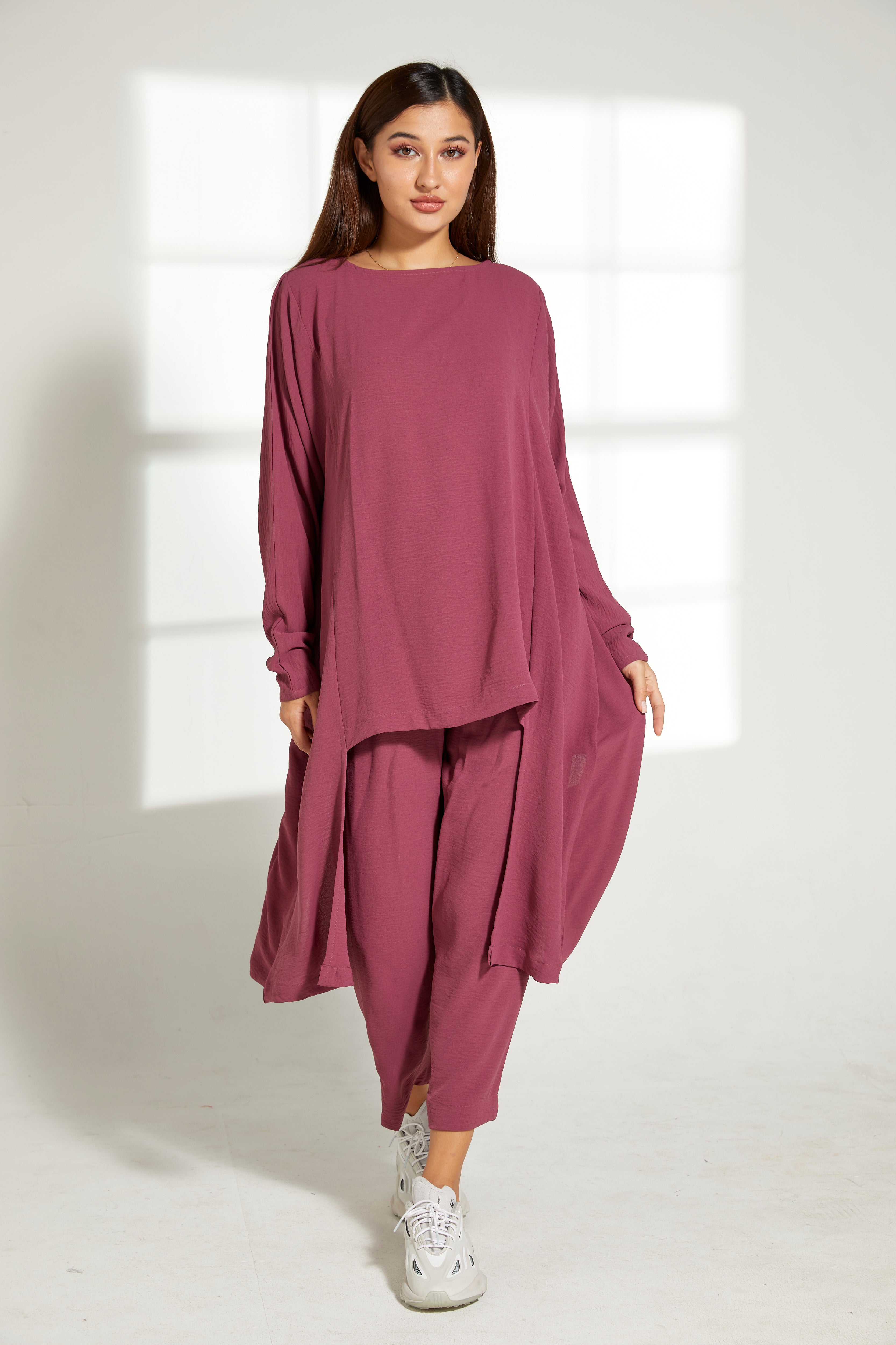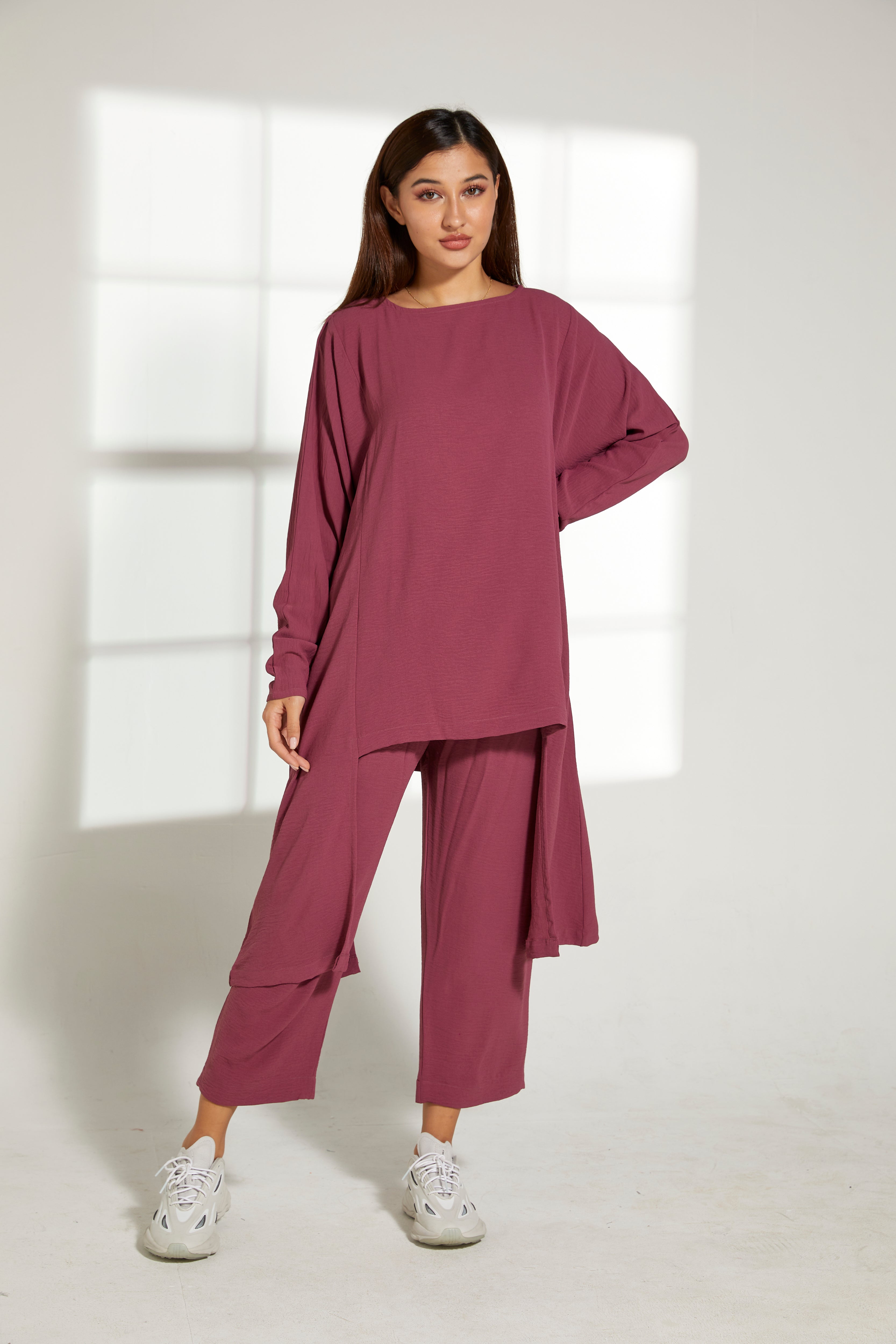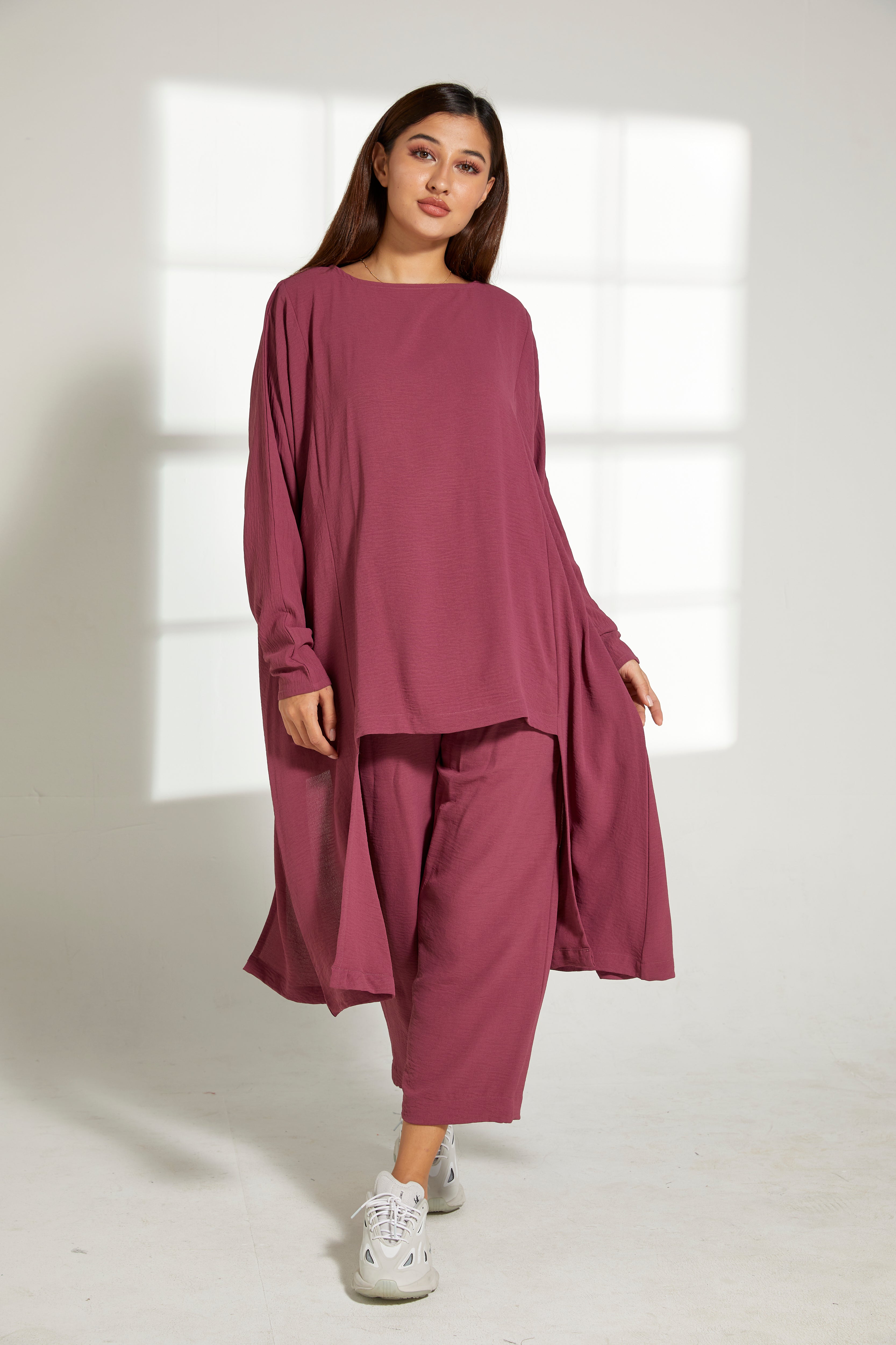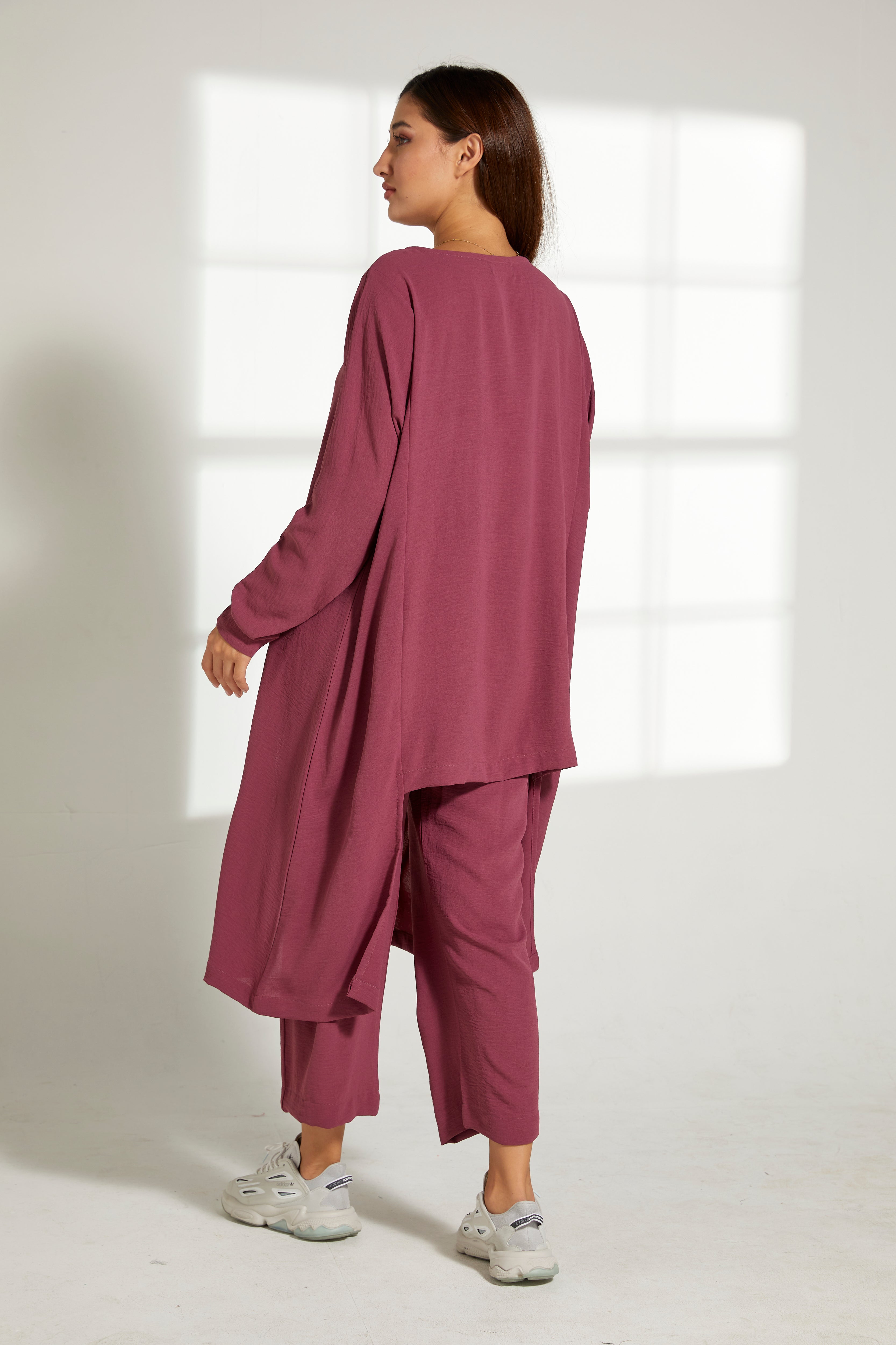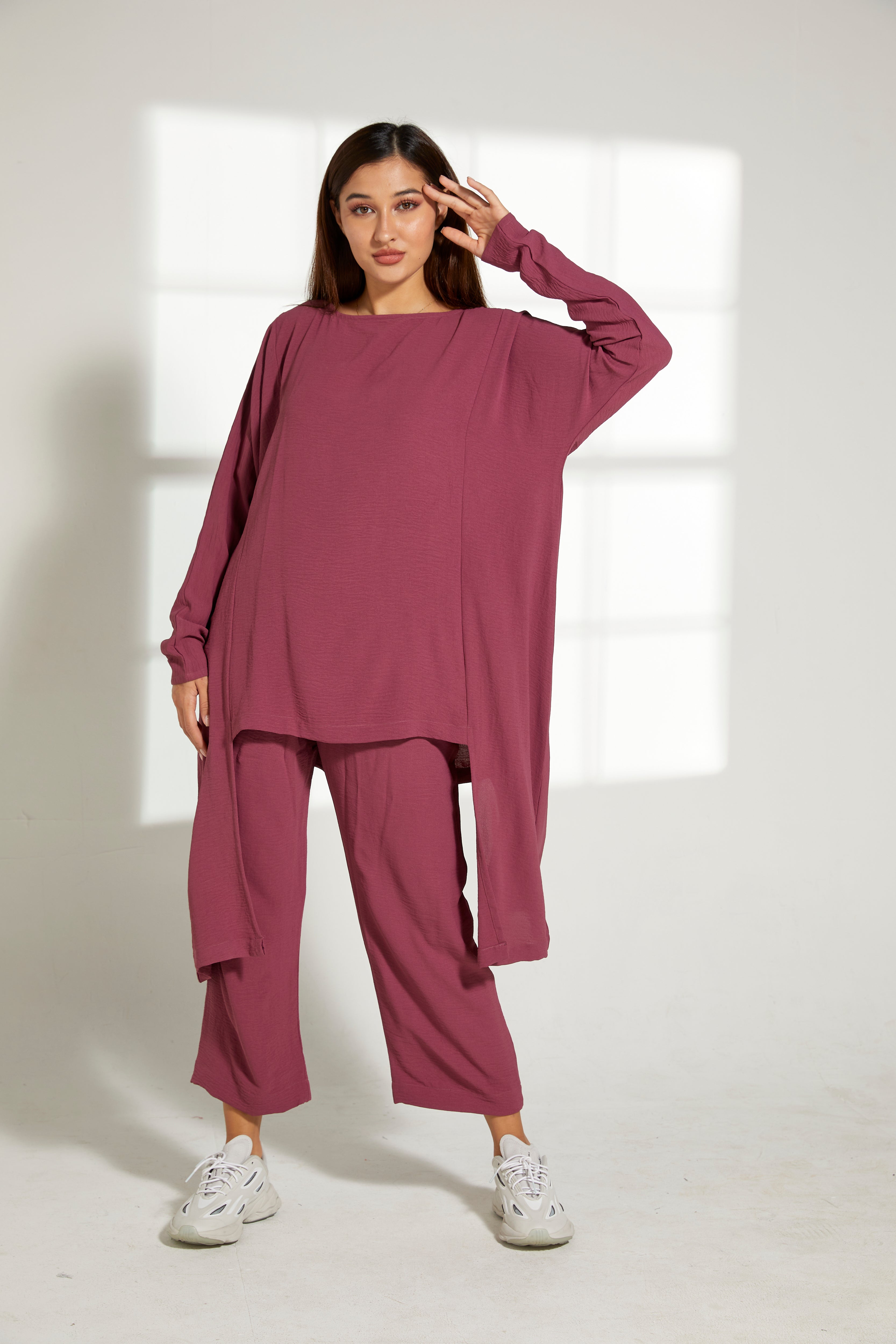 MOiSTREET مجموعة قميص وبنطال من قماش CEY باللون العنابي