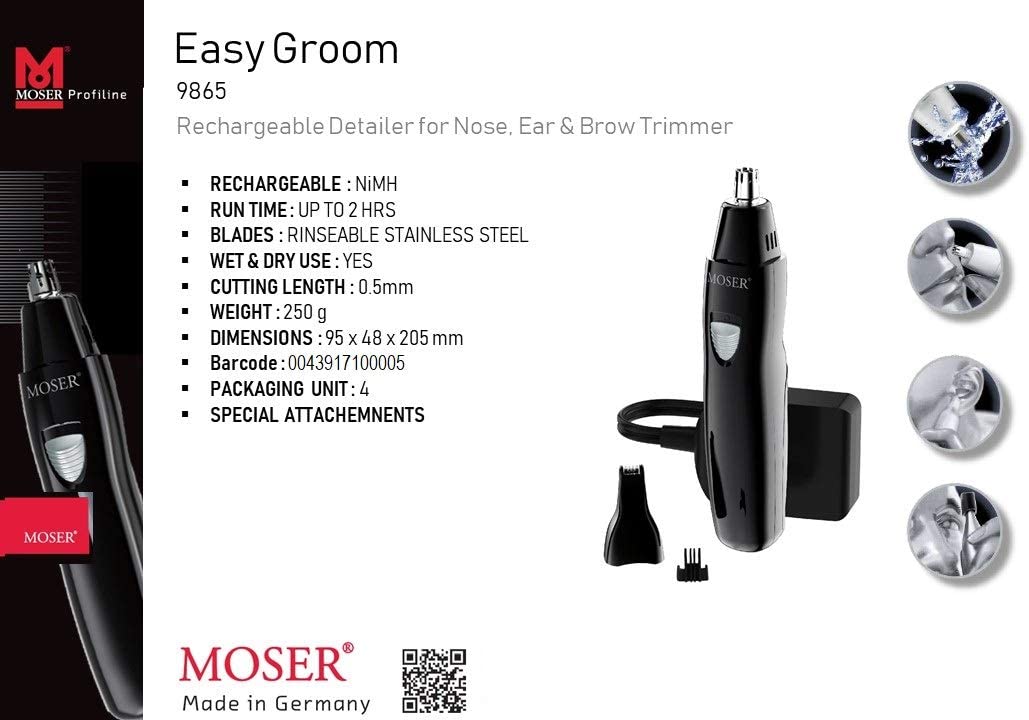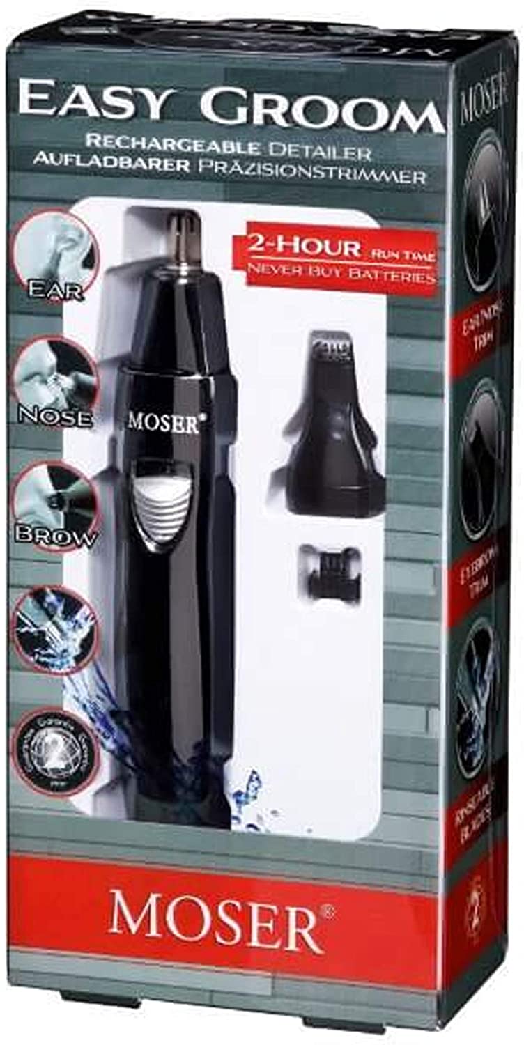 ال القابلة لإعادة الشحن الدقيقة للأنف والأذنين والحواجب للأنف والأذنين والحواجب Moser Easy Groom تتضمن ملحقين قابلين للتبديل. تزيل الرأس الدقيقة بطول قص 0.5 مم الشعر غير المرغوب فيه من الأذنين والحواجب والسوالف بسهولة وفعالية ودون ألم.