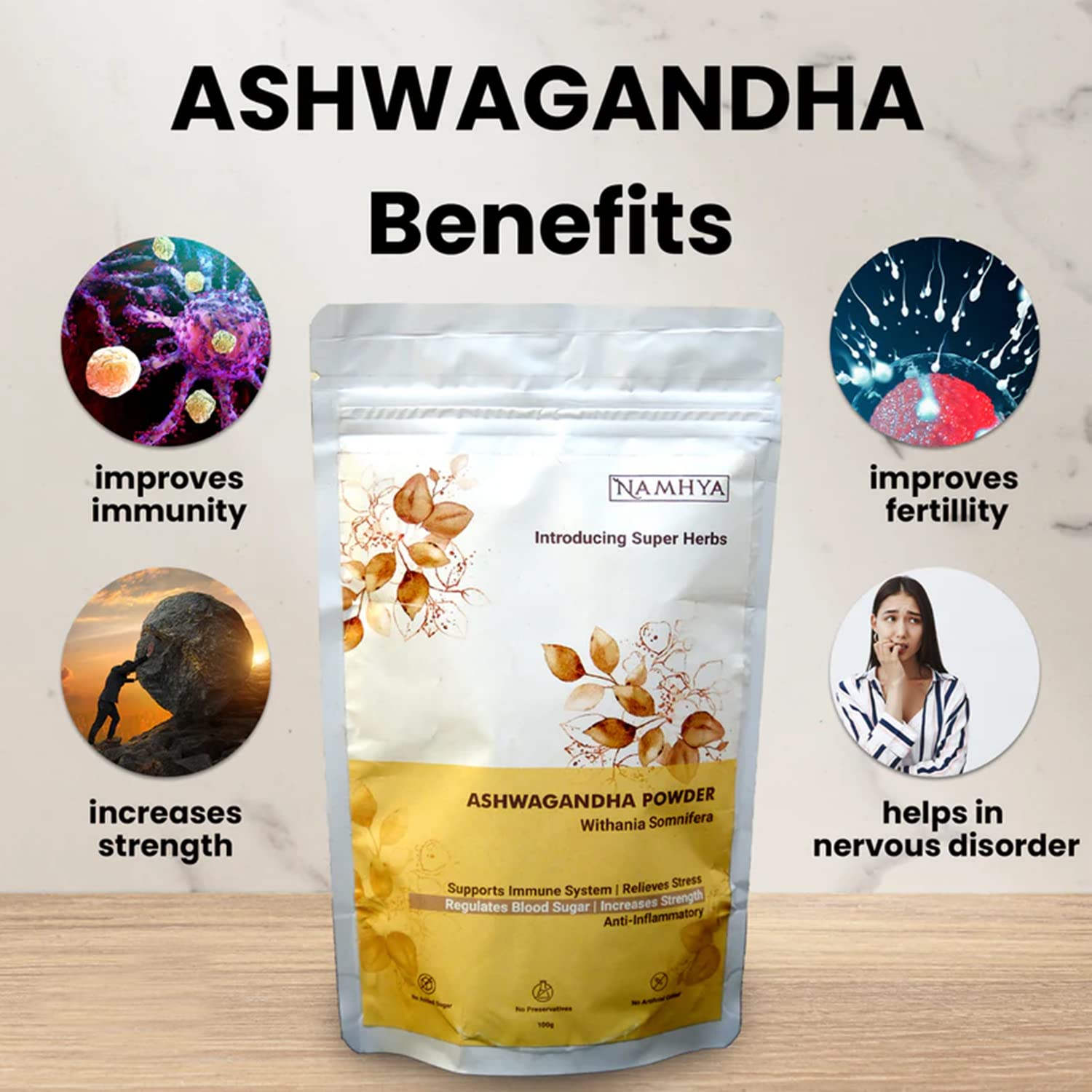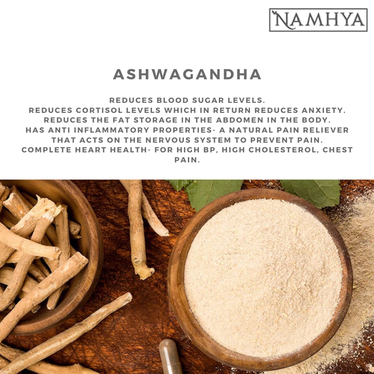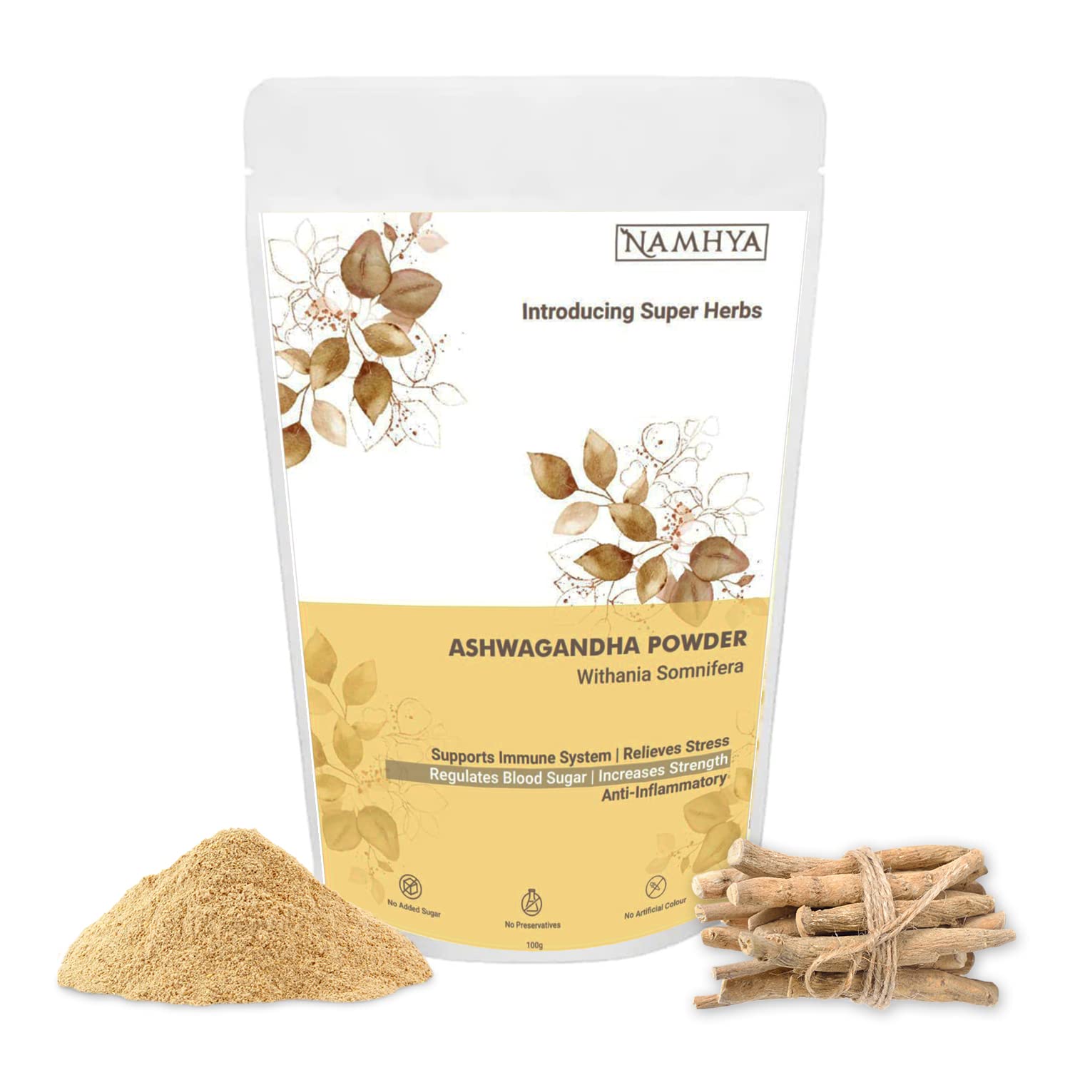 Namhya Ashwagandha Powder is a 100% natural Ayurvedic supplement made from the root of the Withania somnifera plant. Traditionally used in Ayurveda as a Rasayana (rejuvenator), Ashwagandha is known for its adaptogenic properties that help manage stress, boost energy, and support hormonal balance.