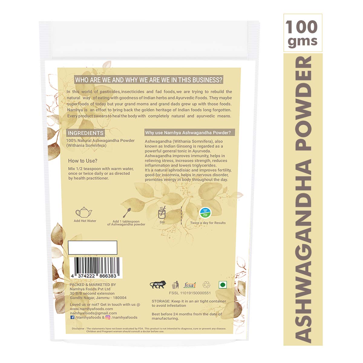 Mix 1 teaspoon (approx. 3–5 grams) of Ashwagandha powder with warm water, milk, or a smoothie. Best taken on an empty stomach or before bedtime.