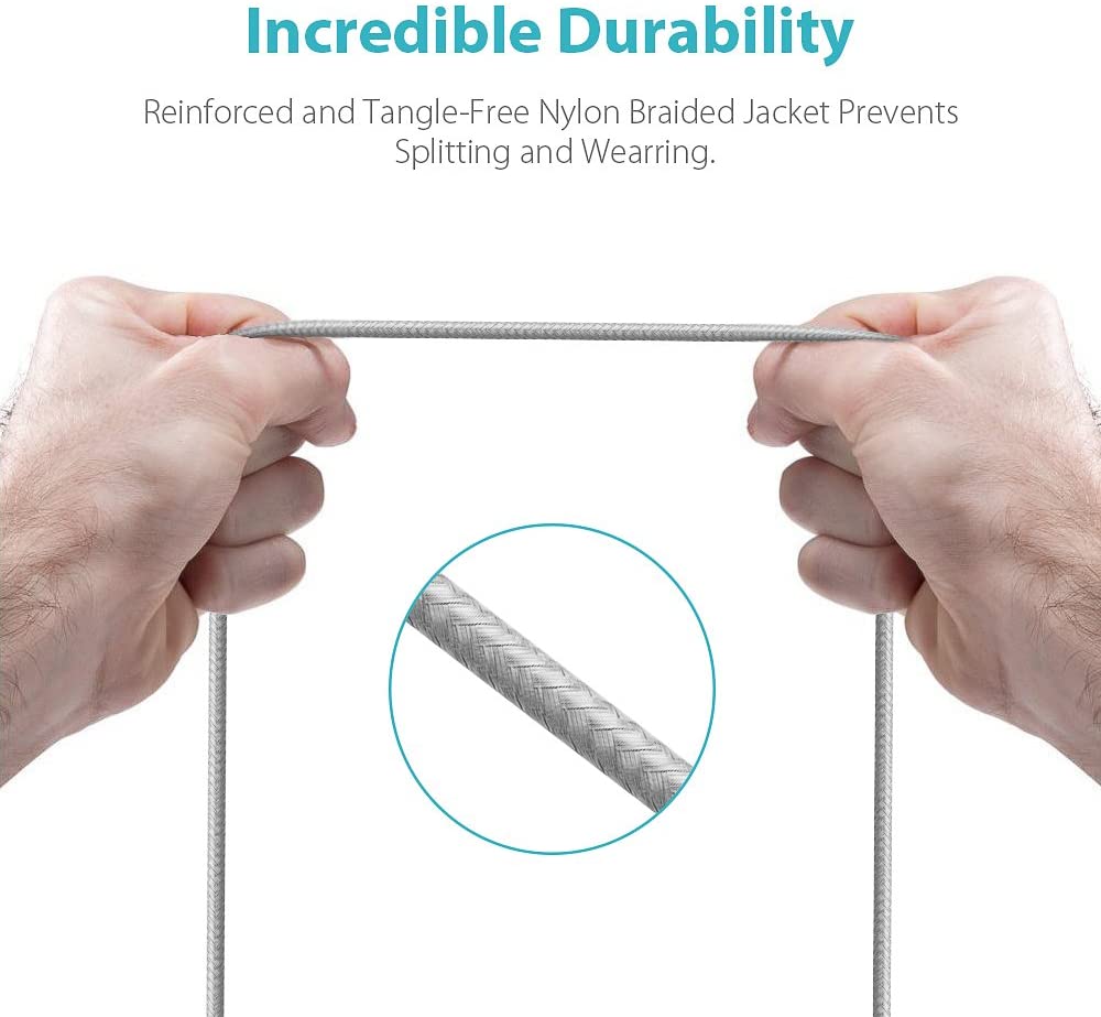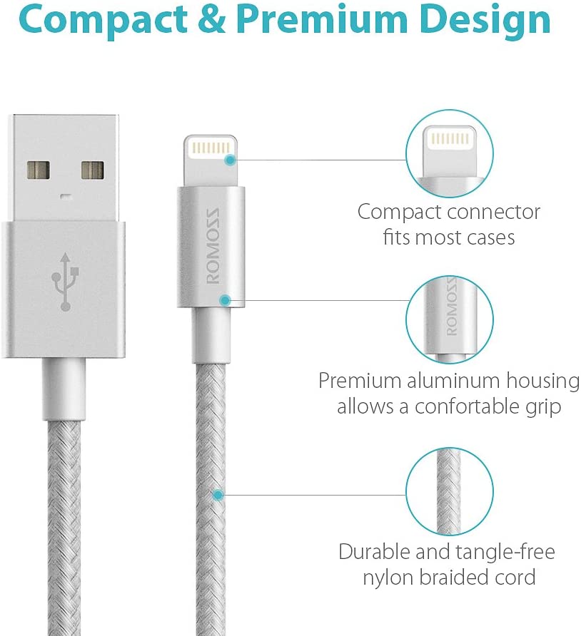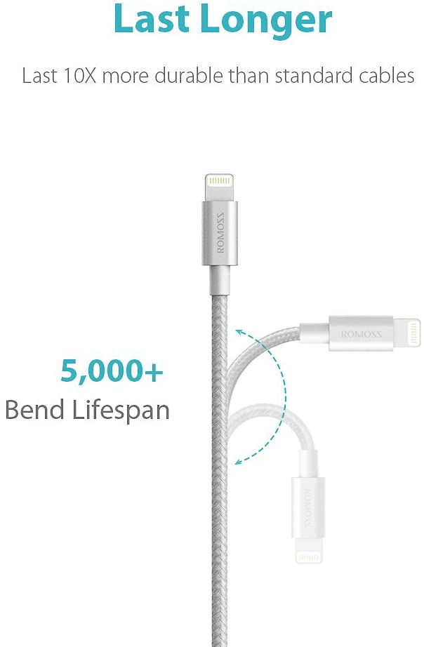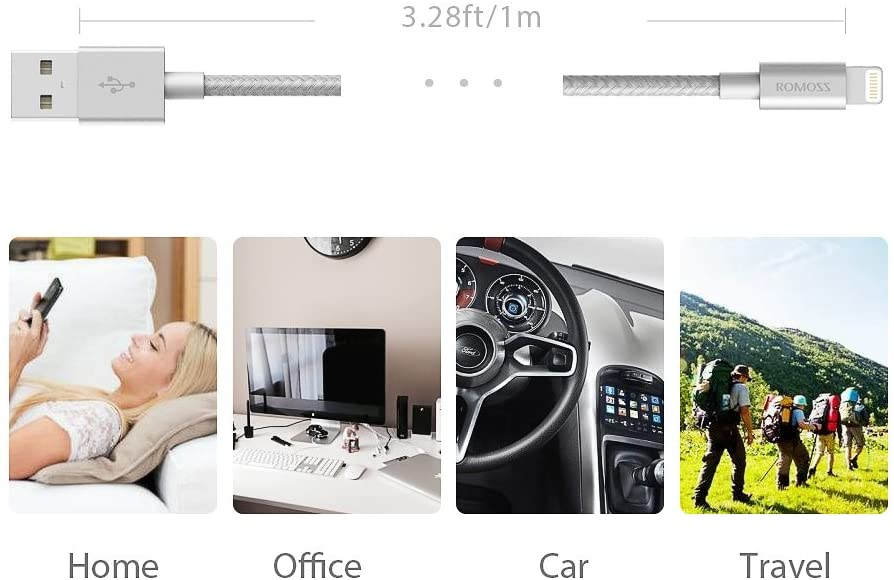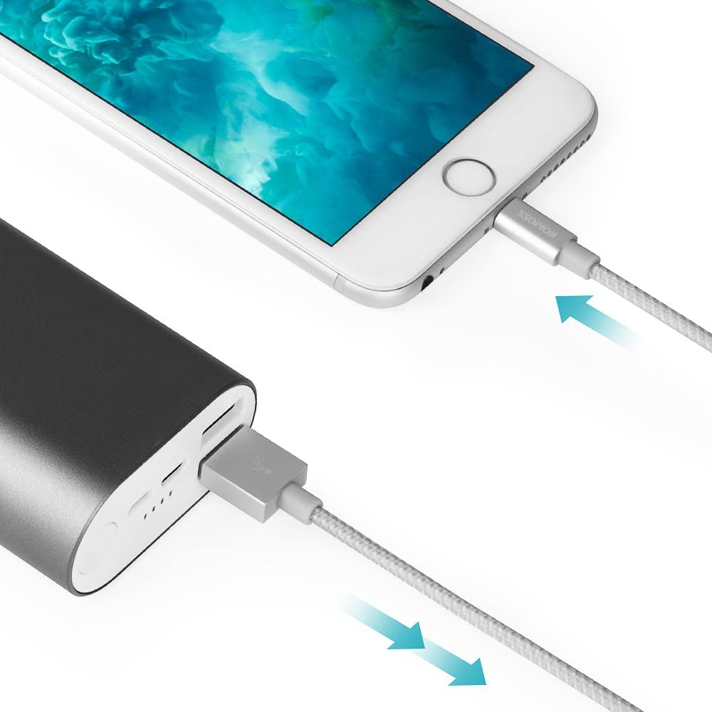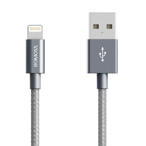 كابل Lightning معتمد من Apple MFi من ROMOSS، كابل ROMOSS 3.28 قدم (1 متر) من النايلون المضفر Lightning إلى USB للمزامنة والشحن لأجهزة iPhone 7/7 Plus و6s/6s Plus و6/6 Plus وiPad Pro/Air 2 وiPad Mini 4/3/2 - 1 متر رمادي