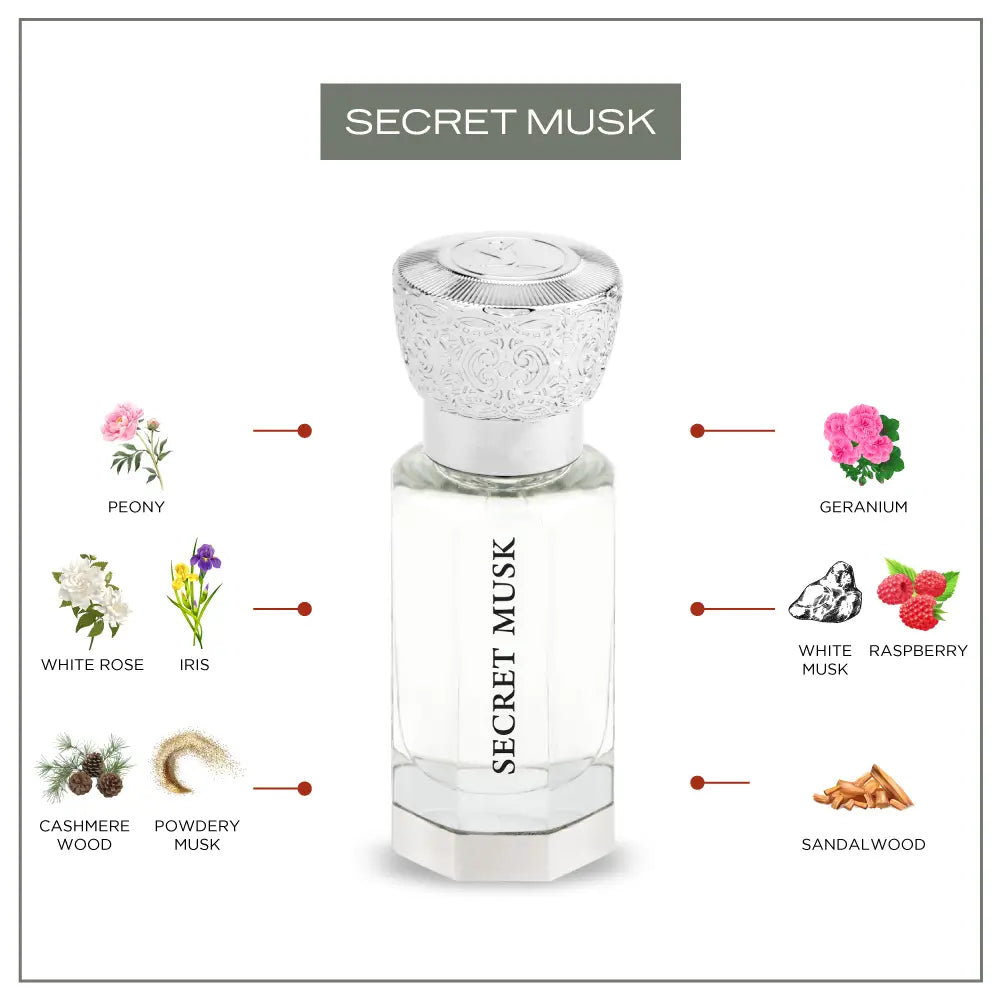 تم مزجه بعناية لالتقاط اللحظات التي ستعتز بها. هذه هي الجواهر التي لا تقدر بثمن والتي ستبقى إلى الأبد في قلبك وفي أعماق روحك. تم صنع Secret Musk من أزهار ثمينة، كما لو كنت تمشي على بحر من البتلات. في هذه الليلة السحرية، تزداد جمالك بفضل الورود البيضاء والسوسن والمسك الأبيض. تعكس النكهة الرقيقة للتوت أحمر خدودك بينما تستمتعين برائحة الكشمير الدافئ وخشب الصندل الناعم والمسك المخملي. يأتي Secret Musk في زجاجة رولر بول سعة 12 مل لسهولة الاستخدام. إنه عطر للجنسين ويمكن ارتداؤه طوال العام. شغف يروي في رائحة.