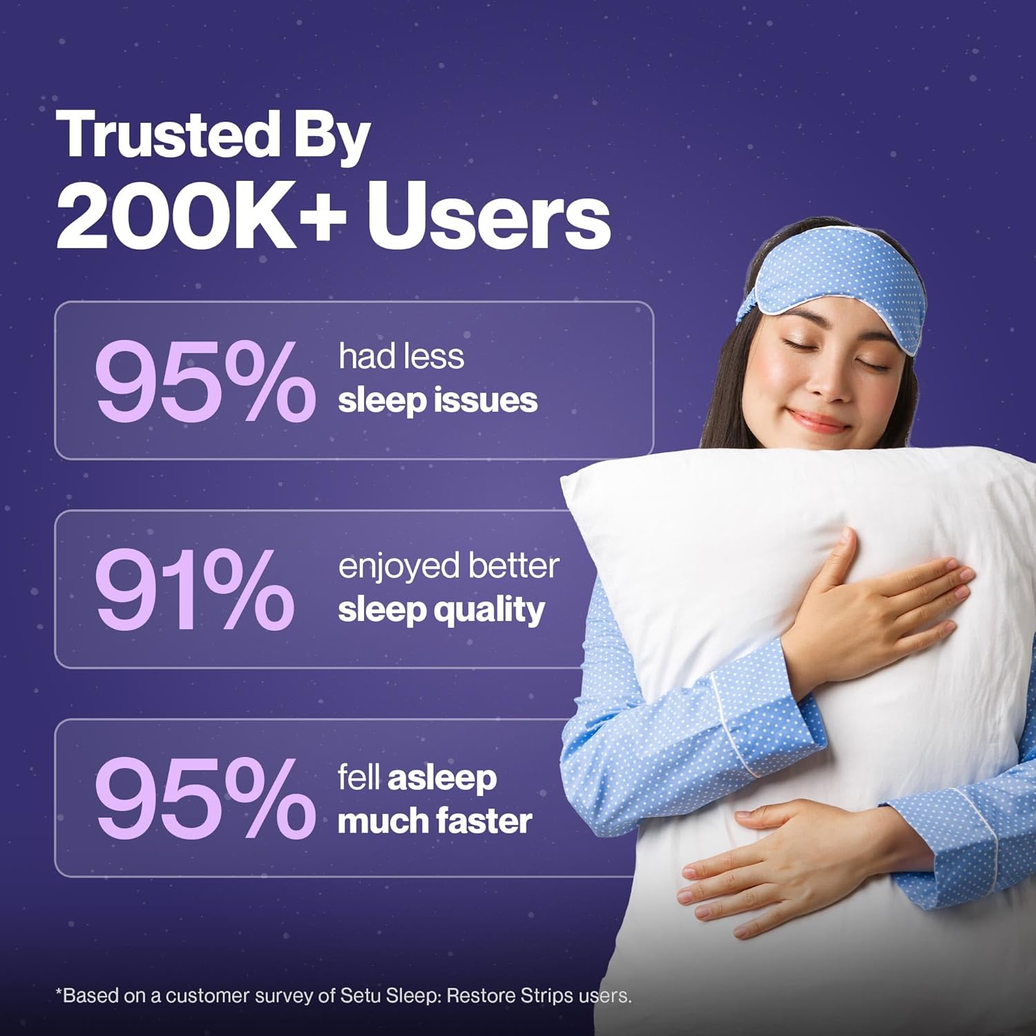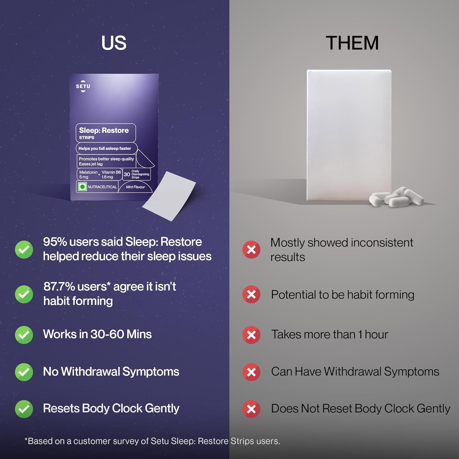 Setu Sleep Restore Strips هي شرائط سريعة المفعول بنكهة النعناع قابلة للذوبان في الفم، توفر كل منها 5 ملغ من الميلاتونين في شكل ملائم لا يحتاج إلى ماء — مصممة لتوفير دعم سريع وفعال للنوم.