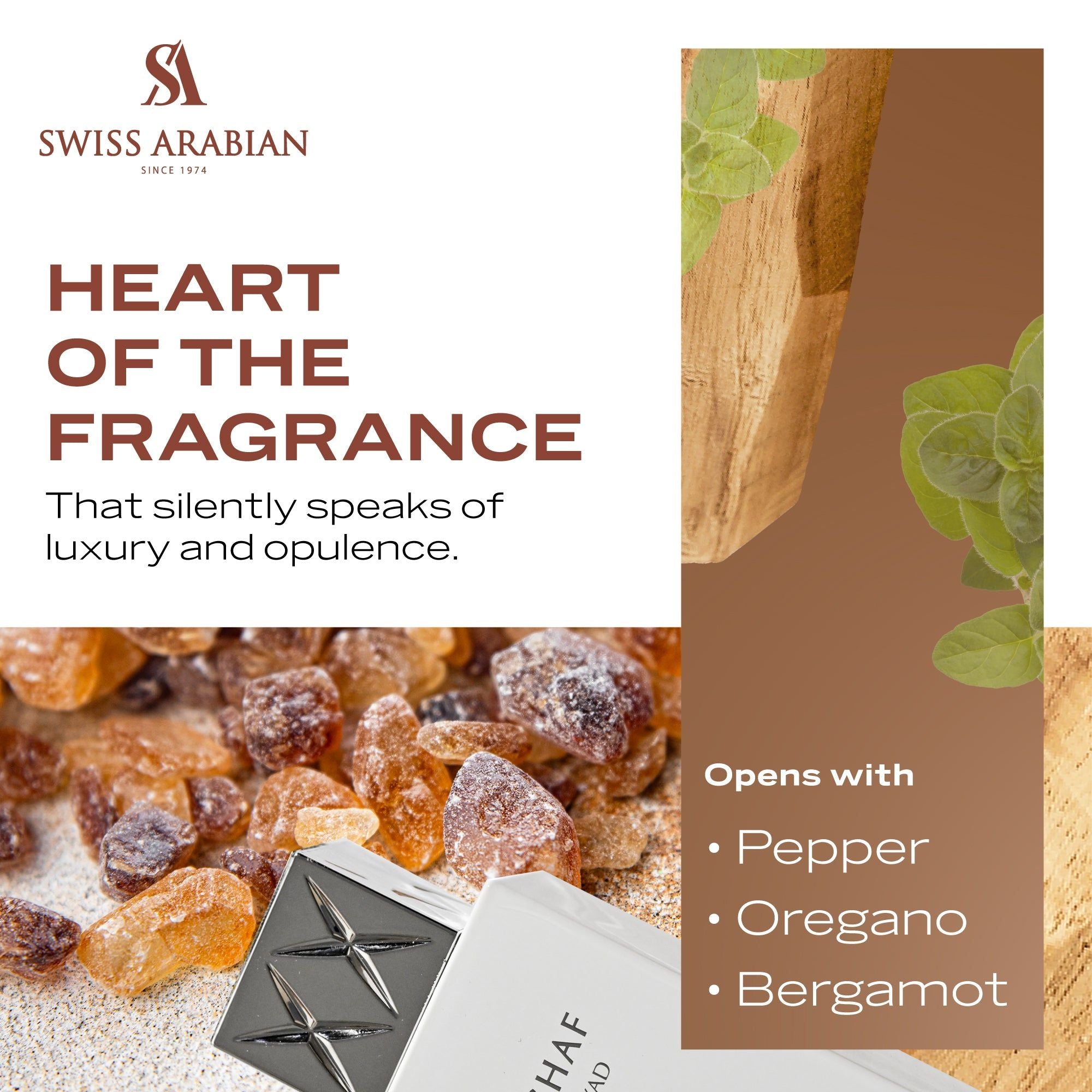 إنه عطر بلسمي حار يجسد العاطفة والفضيلة. يبدأ العطر بمكونات عليا من الفلفل الحار والبرغموت المنعش والأوريغانو الطازج. هذا البداية المنعشة تقود إلى قلب العطر الغني بالراتنج. مع البخور المدخن والعنبر الحريري ونفحات الأزهار الجلدية من اللابدانوم، تقودك رحلتك العطرية برفق إلى خاتمة عميقة وطويلة الأمد بفضل المير الثمين. هذا هو الأثر الذي تتركه وراءك: مزيج مغري من خشب الصندل والباتشولي الترابي والجلد، تعلوه تاج ذهبي من العود العزيز. شغاف عود أبيض هو عطر للجنسين من Swiss Arabian. إنه مثالي للليالي الباردة. هذه هي اللحظة. هذا هو العاطفة. هذا هو العطر.